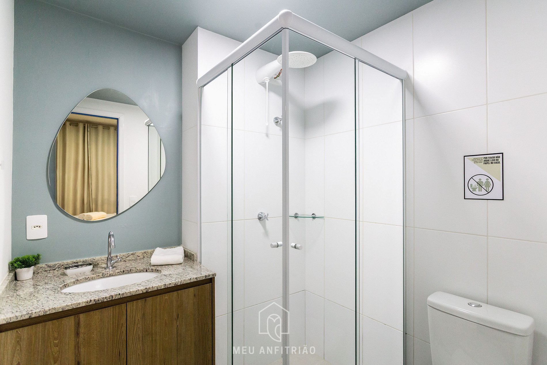 - Banheiro com chuveiro elétrico e secador de cabelos.