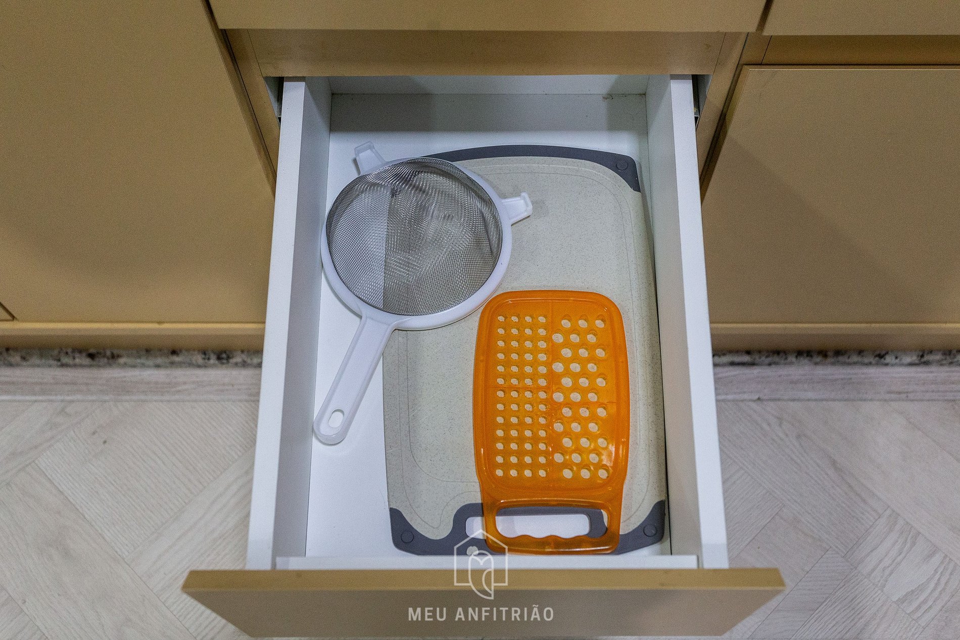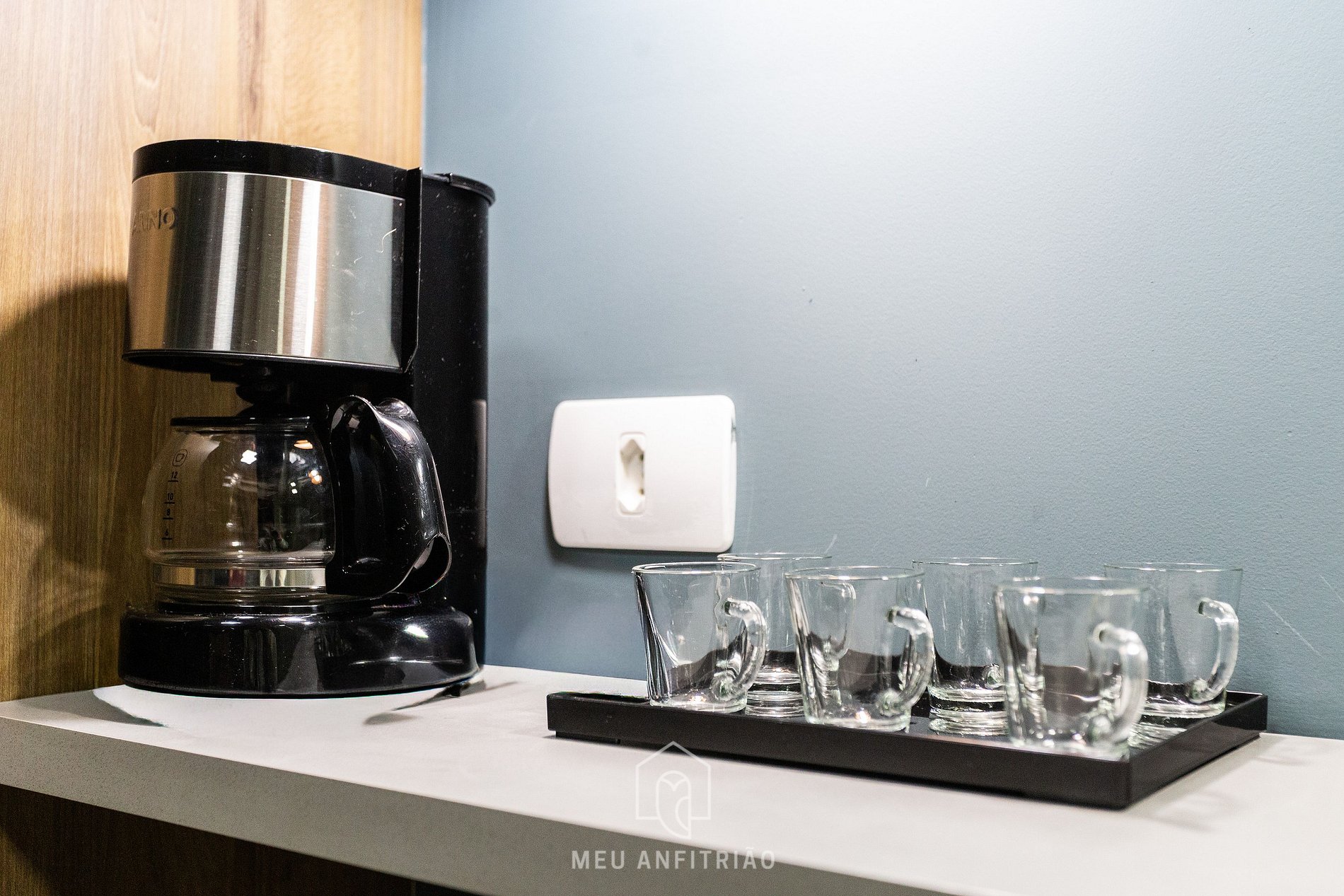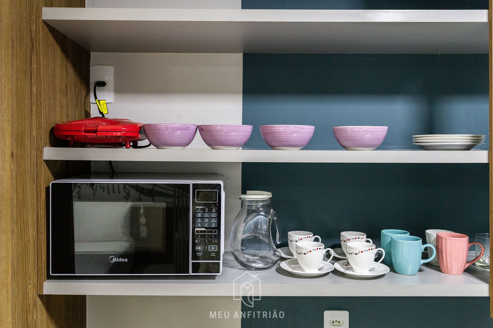- Cozinha completa com os utensílios necessários para uma estadia funcional. Contamos com fogão cooktop, geladeira, micro-ondas, cafeteira elétrica, entre outros.