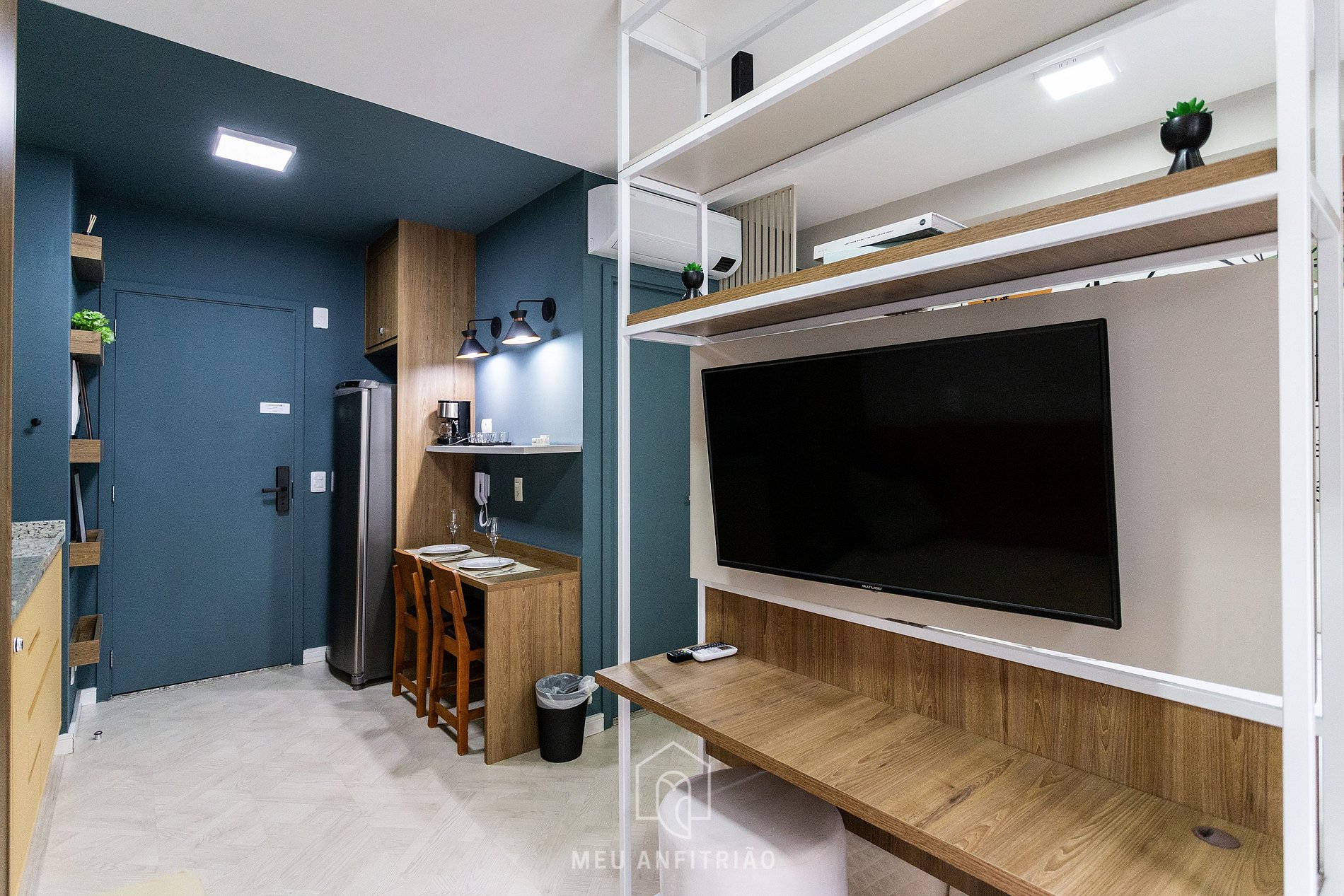 Também contamos com WI-FI de alta velocidade, fechamento por cortinas blackout, ar-condicionado quente e frio e TV Smart giratória que pode ser utilizada no ambiente da sala de estar e no quarto.