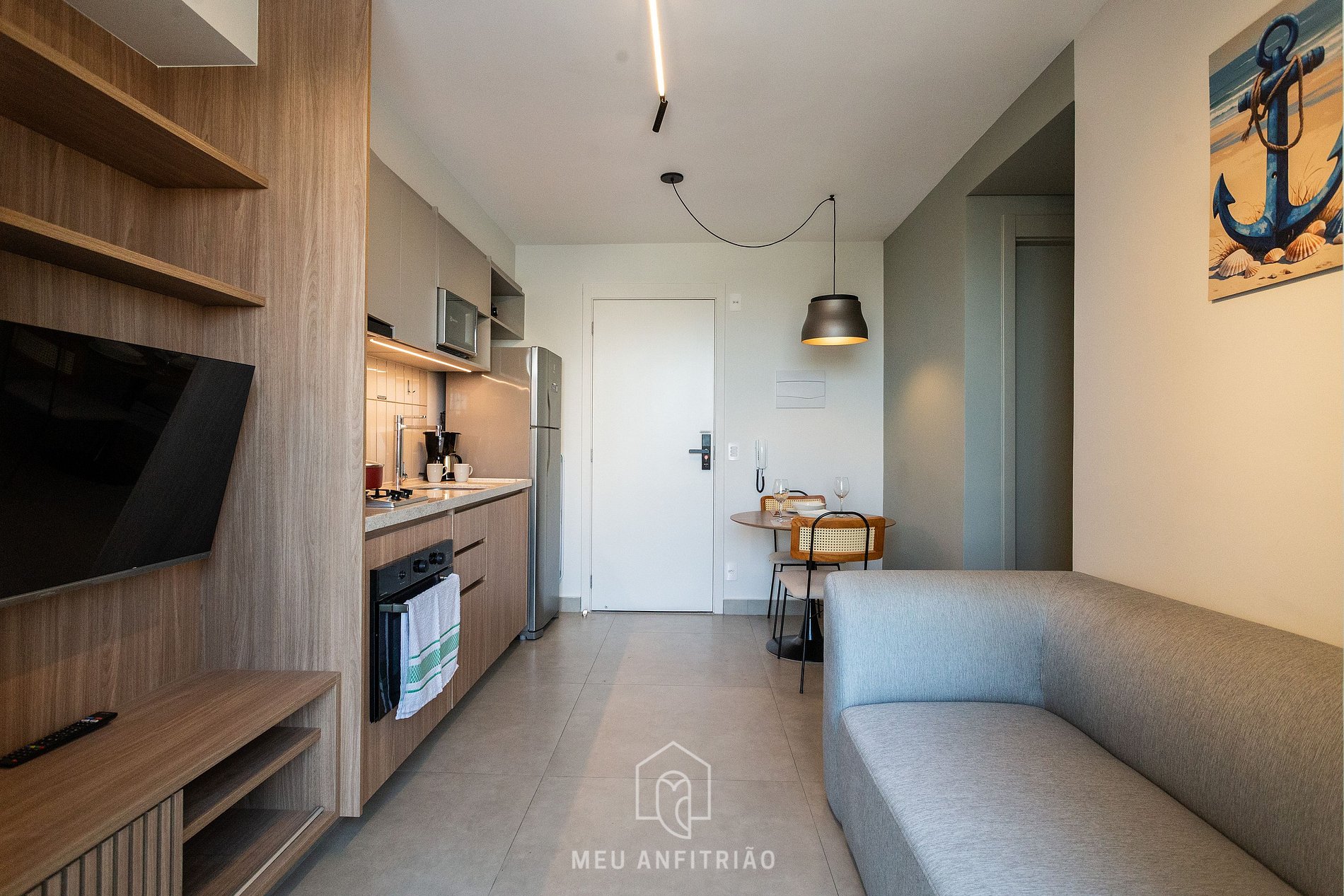 - Na sala temos mesa para refeições, Smart TV, sofá-cama para 2, varanda integrada com máquina de lavar, tanque e ármario.