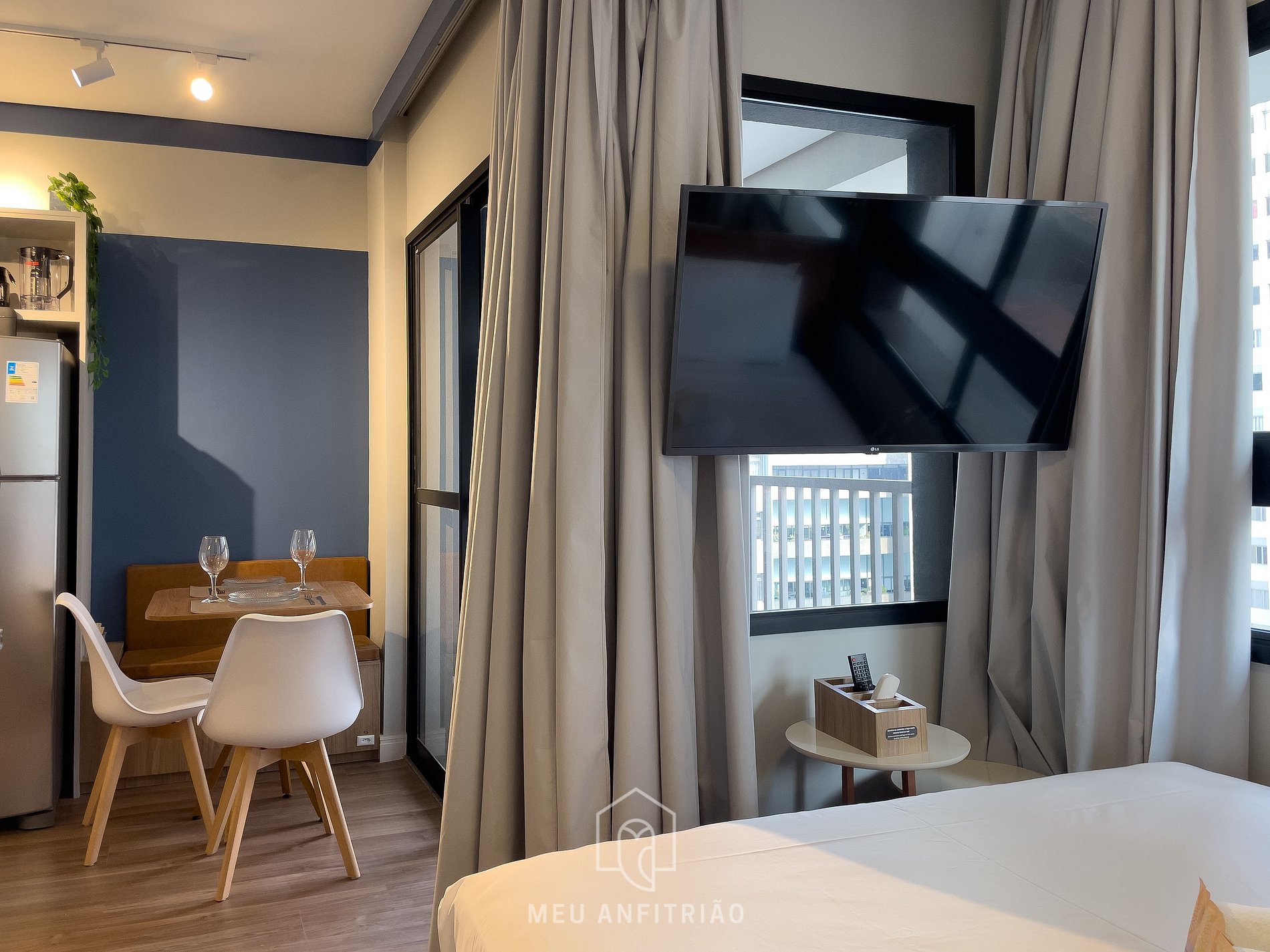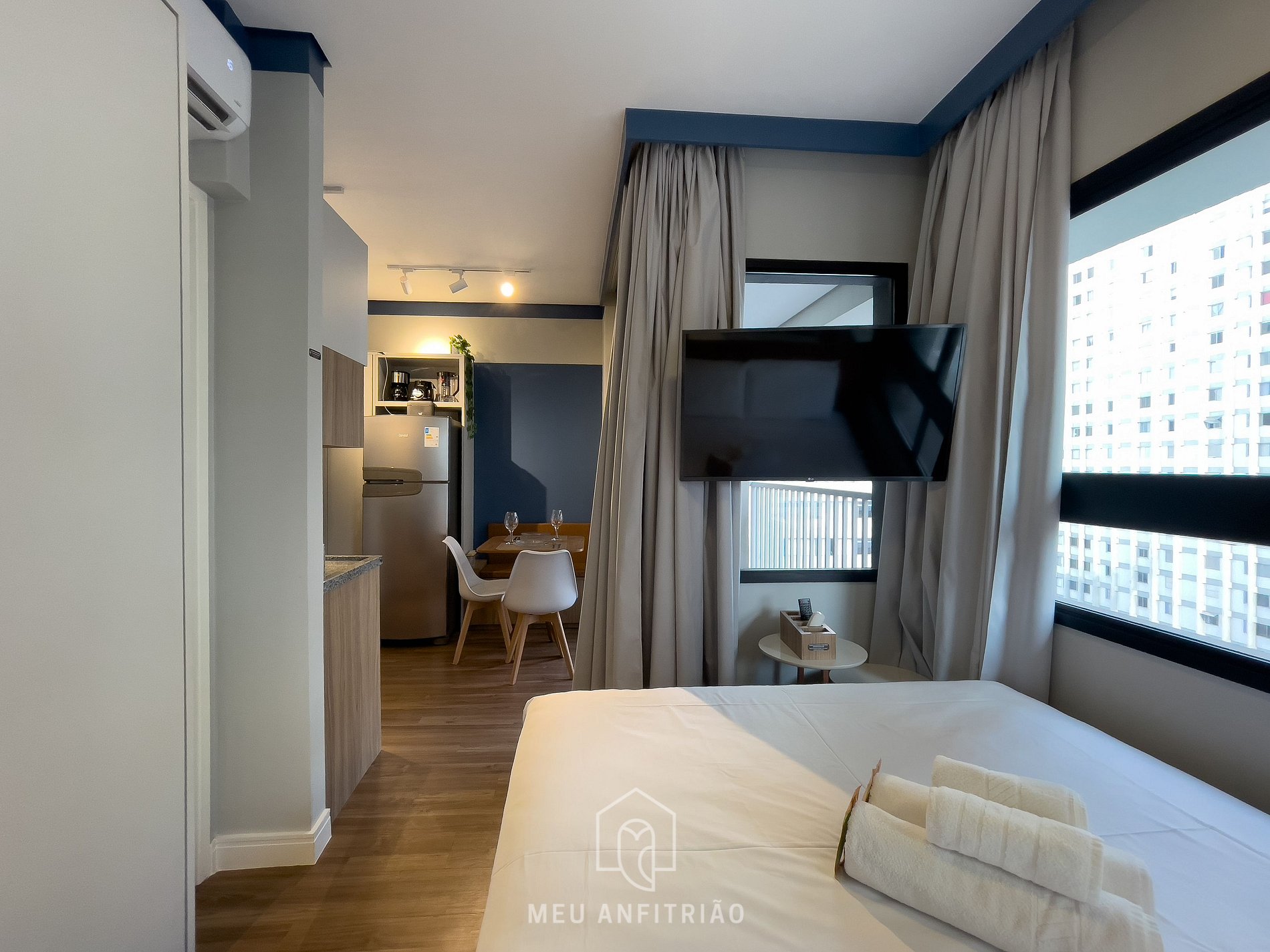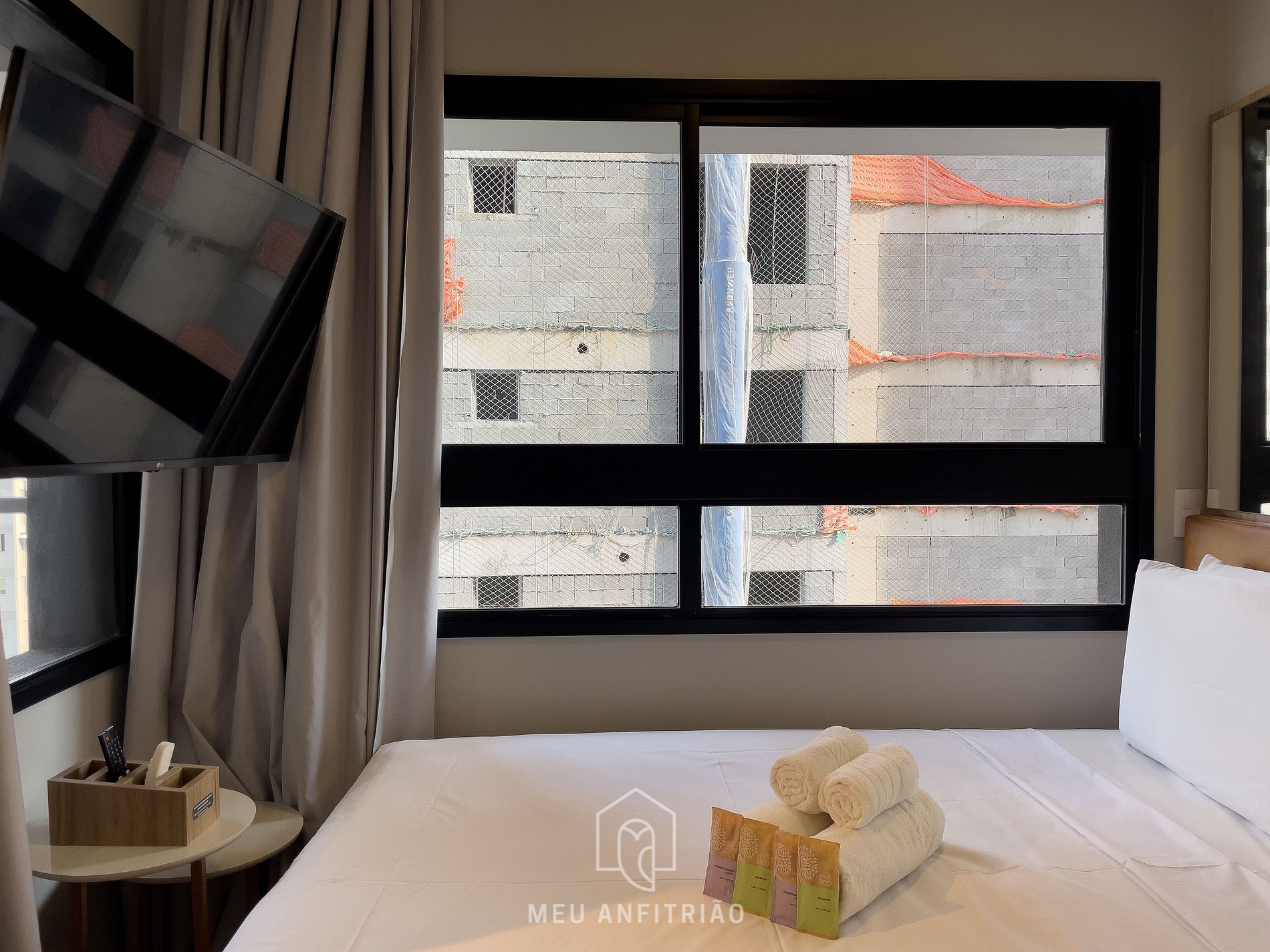 Nosso studio acomoda 2 pessoas confortavelmente em uma cama de casal, em um espaço de aproximadamente 22m². Contamos com área de lazer completa e portaria presencial 24h no condomínio.