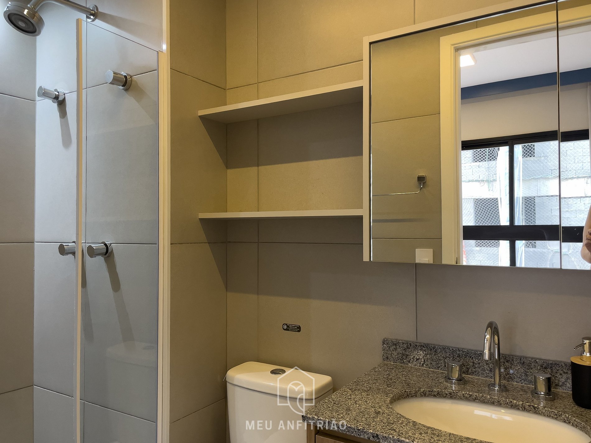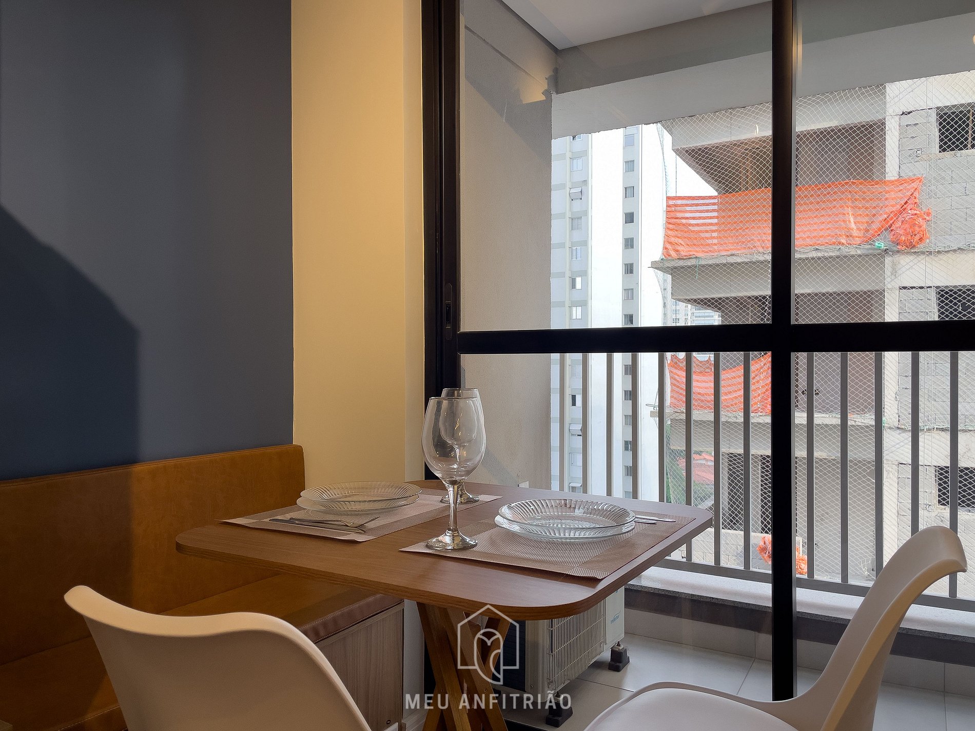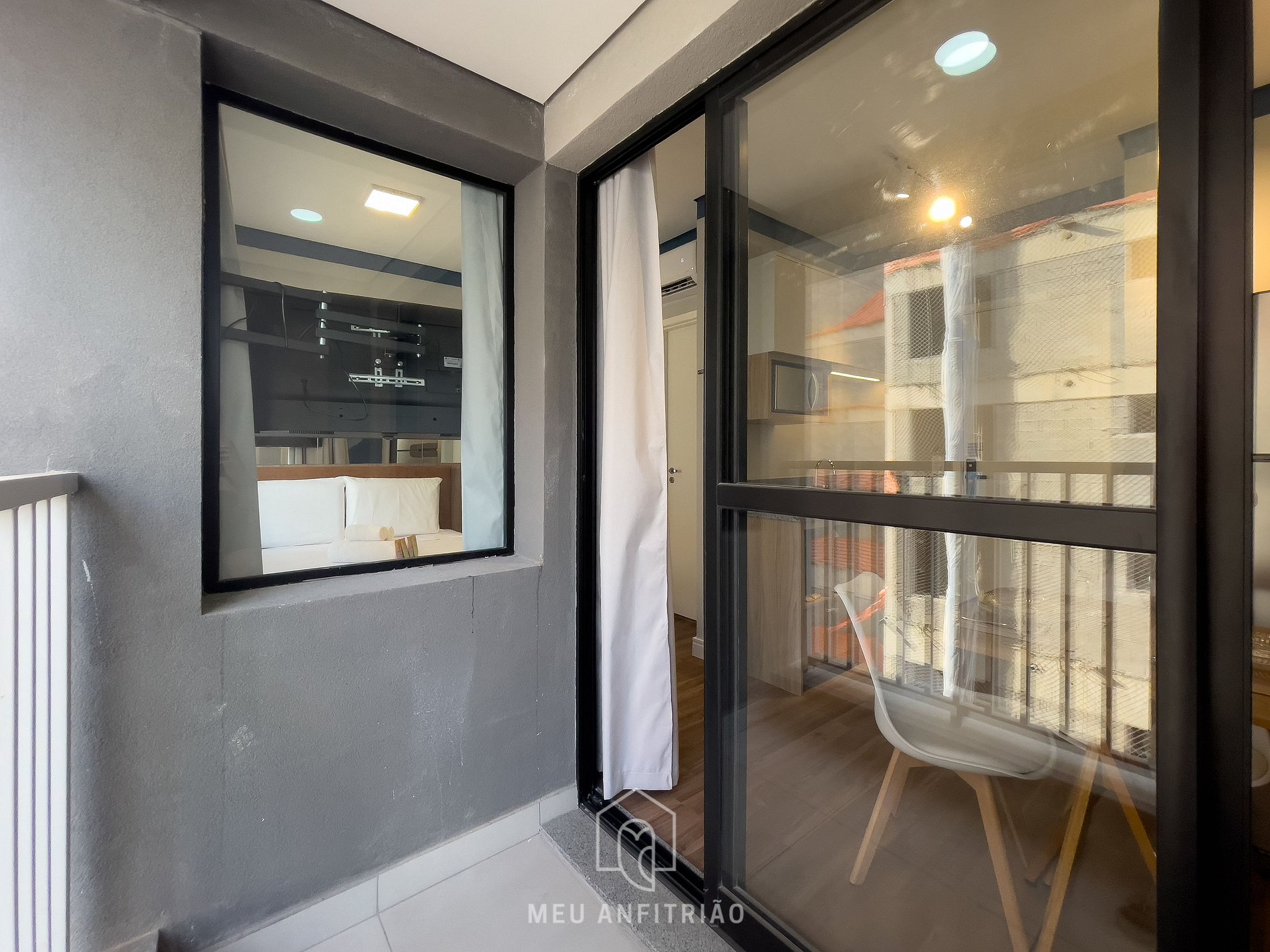 Nosso studio acomoda 2 pessoas confortavelmente em uma cama de casal, em um espaço de aproximadamente 22m². Contamos com área de lazer completa e portaria presencial 24h no condomínio.