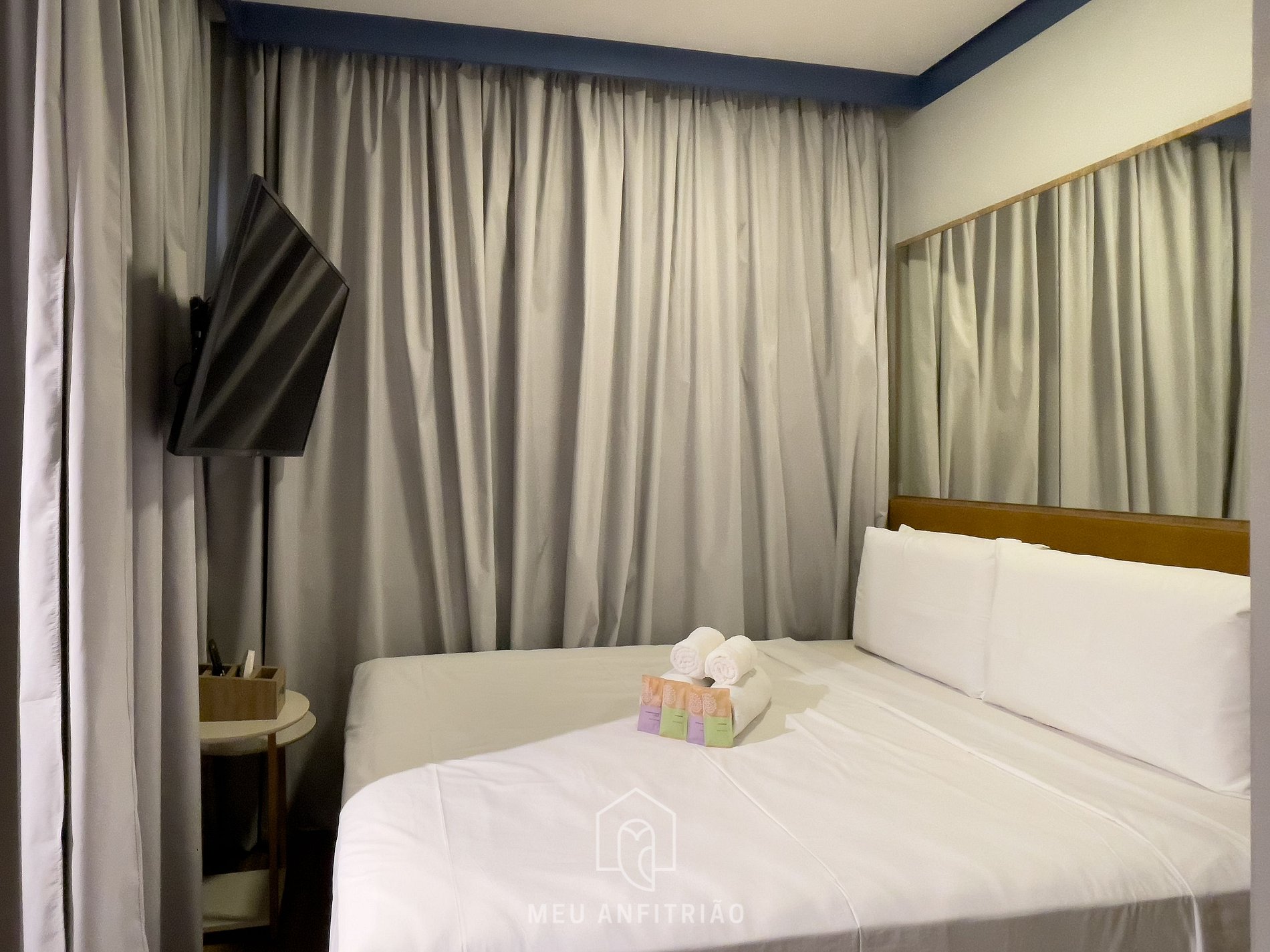 - Ambiente do studio com cama de casal, ferro e tábua de passar, TV Smart, guarda-roupas e ar-condicionado.