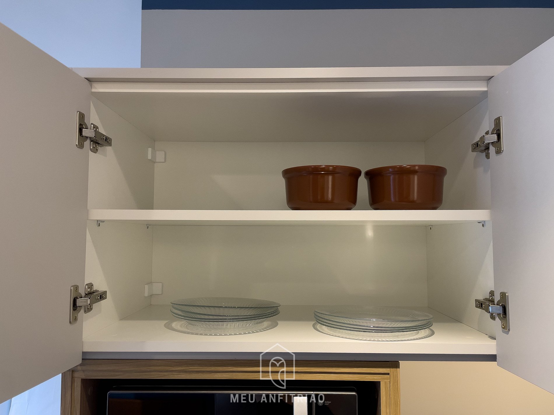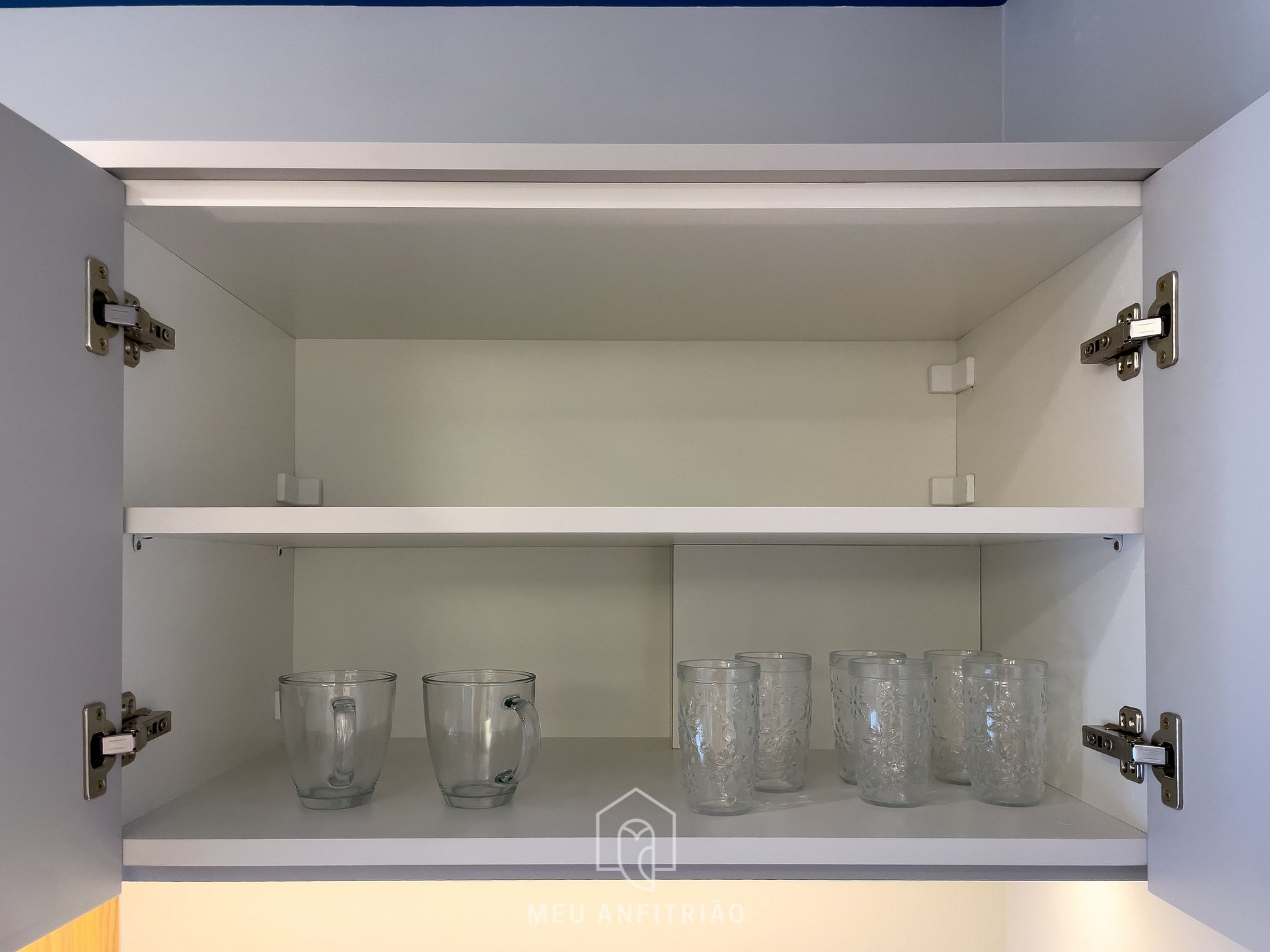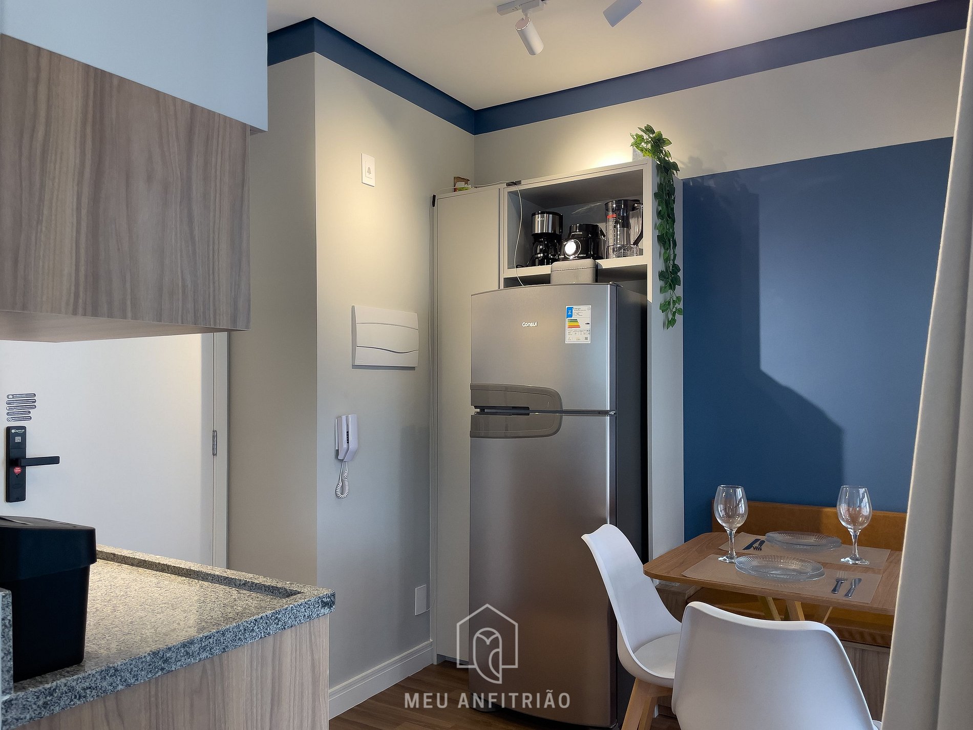 - Cozinha equipada com os utensílios e eletrodomésticos necessários para uma estadia confortável, como fogão cooktop, geladeira, micro-ondas, filtro d’água, cafeteira elétrica, liquidificador, entre outros, além de uma mesa com cadeiras e sofá para refeições ou home office.