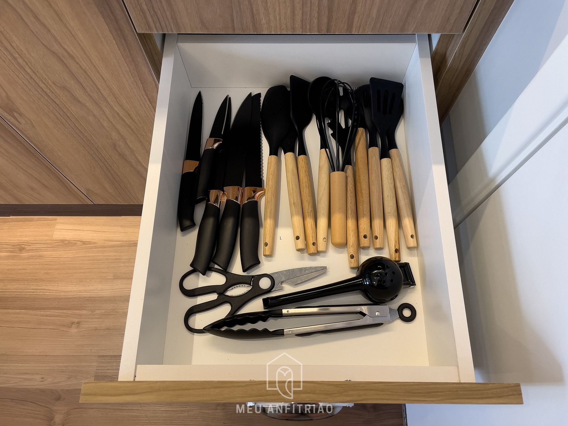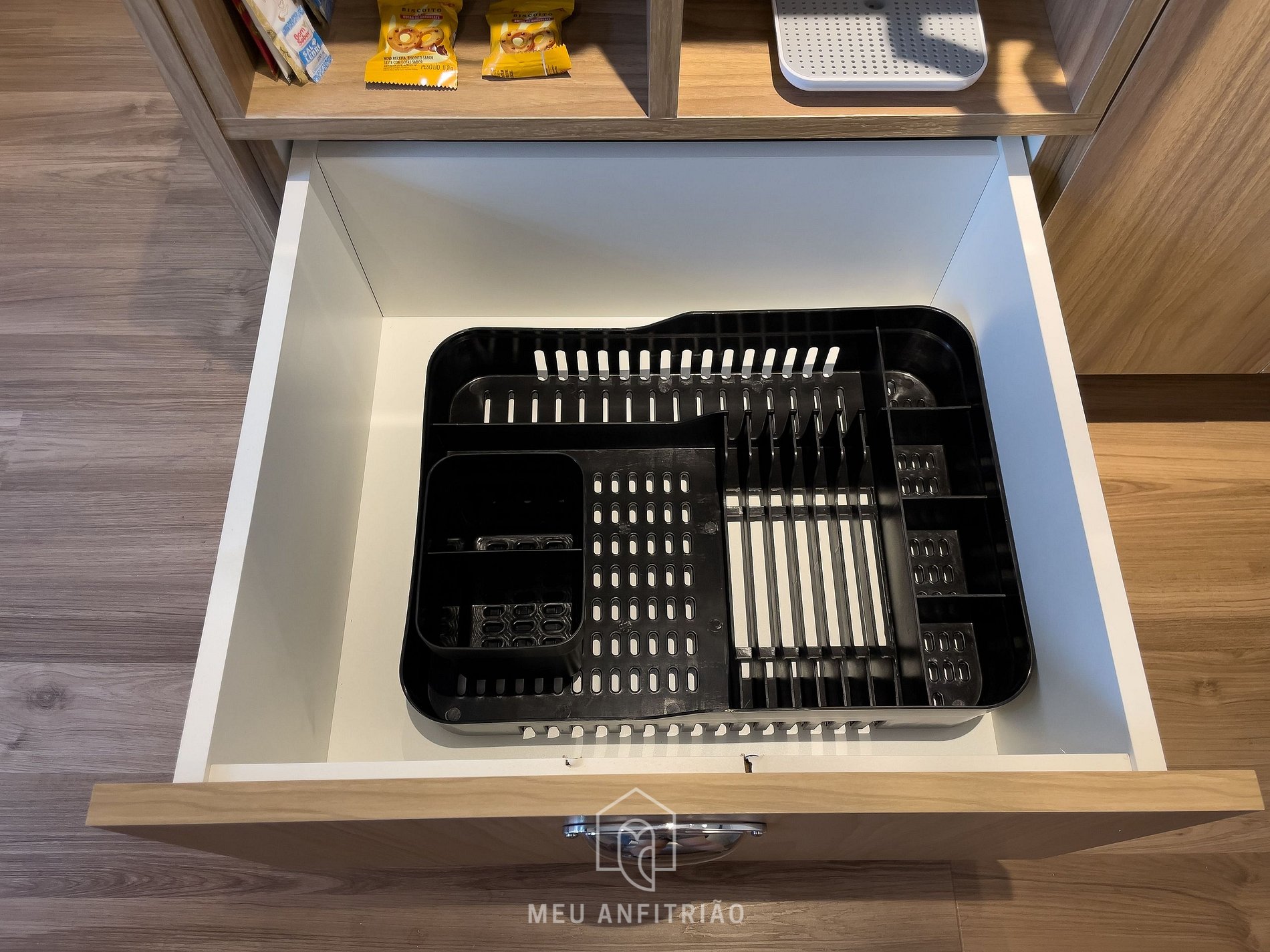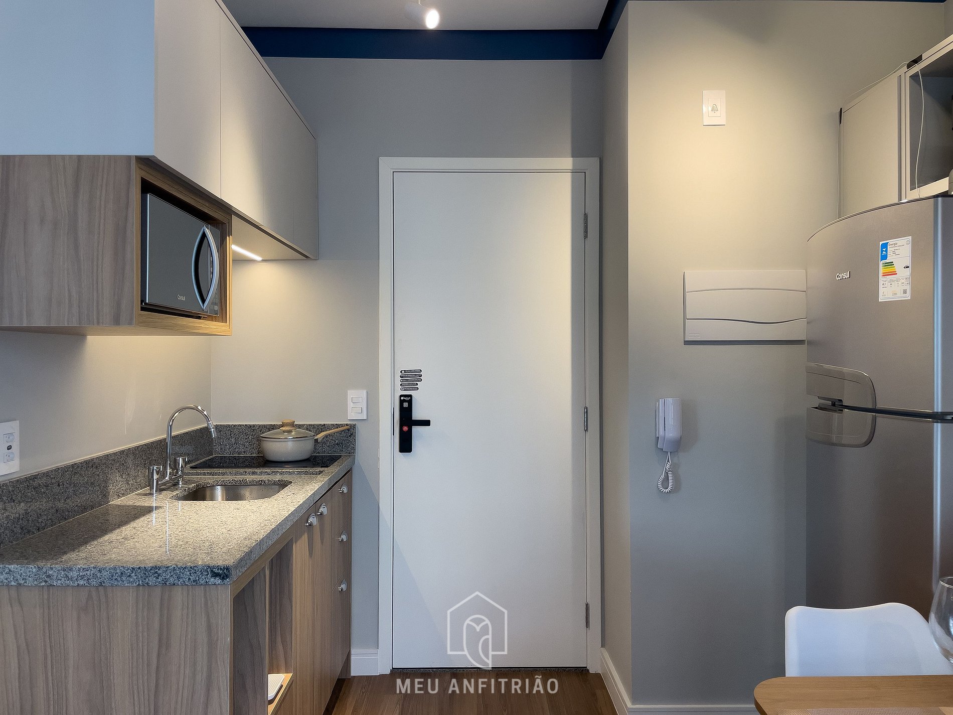 - Cozinha equipada com os utensílios e eletrodomésticos necessários para uma estadia confortável, como fogão cooktop, geladeira, micro-ondas, filtro d’água, cafeteira elétrica, liquidificador, entre outros, além de uma mesa com cadeiras e sofá para refeições ou home office.