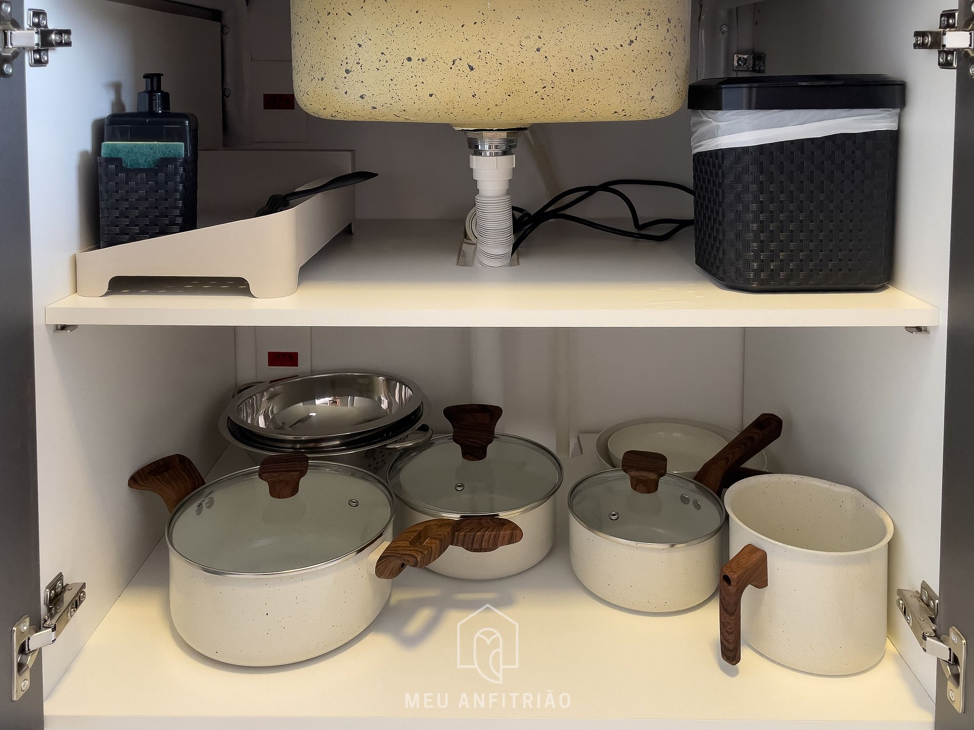 - Na cozinha temos um armário, fogão cooktop avulso, liquidificador, filtro d’água, micro-ondas, mini frigorifico, air-fryer, cafeteira de capsulas Nespresso, entre muitos outros itens para facilitar a sua acomodação.