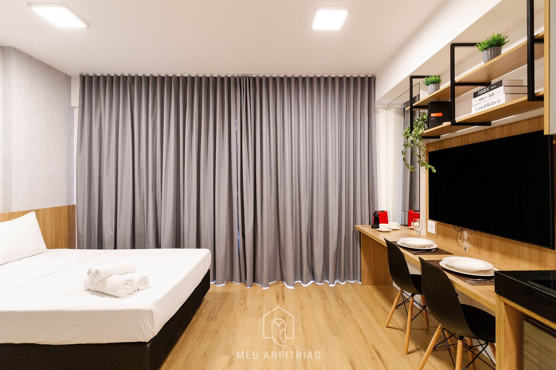 O studio é moderno e acomoda até 2 pessoas em uma cama de casal.