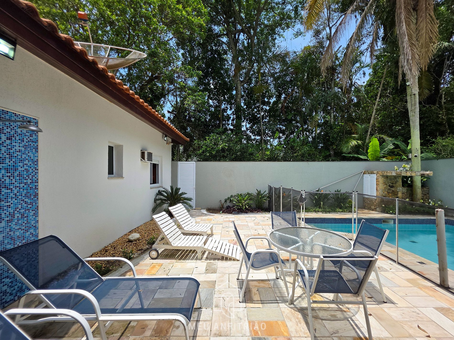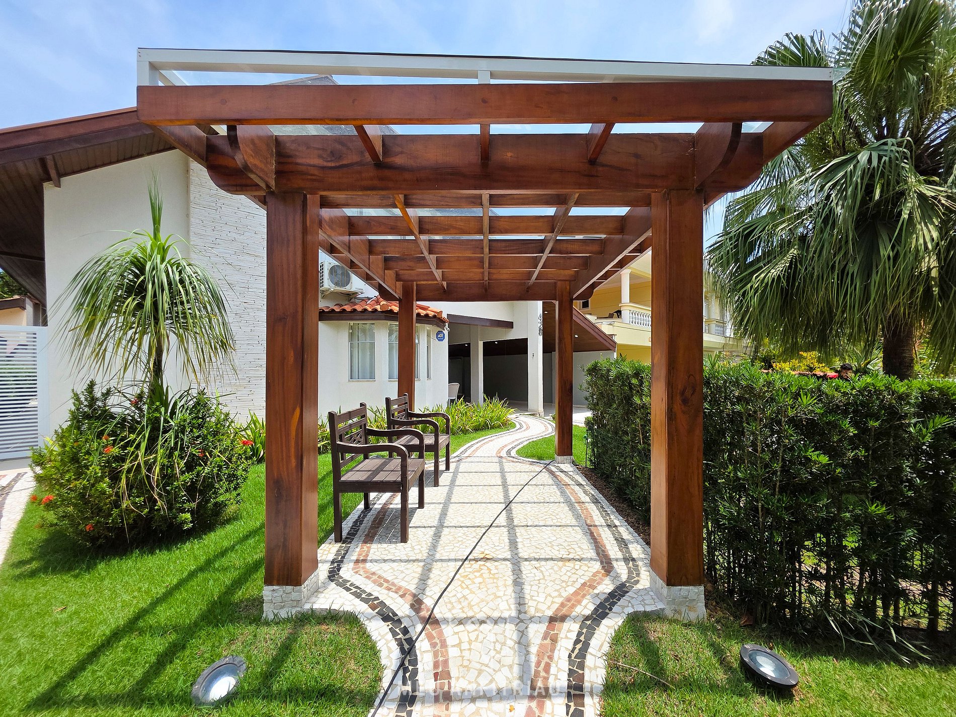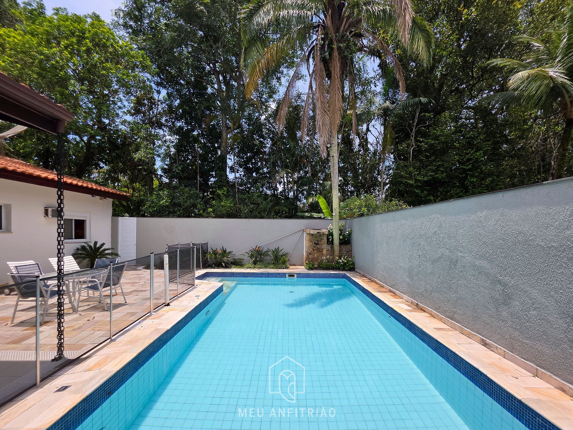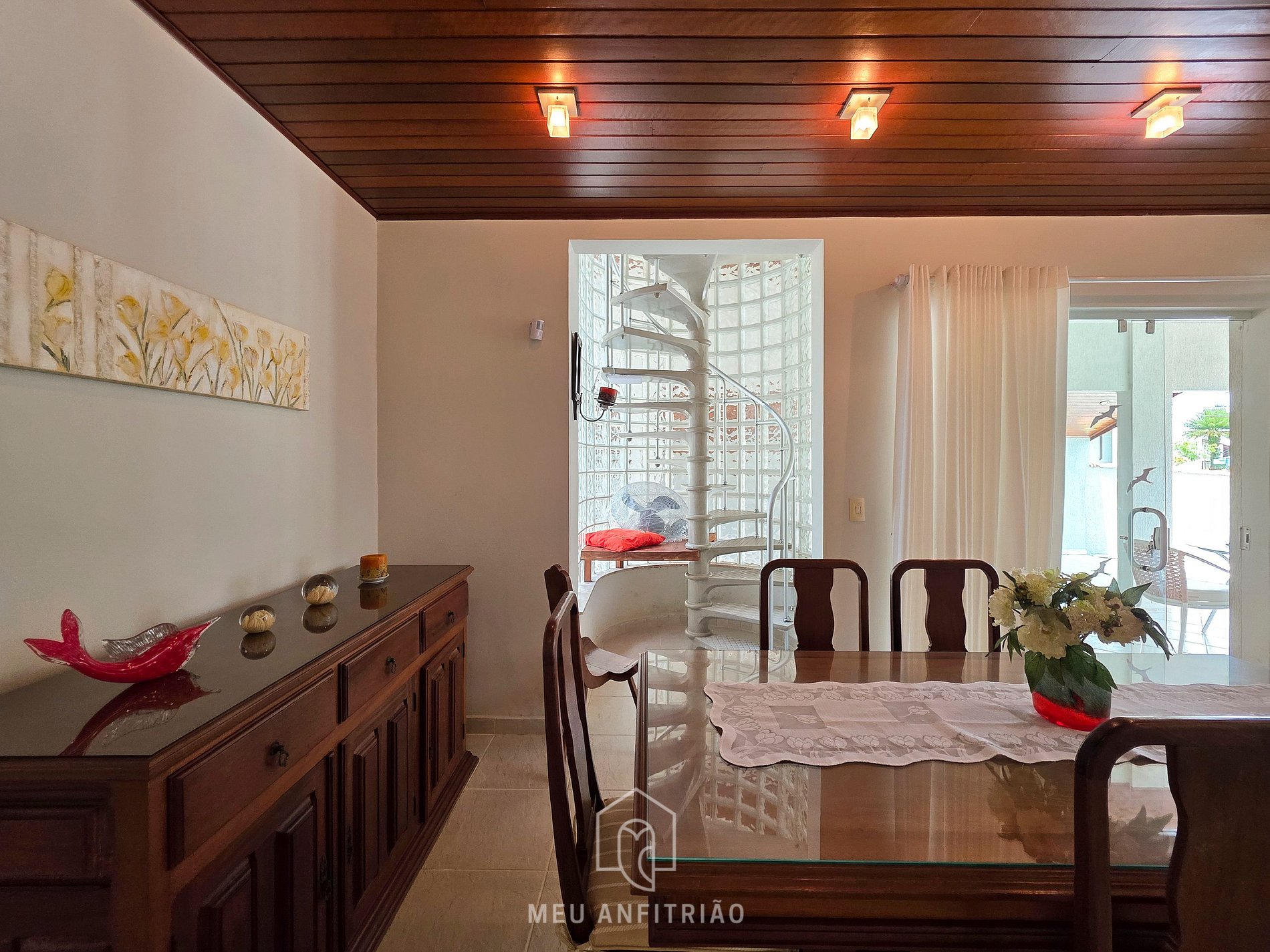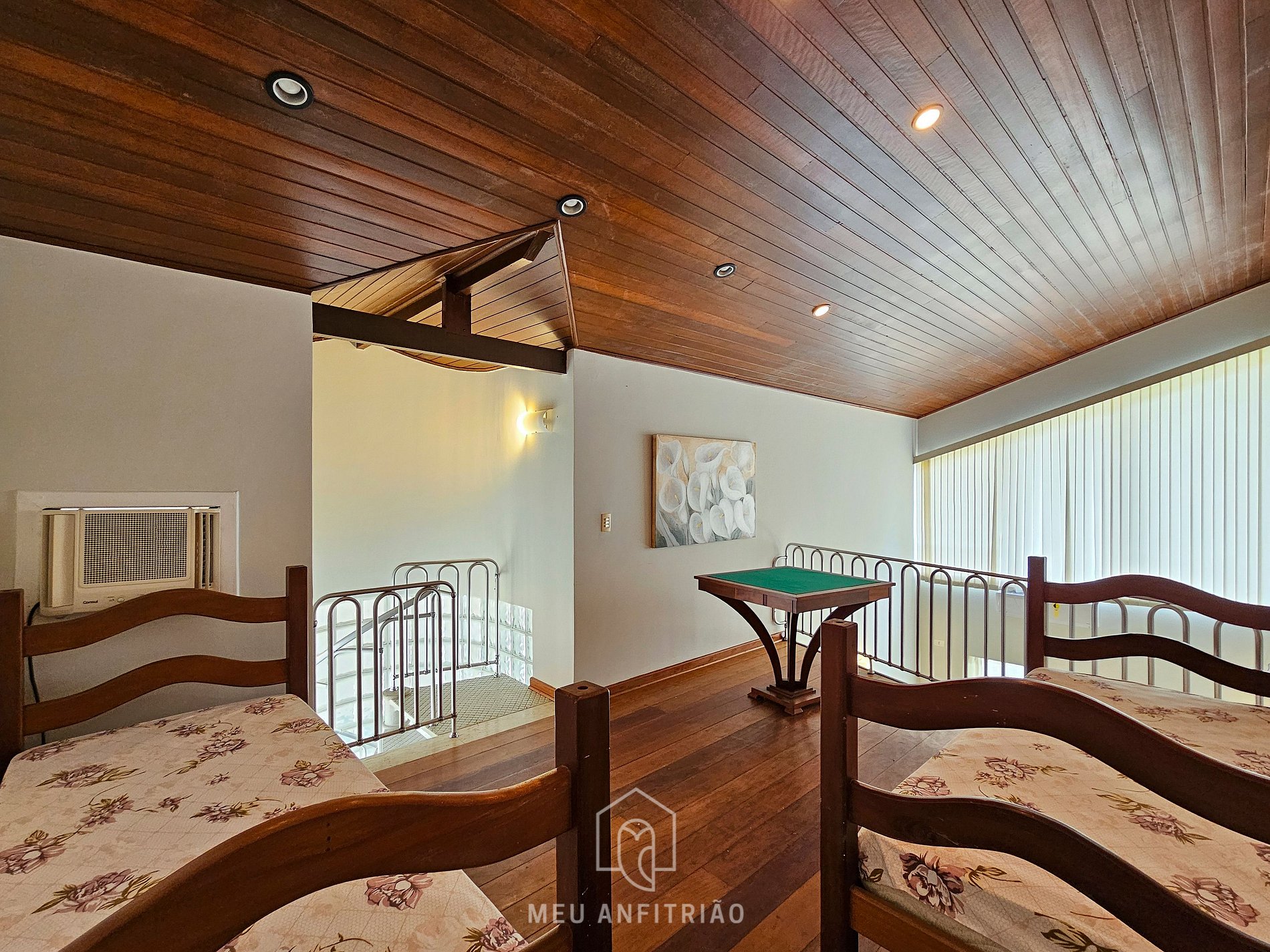 A casa acomoda até 14 pessoas em 3 suítes, 1 quarto e 1 mezanino, oferecendo um espaço amplo de 240m² com piscina e churrasqueira.