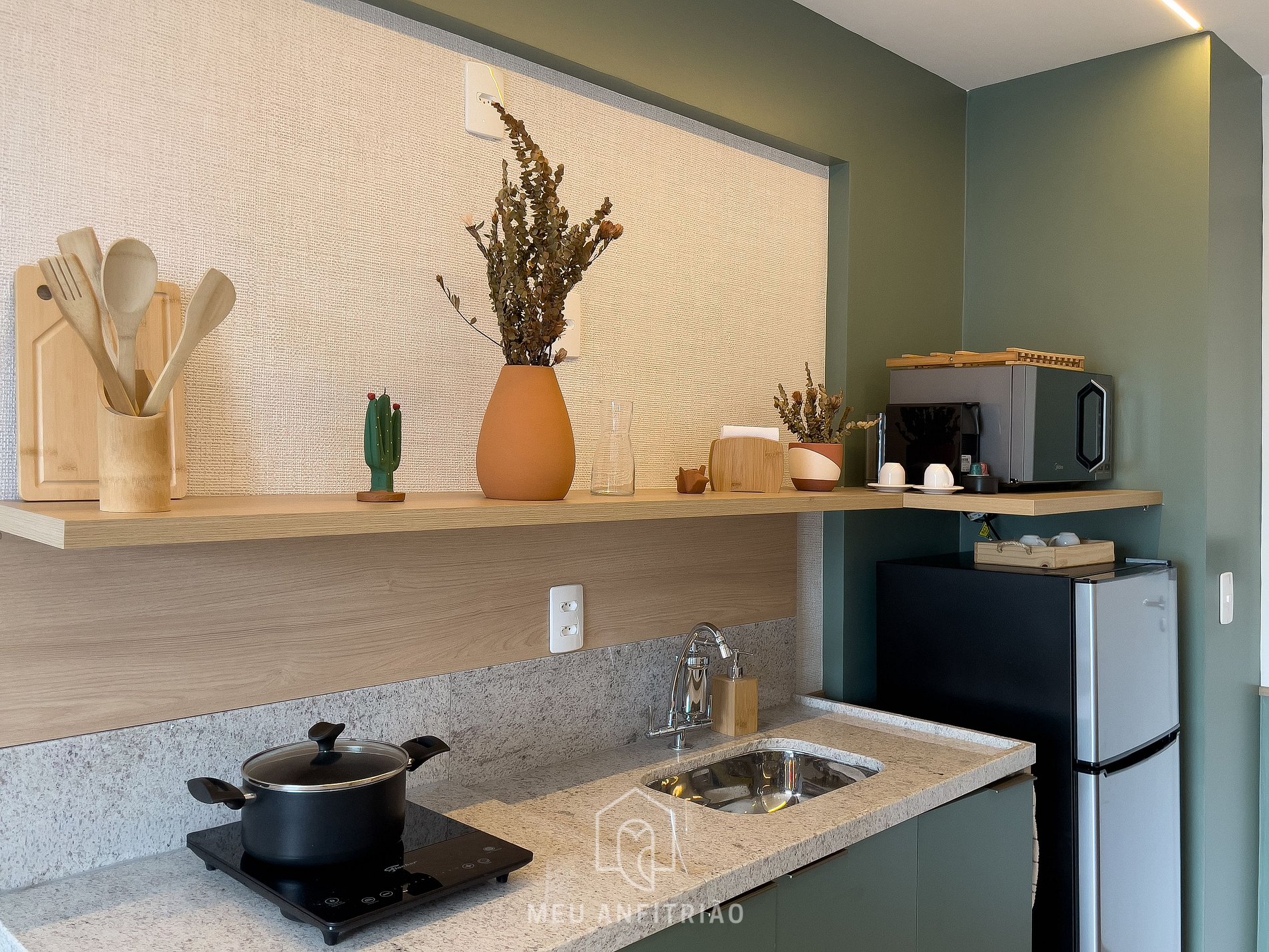- A cozinha oferece fogão cooktop avulso, geladeira, mesa para refeições, micro-ondas, cafeteira de cápsulas Nespresso, filtro d’água junto a pia, sanduicheira, liquidificador.