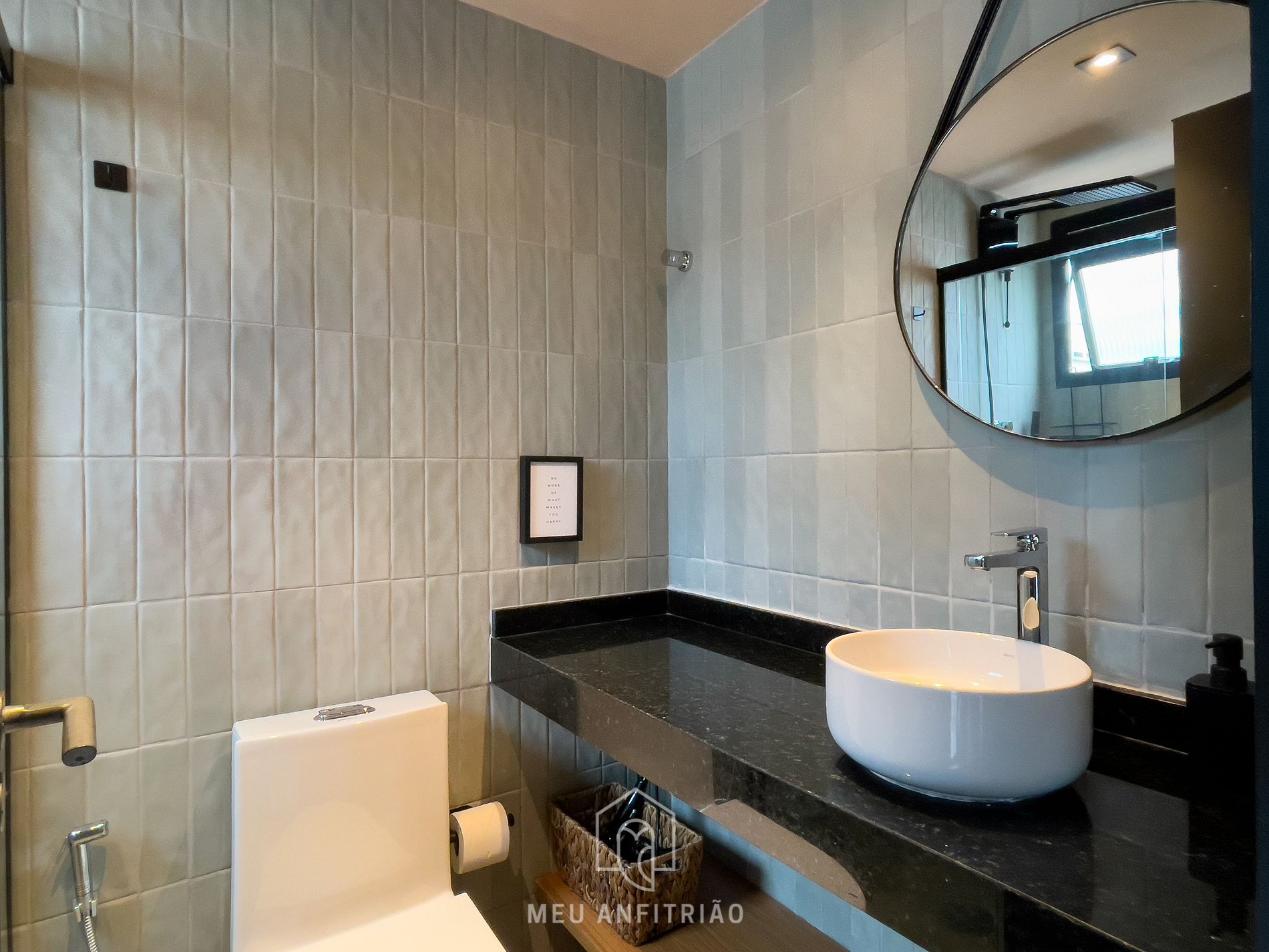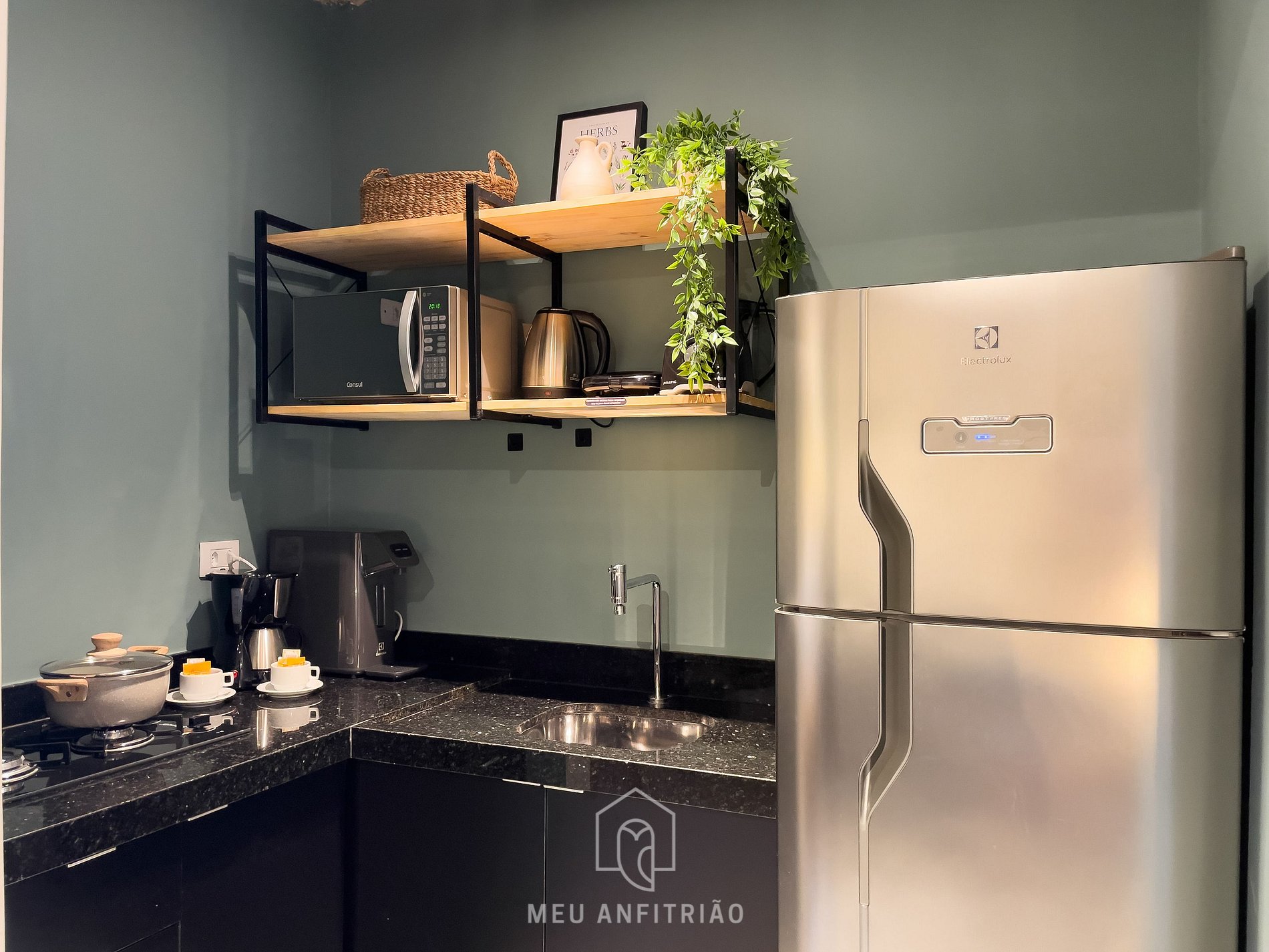 - Cozinha completa e equipada com os utensílios ideais para uma estadia confortável, como fogão cooktop, geladeira, micro-ondas, liquidificador, sanduicheira, cafeteira e chaleira elétricas, filtro d’água entre outros.
