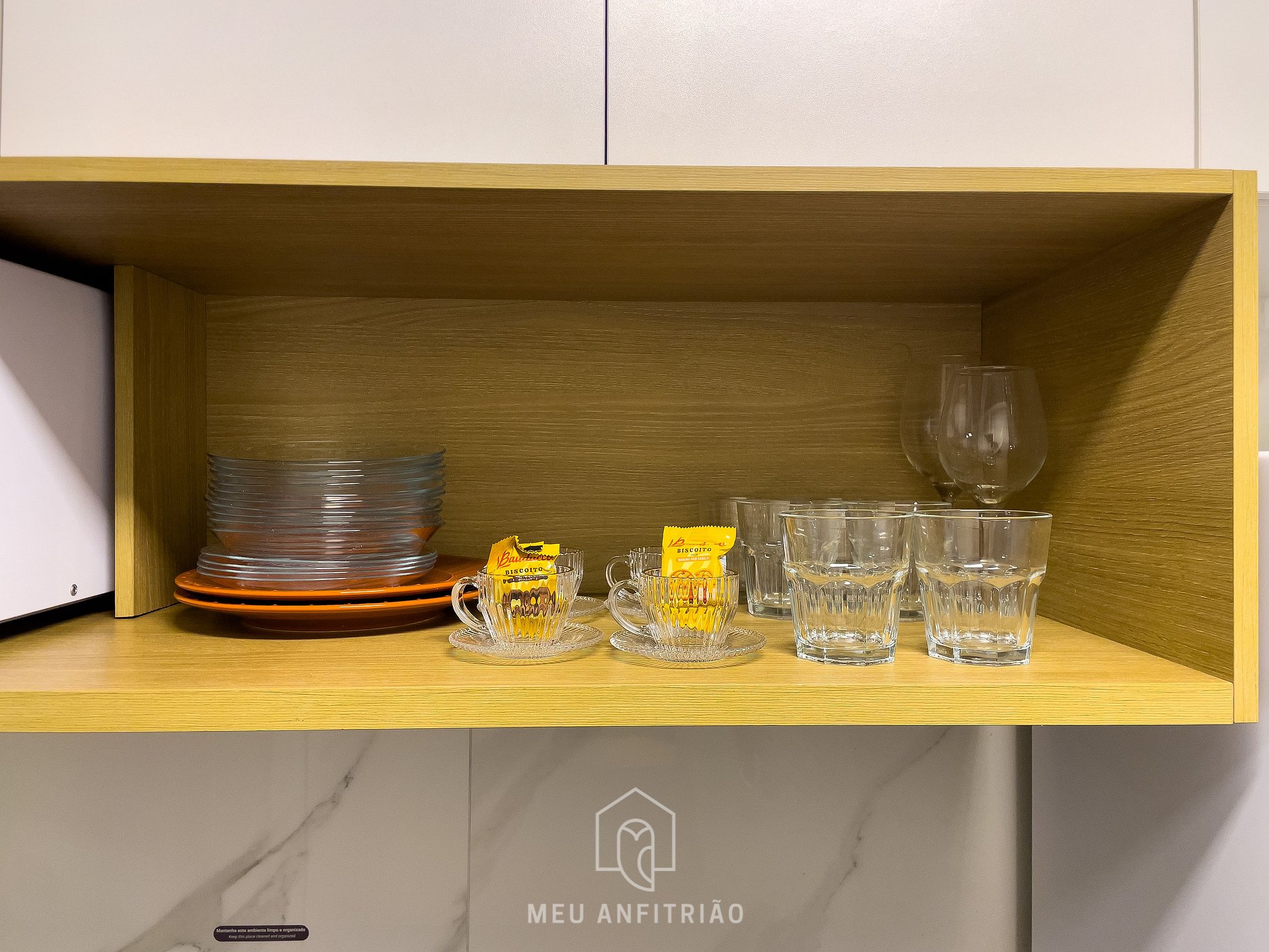 - Cozinha completa com fogão cooktop, geladeira, micro-ondas, filtro d’água, liquidificador, sanduicheira, mixer, cafeteira e chaleira elétricas, entre outros utensílios e eletrodomésticos essenciais para uma estadia confortável.