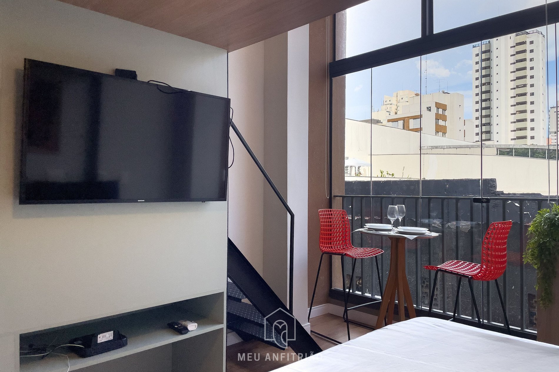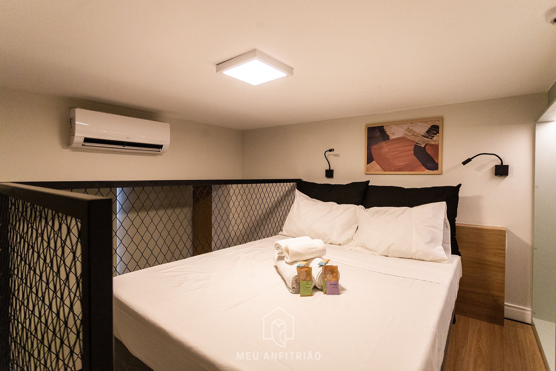 - Espaço do studio com cama de casal, TV Smart, ar-condicionado, mesa com cadeiras para refeições ou home office e mezanino com mais uma cama de casal e guarda-roupas.