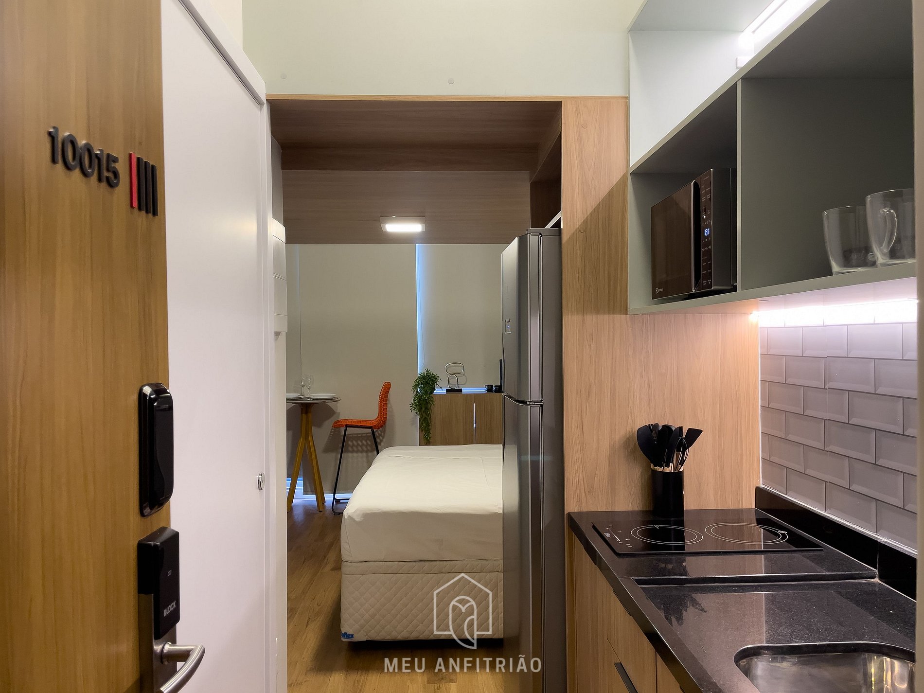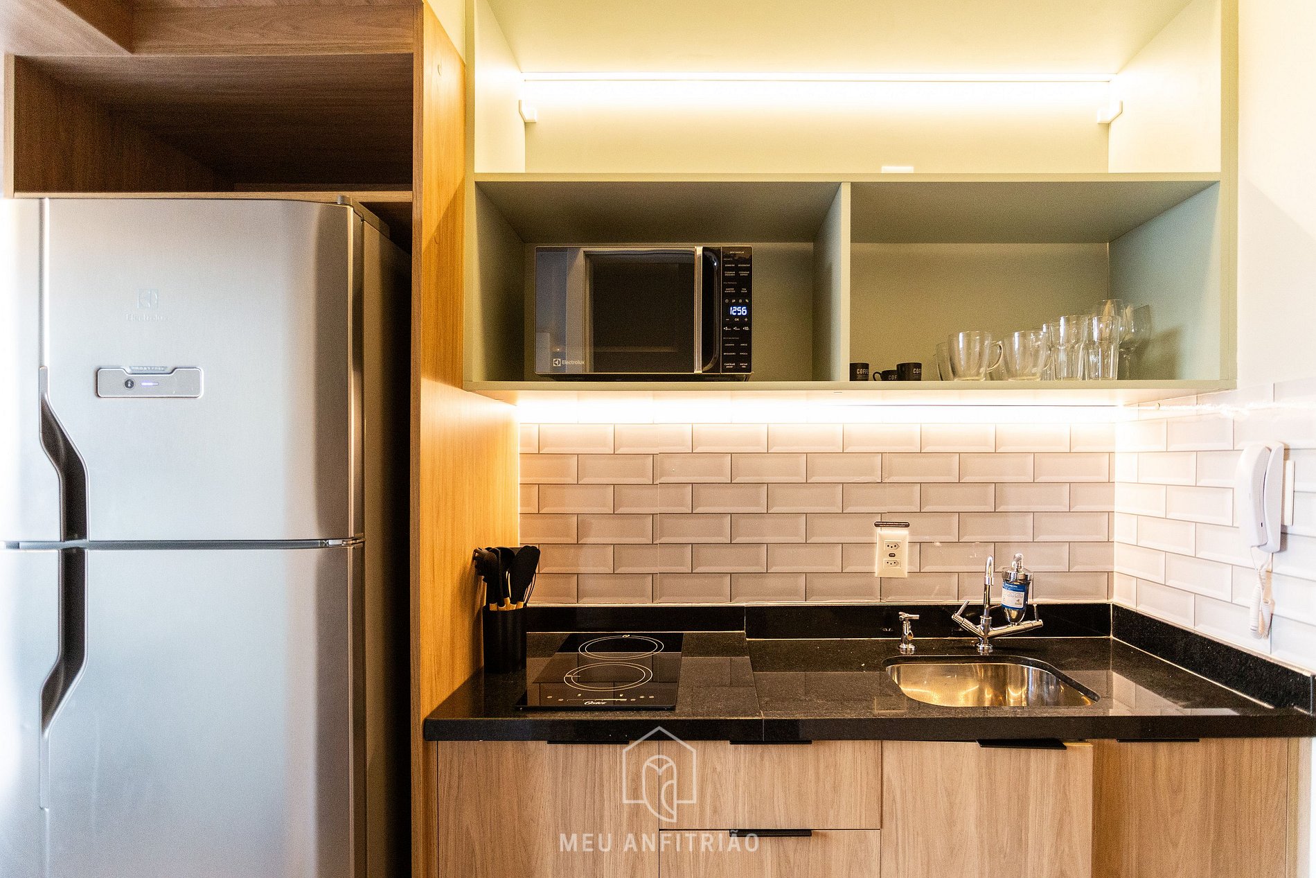 - Uma cozinha completa com os itens mais buscados para uma estadia funcional, como fogão cooktop, geladeira, micro-ondas, liquidificador, cafeteira elétrica, filtro d’água entre outros.