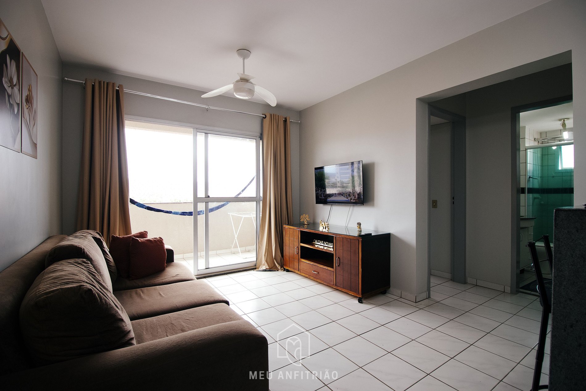 - Sala de estar com sofá e TV Smart, além de uma pequena varanda com vista para a Serra das Caldas, com uma porta de vidro com cortinas.