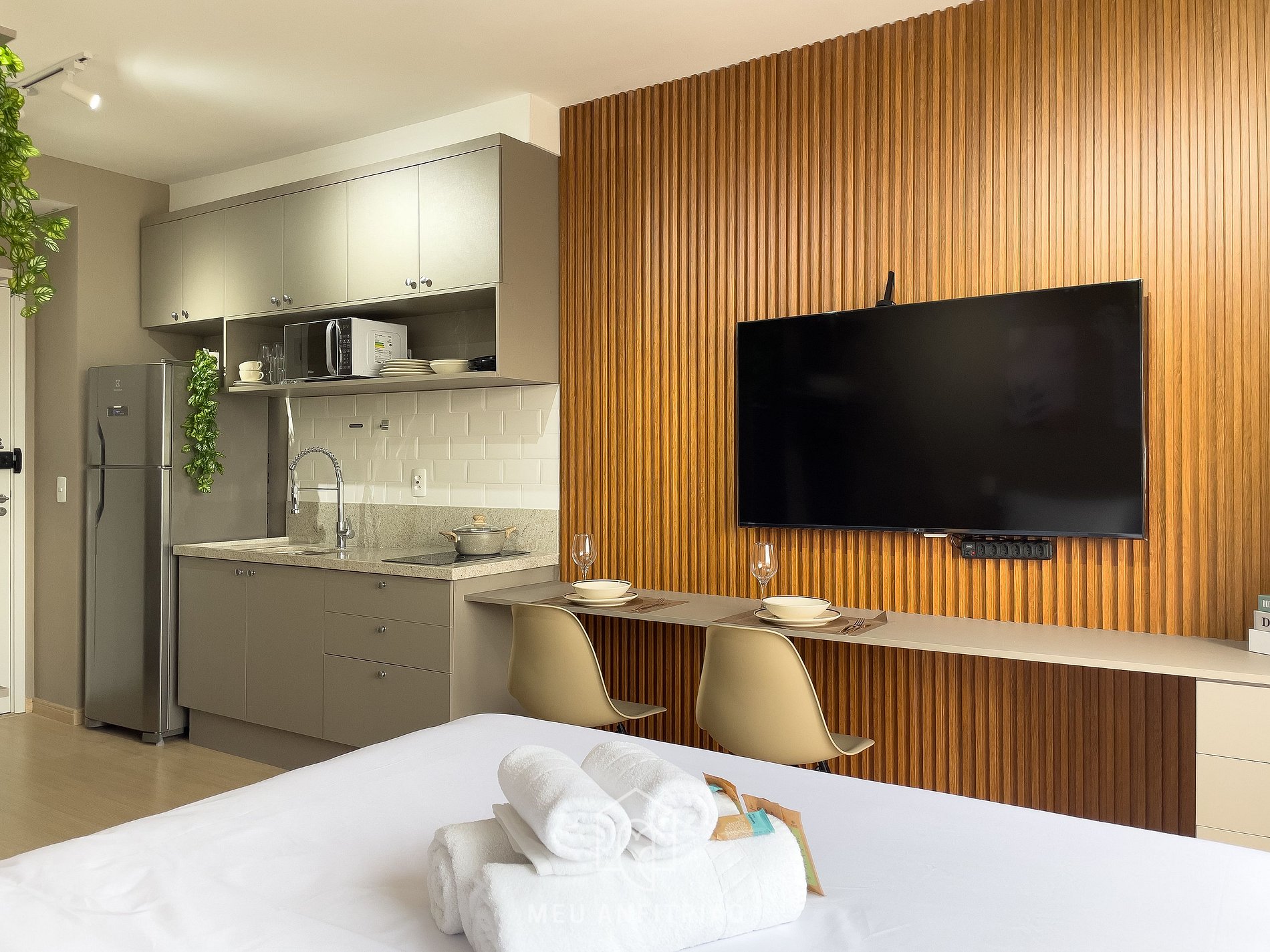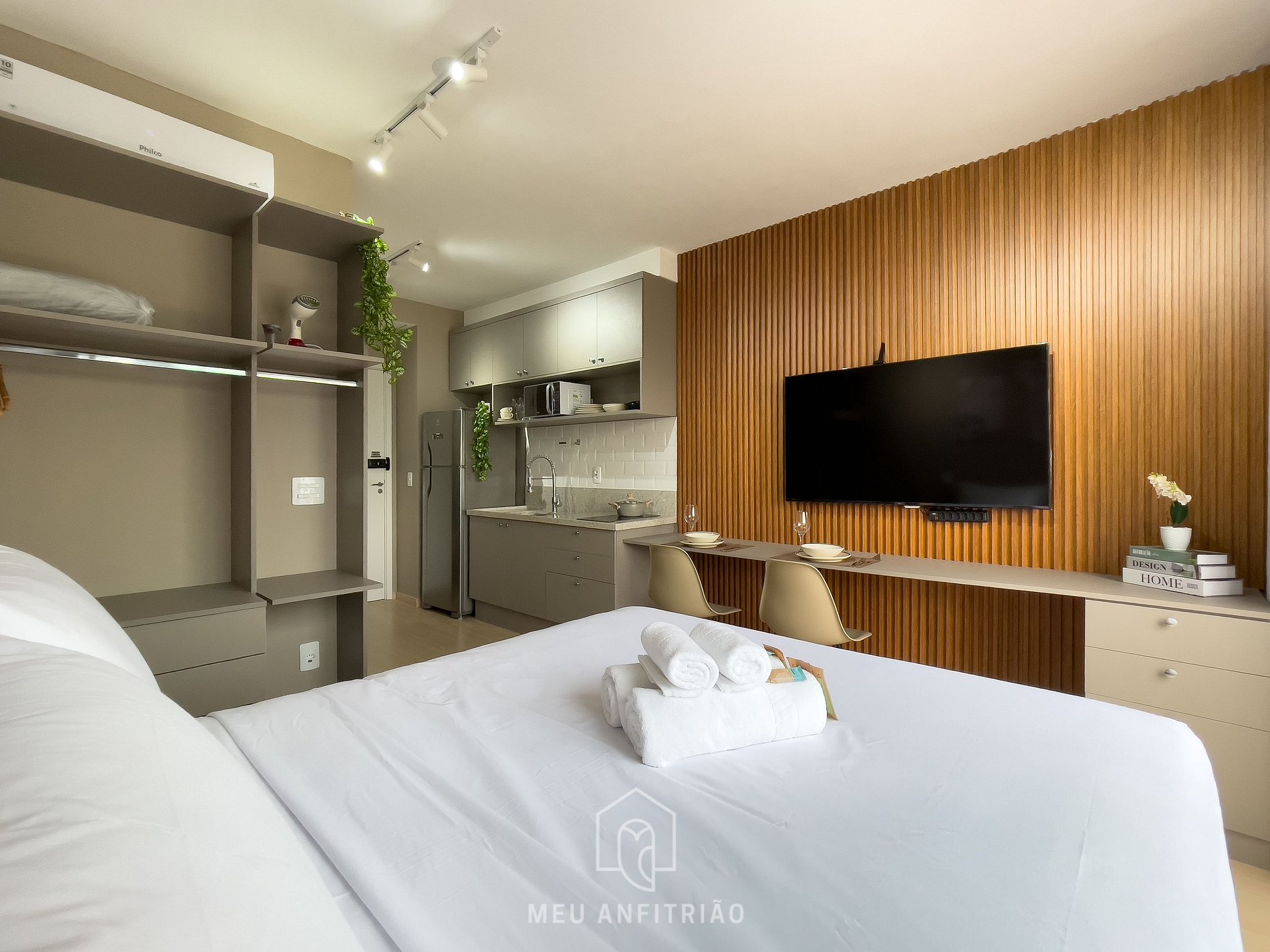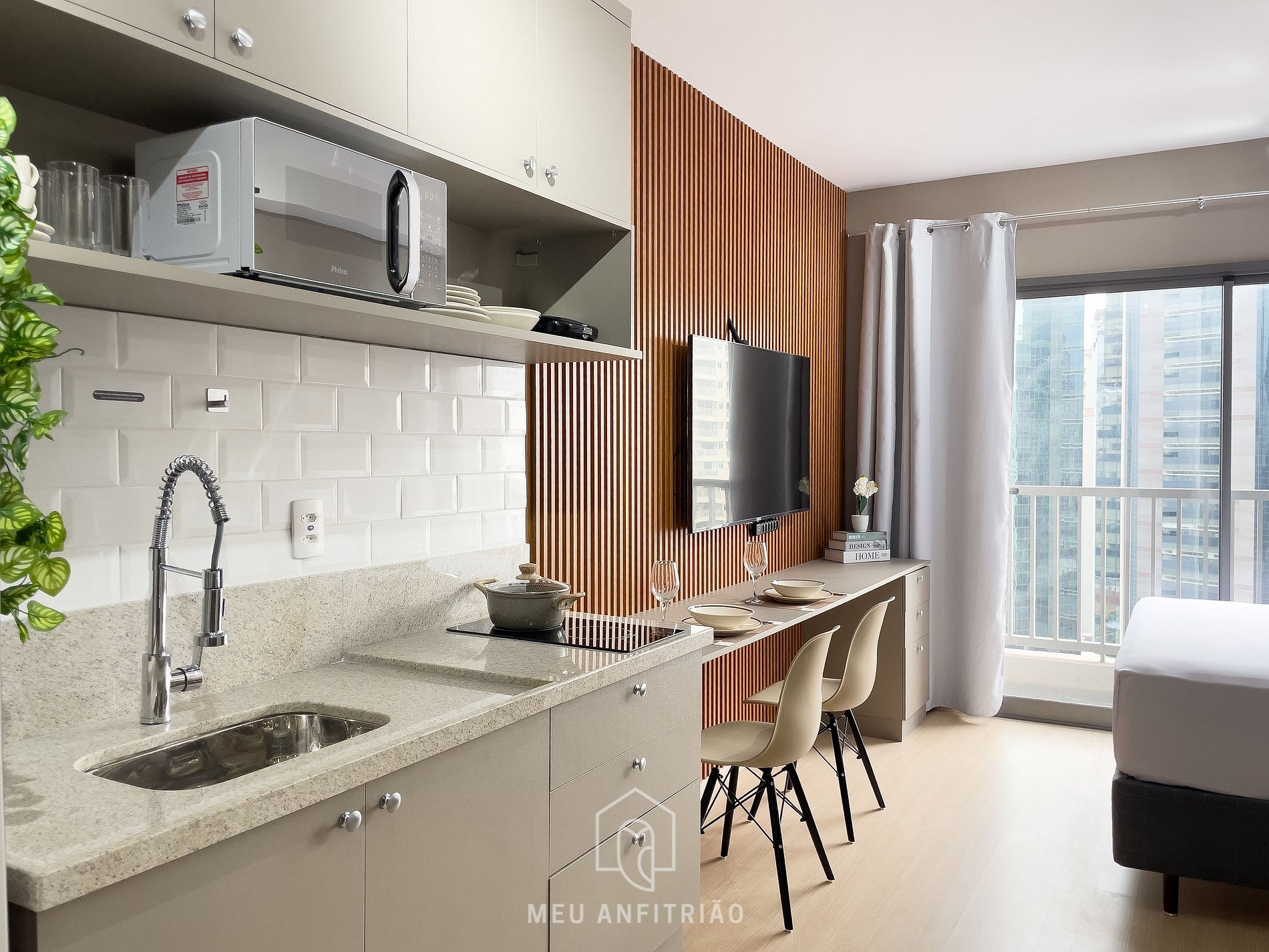 - Na área do studio: uma cama de casal, mesa com cadeiras para home office ou refeições, TV Smart LG 50”, guarda-roupas, vaporizador e ar-condicionado, além de uma pequena varanda com vista para a Faria Lima, sendo fechada por portas de vidro com isolamento acústico e cortinas.