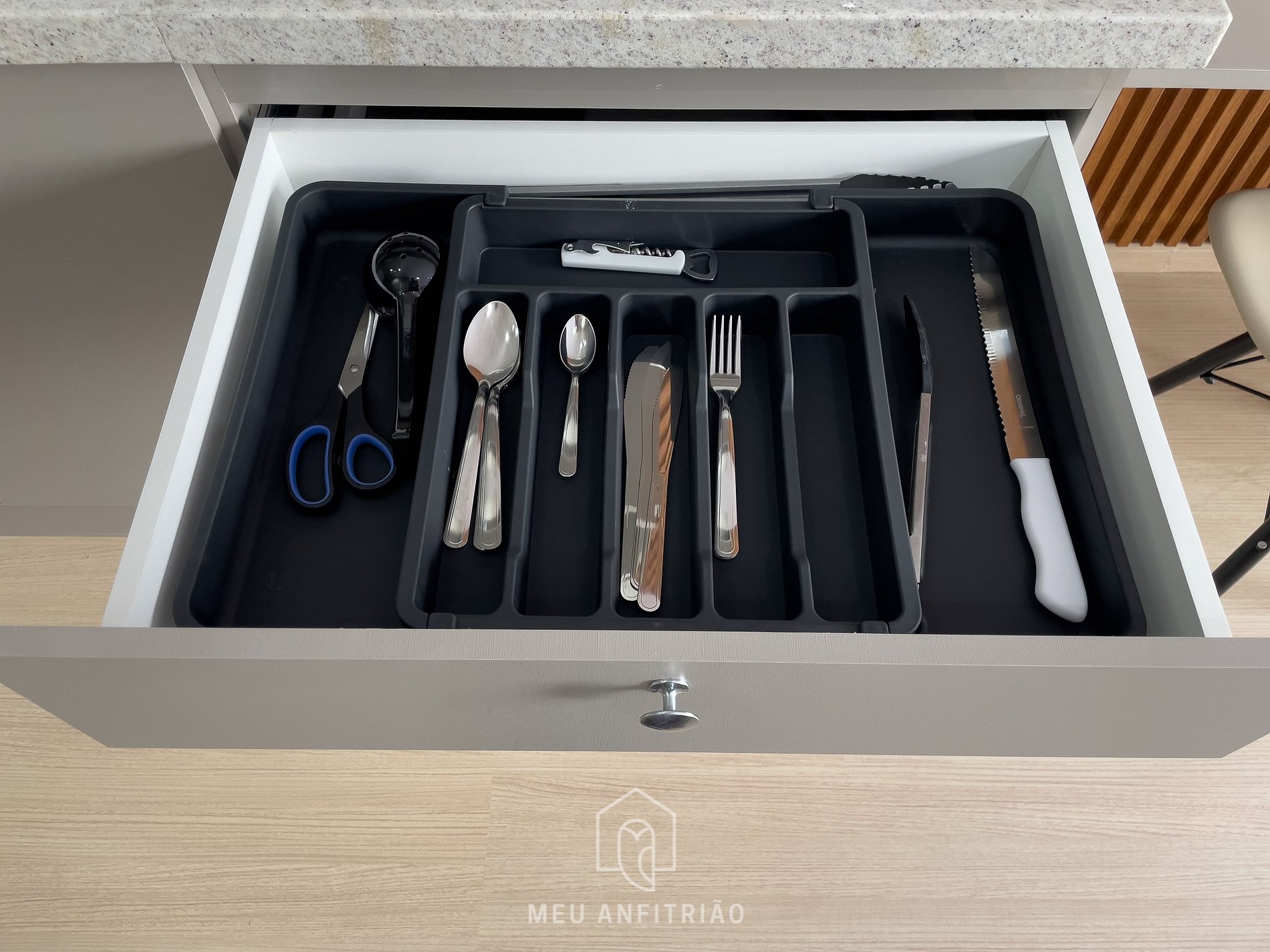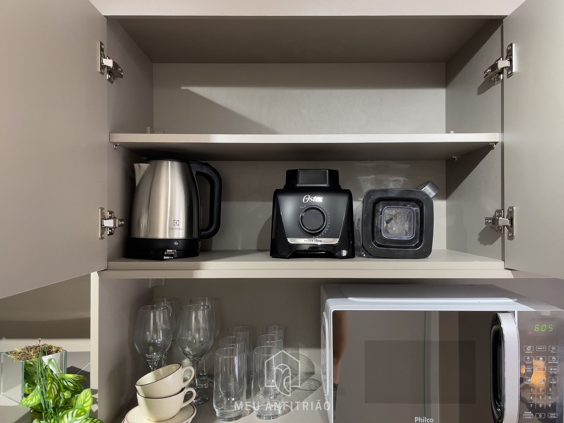 - Cozinha completa com os itens necessários para uma estadia completa, como fogão cooktop, geladeira, micro-ondas, cafeteira e chaleira elétricas, sanduicheira, liquidificador entre outros.