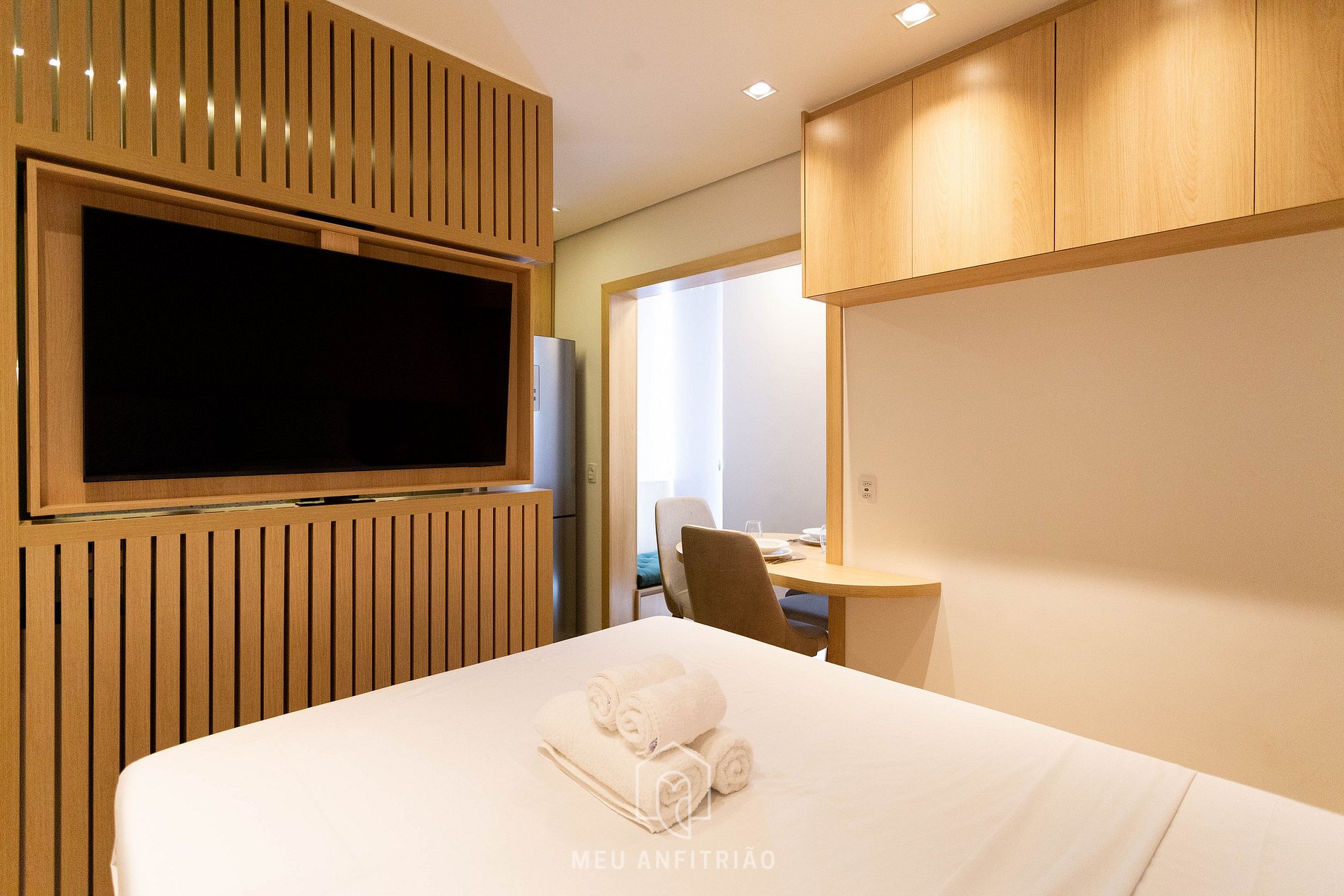 Disponibilizamos também WI-FI de alta velocidade, banheiro com chuveiro a gás e TV Smart giratória que pode ser usada para a cozinha, quarto ou varanda.
