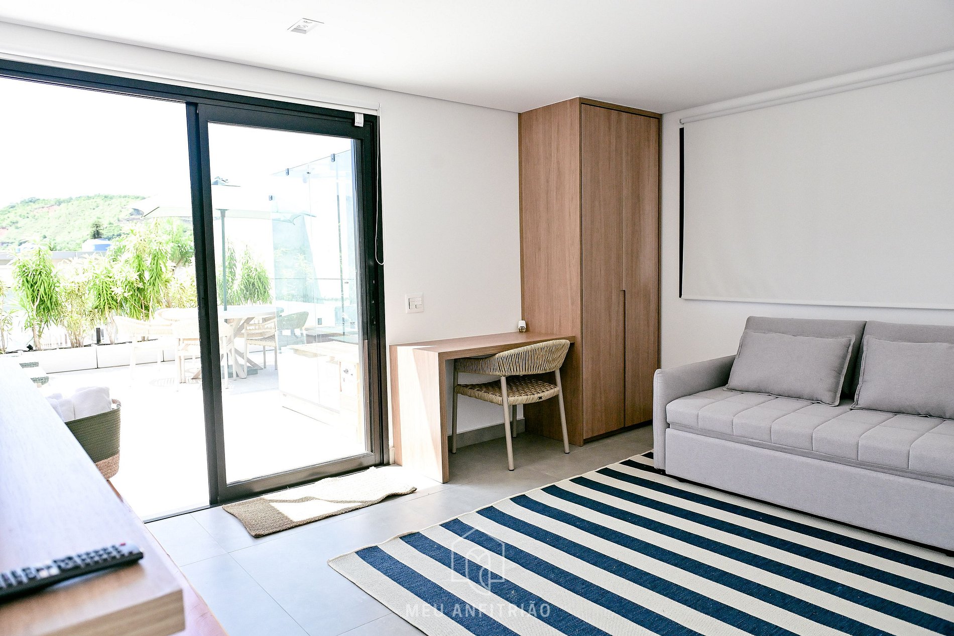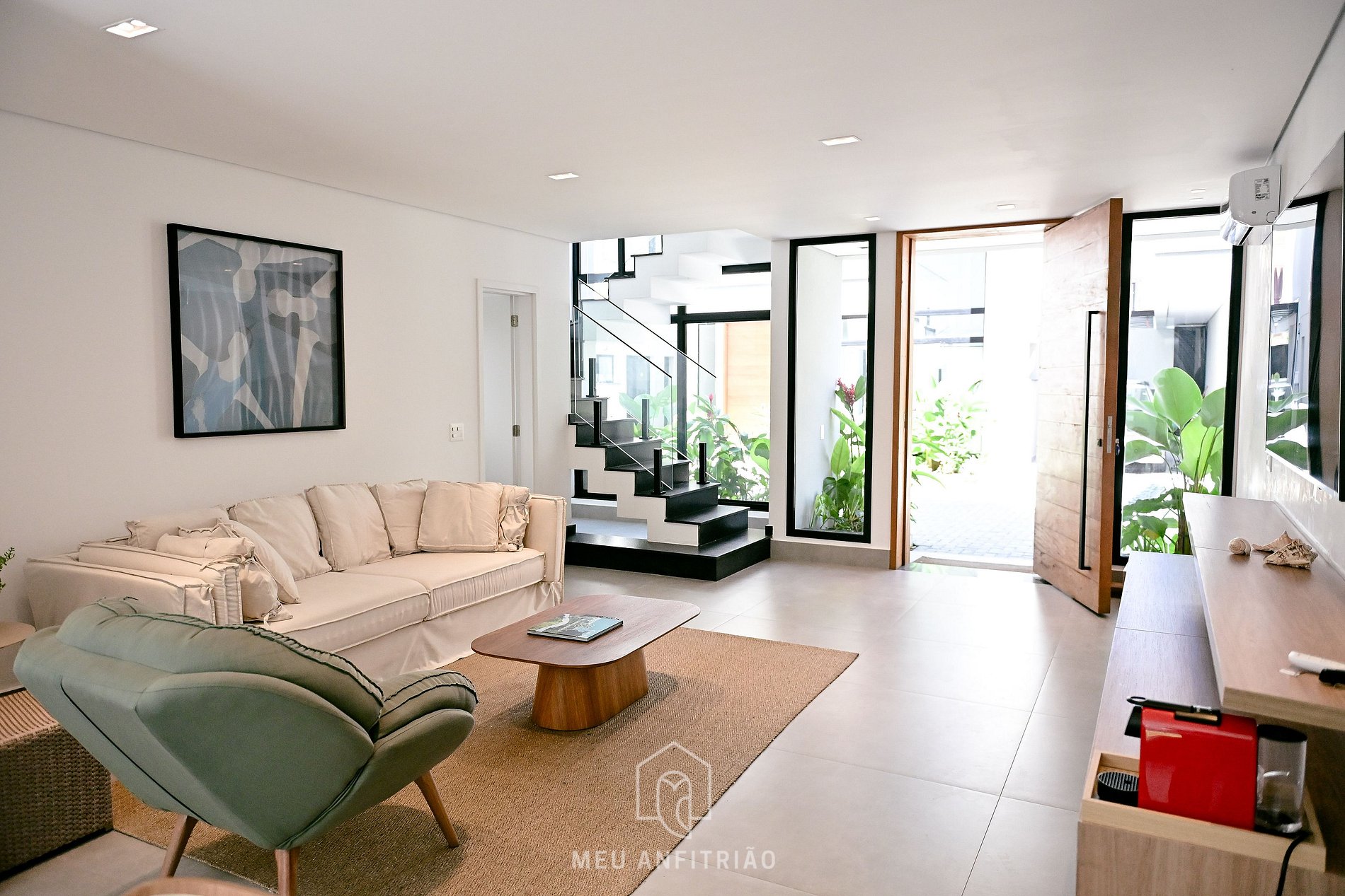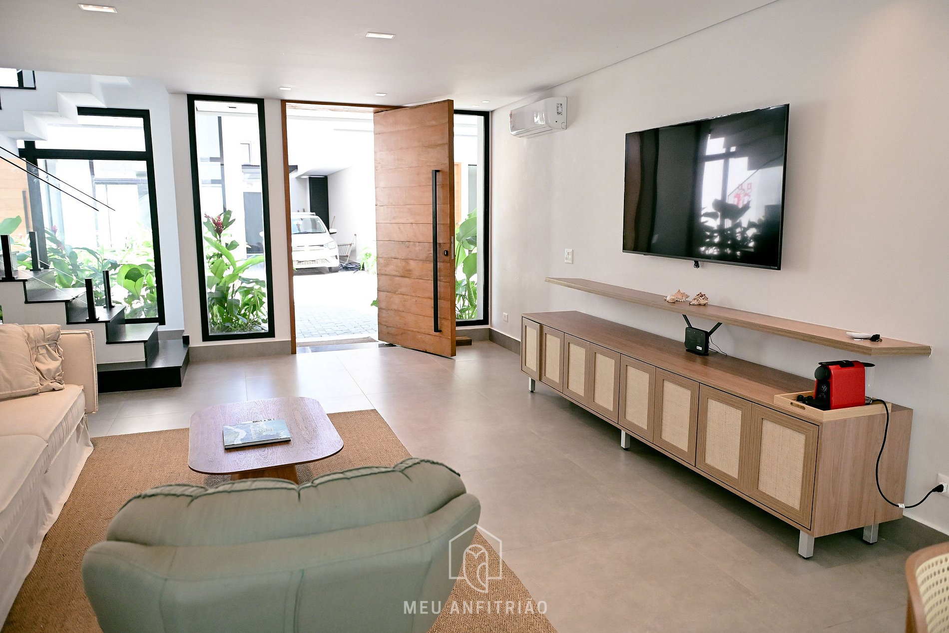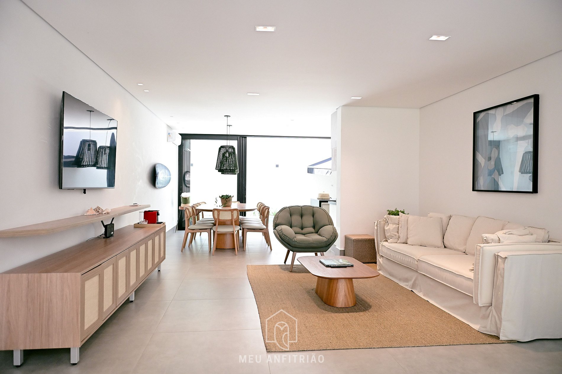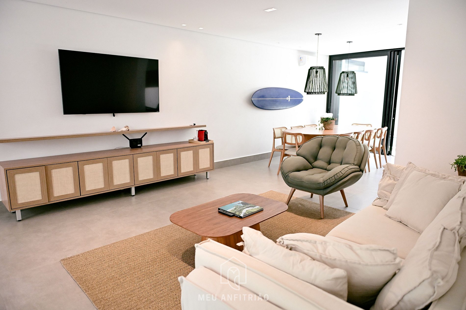 - Sala de estar ampla e arejada, equipada com sofá, poltrona, TV Smart e lavabo.
