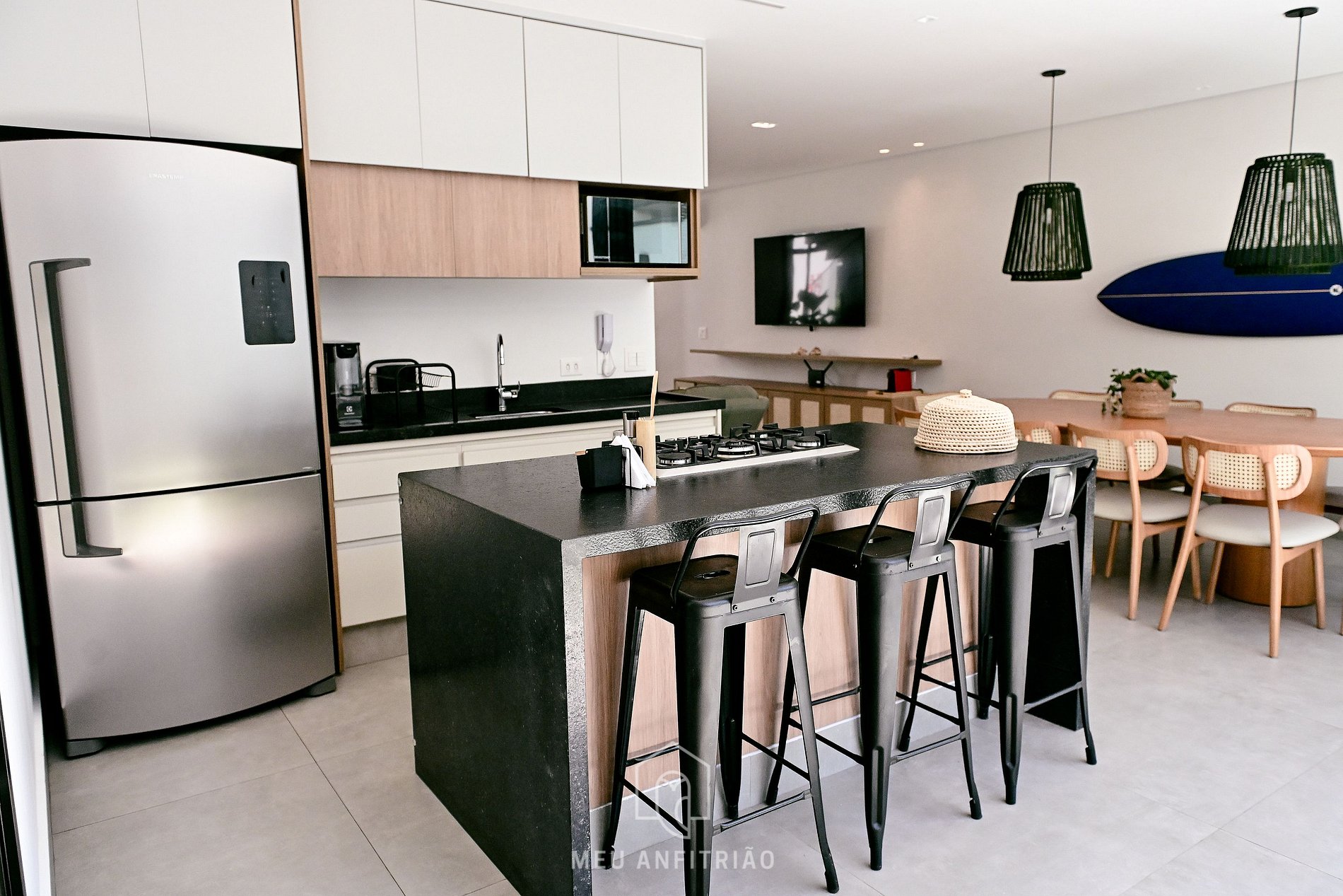 - Cozinha equipada com os principais utensílios para proporcionar uma estadia confortável, incluindo geladeira, fogão cooktop, micro-ondas, filtro de água, sanduicheira, entre outros, além de mesa de jantar.