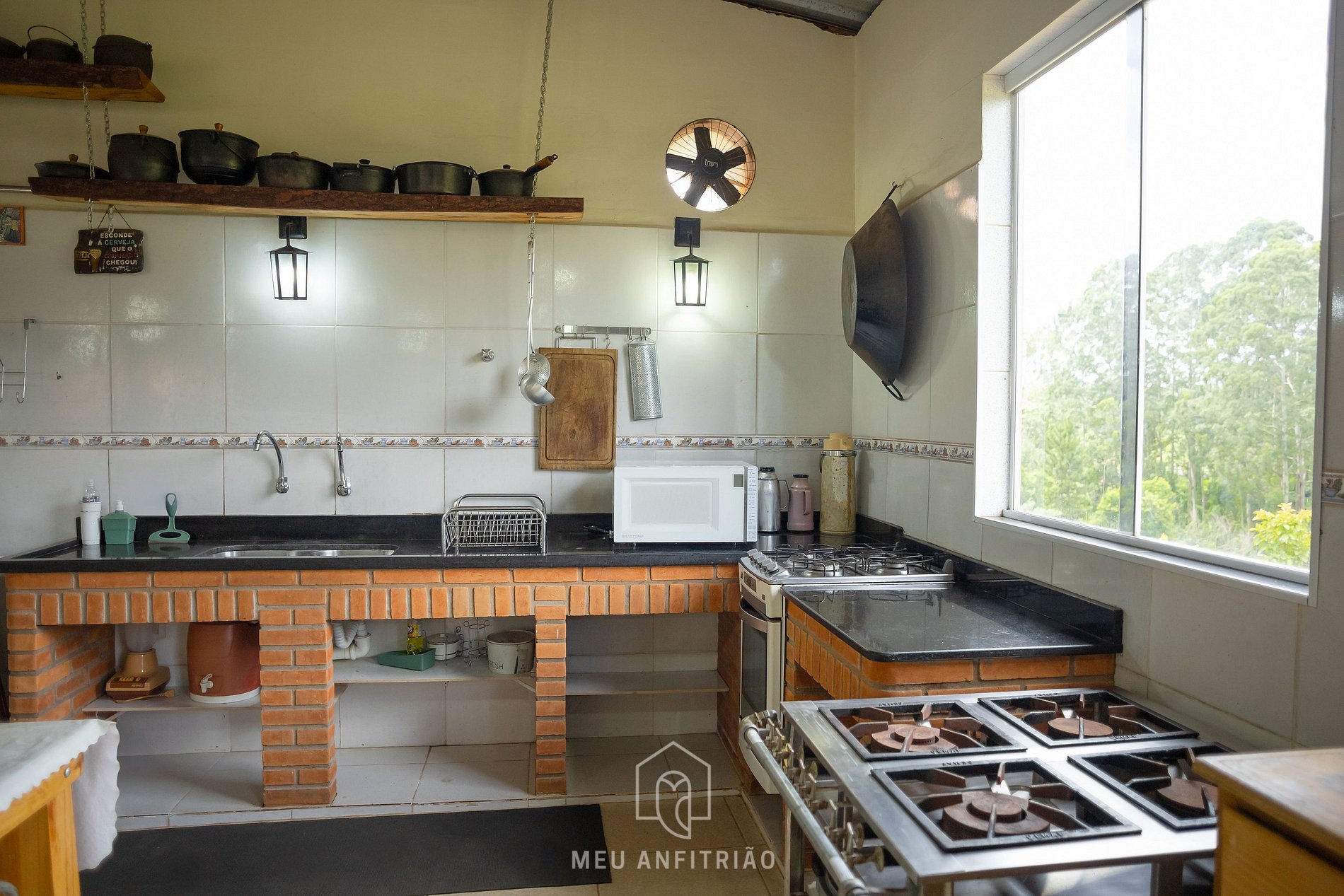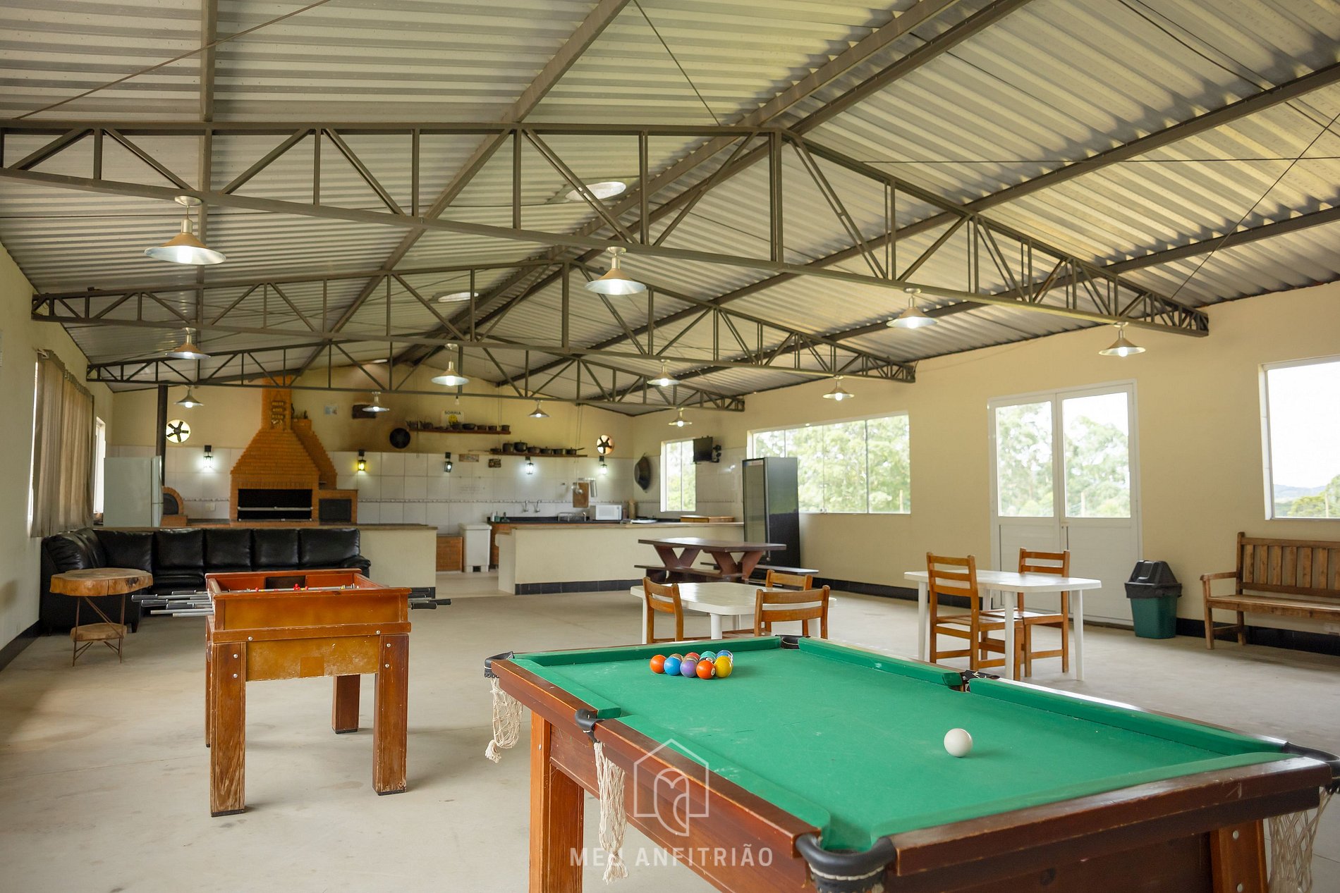 - Salão de festas completo, pensado para reunir família e amigos, com churrasqueira, forno de pizza à lenha, sofás, mesas e cadeiras, além de pebolim e mesa de sinuca para momentos de descontração. O espaço conta ainda com cozinha completa equipada com geladeira, fogão, forno e utensílios necessários para uma estadia confortável.