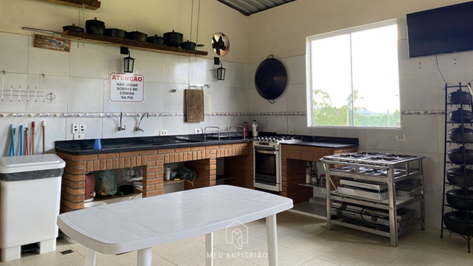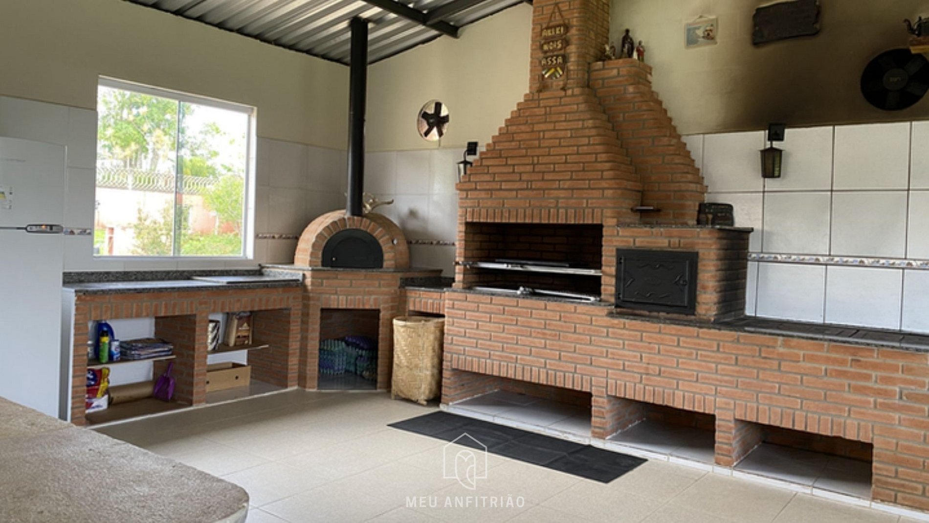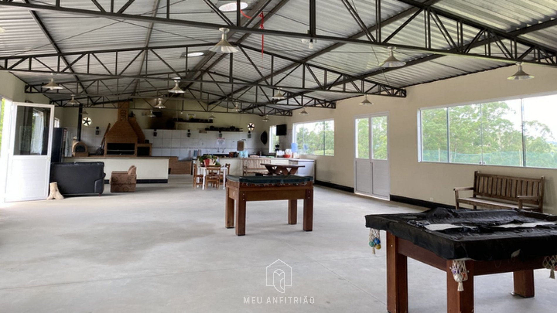 - Salão de festas completo, pensado para reunir família e amigos, com churrasqueira, forno de pizza à lenha, sofás, mesas e cadeiras, além de pebolim e mesa de sinuca para momentos de descontração. O espaço conta ainda com cozinha completa equipada com geladeira, fogão, forno e utensílios necessários para uma estadia confortável.