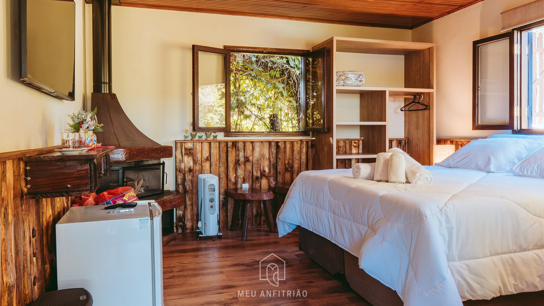Ao entrar no chalé, o hóspede encontrará uma suíte de casal com cama box, mesa bistrô e cadeiras com vista para o jardim, TV Smart, e lareira já preparada para uso.