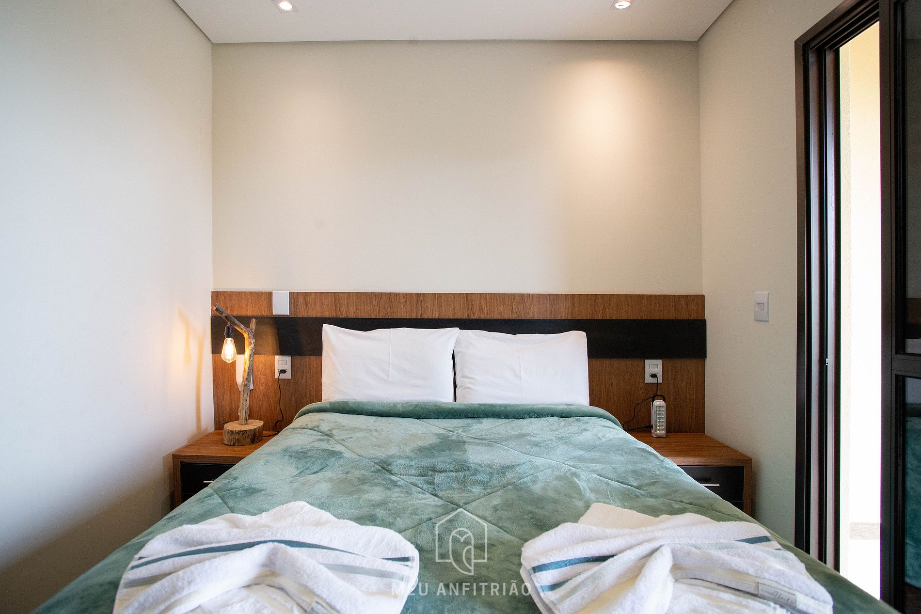 A suíte dispõe de uma cama de casal, mesa para home office, TV Smart, banheiro com chuveiro a gás e ar-condicionado quente e frio. Do lado de fora da suíte, temos uma varanda com mesa para refeições e vista para as montanhas da Serra da Cantareira.