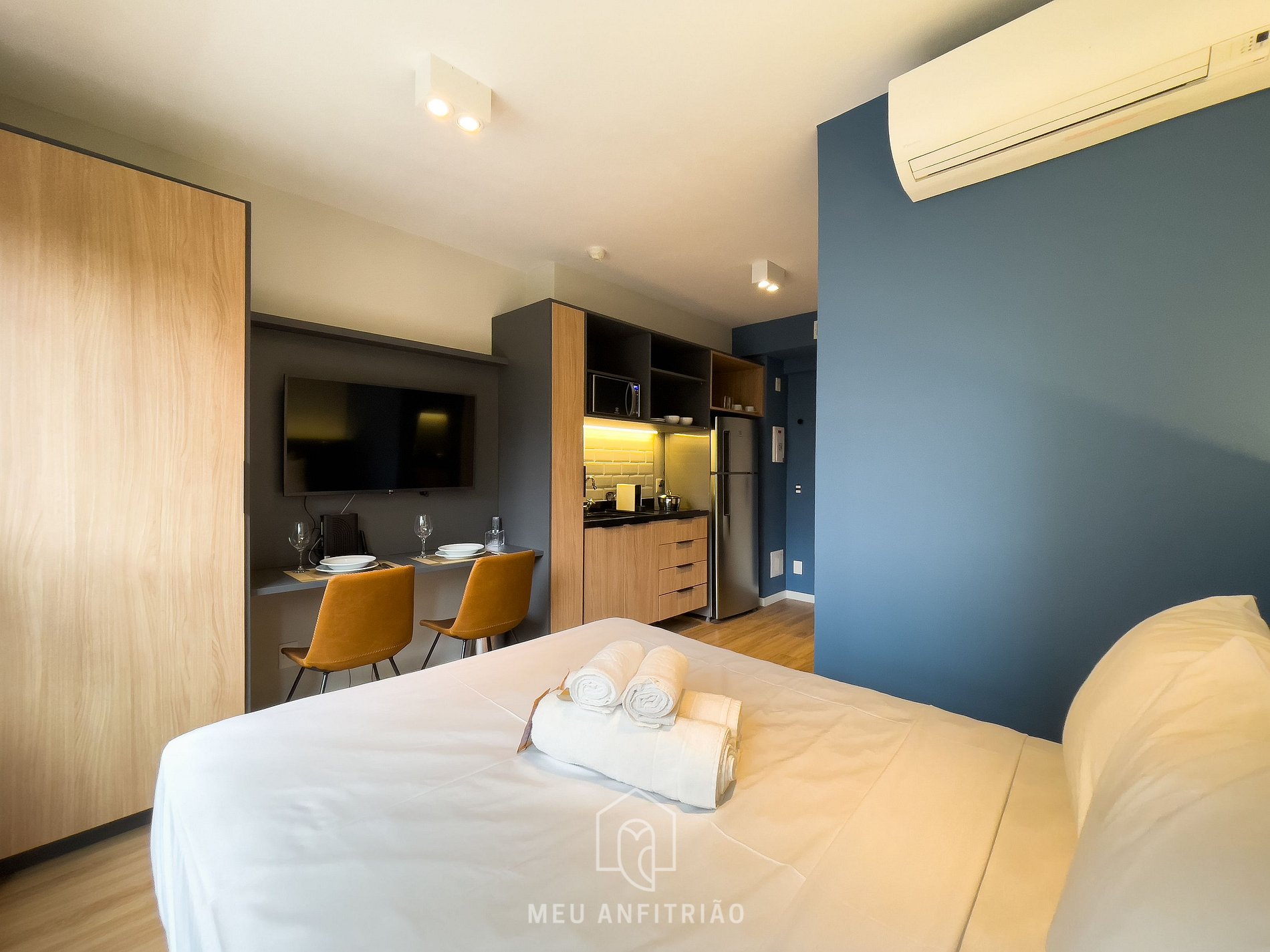 - Ambiente do studio com cama de casal, TV Smart, mesa com cadeiras para refeições ou home office, guarda-roupas, janelas com cortinas blackout, vaporizador e ar-condicionado.