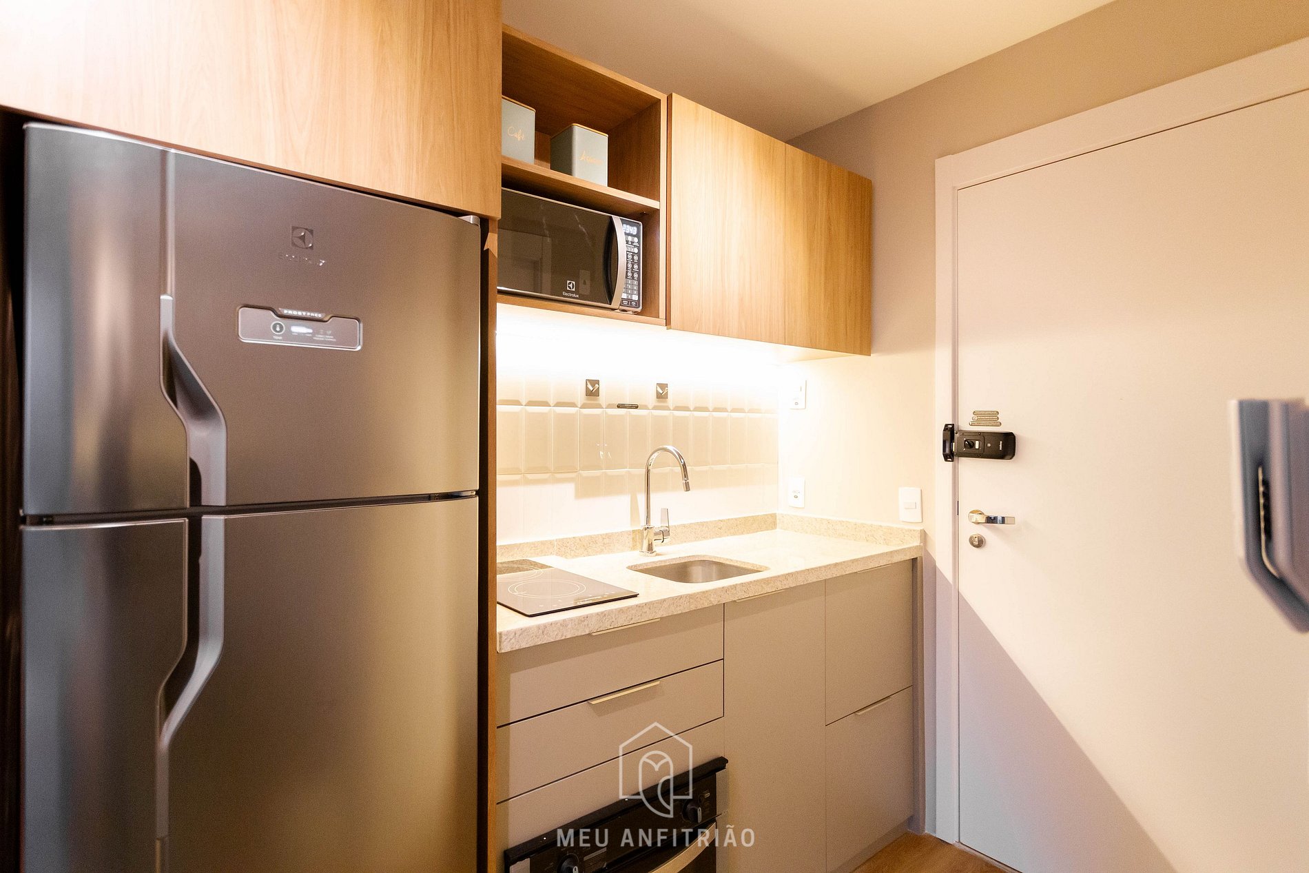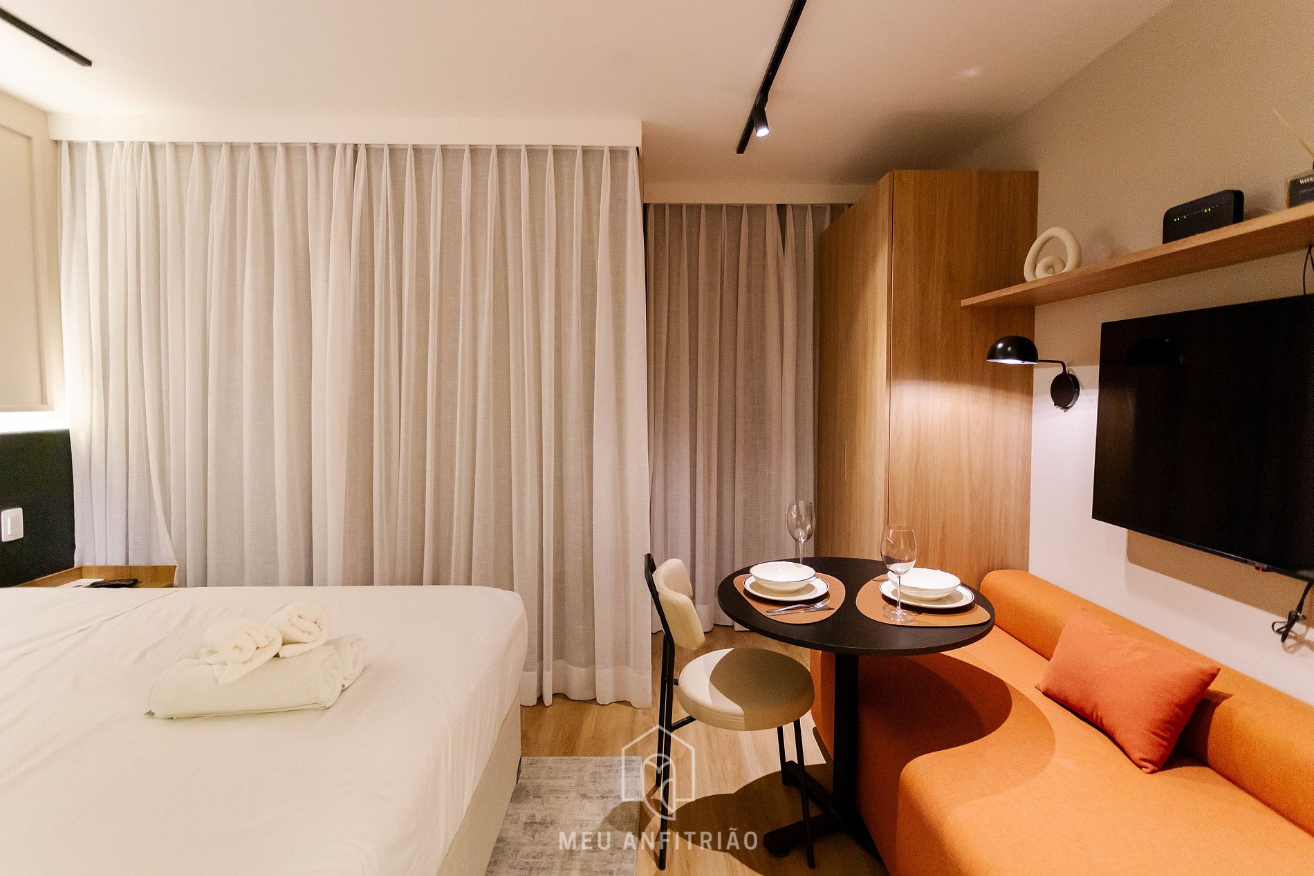 Ao entrar no studio, o hóspede terá acesso à cozinha, que é equipada com todos os utensilios necessários para uma estadia prática, como fogão cooktop por indução, micro-ondas, geladeira, cafeteira elétrica, forno, filtro d'água entre outros. No mesmo ambiente, temos uma cama queen, mesa para refeições ou home office e sofá. Ao lado, temos uma varanda com vista para a cidade, cortinas blackout e porta de vidro com isolamento acústico.