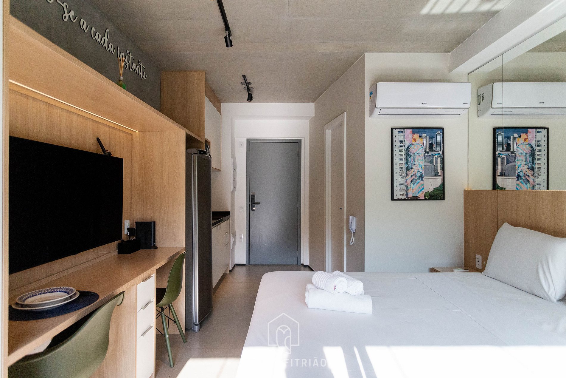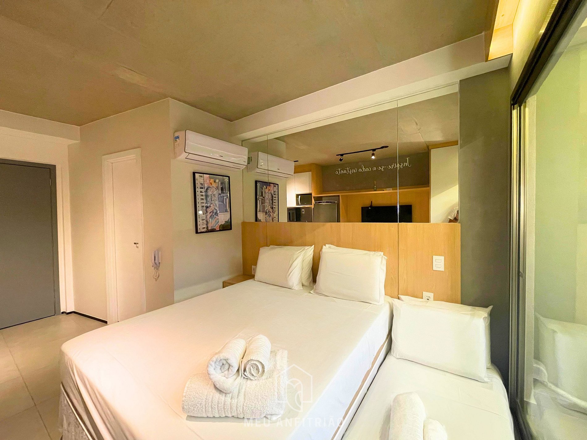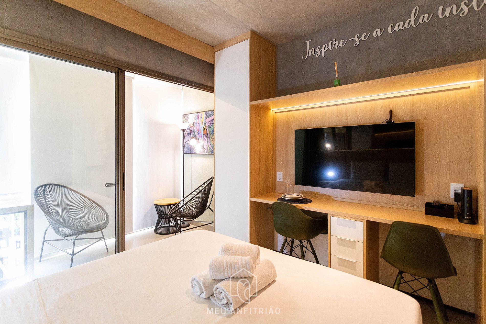 Ao entrar no studio, o hóspede terá acesso à cozinha, que é equipada com todos os utensílios necessários para uma estadia prática, como fogão cooktop, micro-ondas, filtro d’água, cafeteira Dolce Gusto entre outros. No mesmo ambiente, temos uma cama queen com bicama e mesa para home office ou refeições com cadeiras. Uma varanda com porta de vidro divide os espaços. Nela, há uma mesa e duas cadeiras, além de fechamento de vidro com persianas.