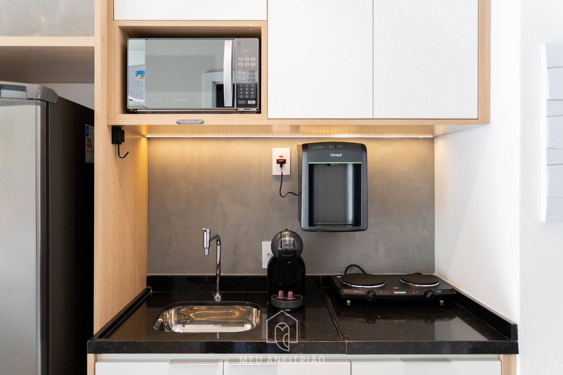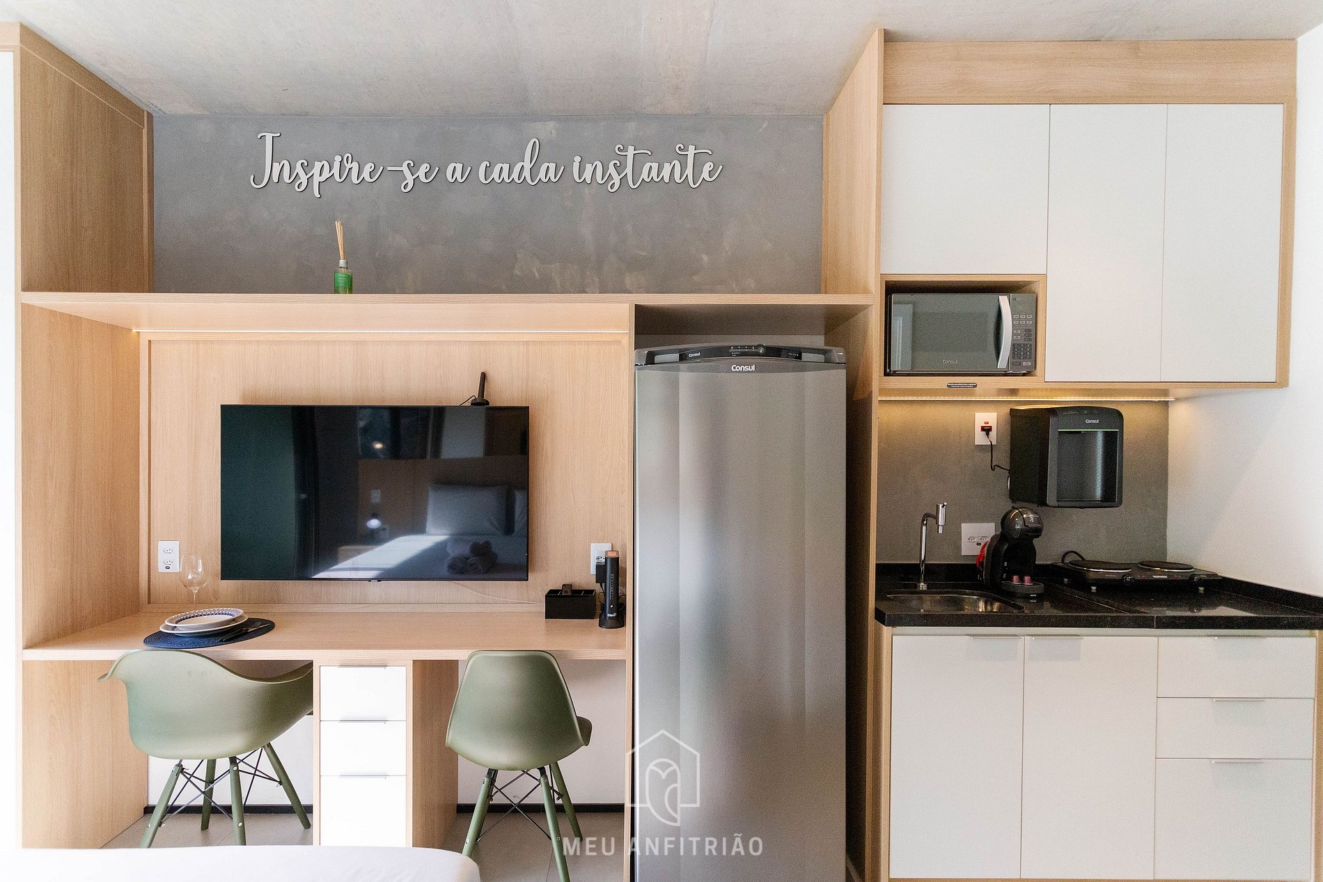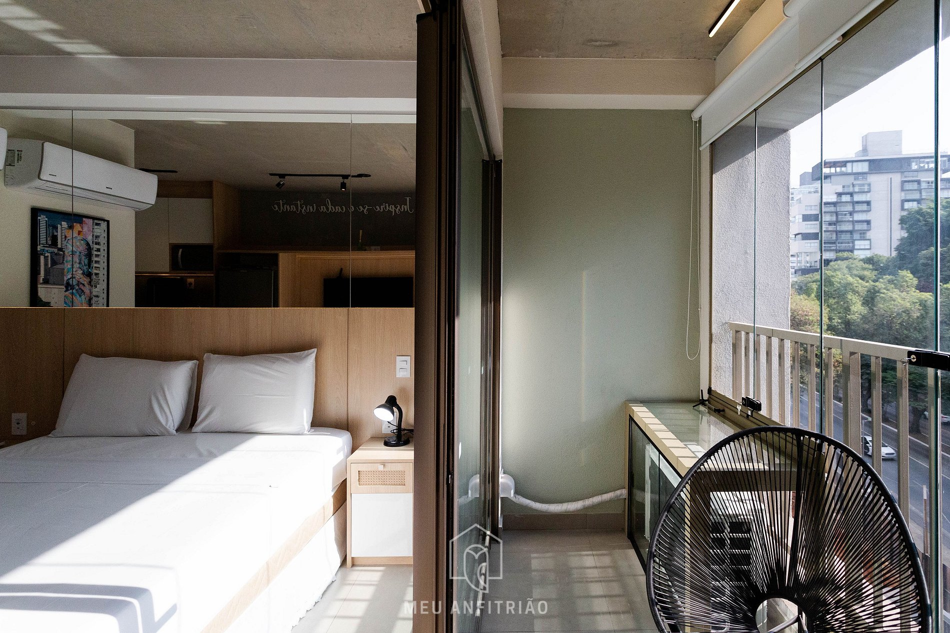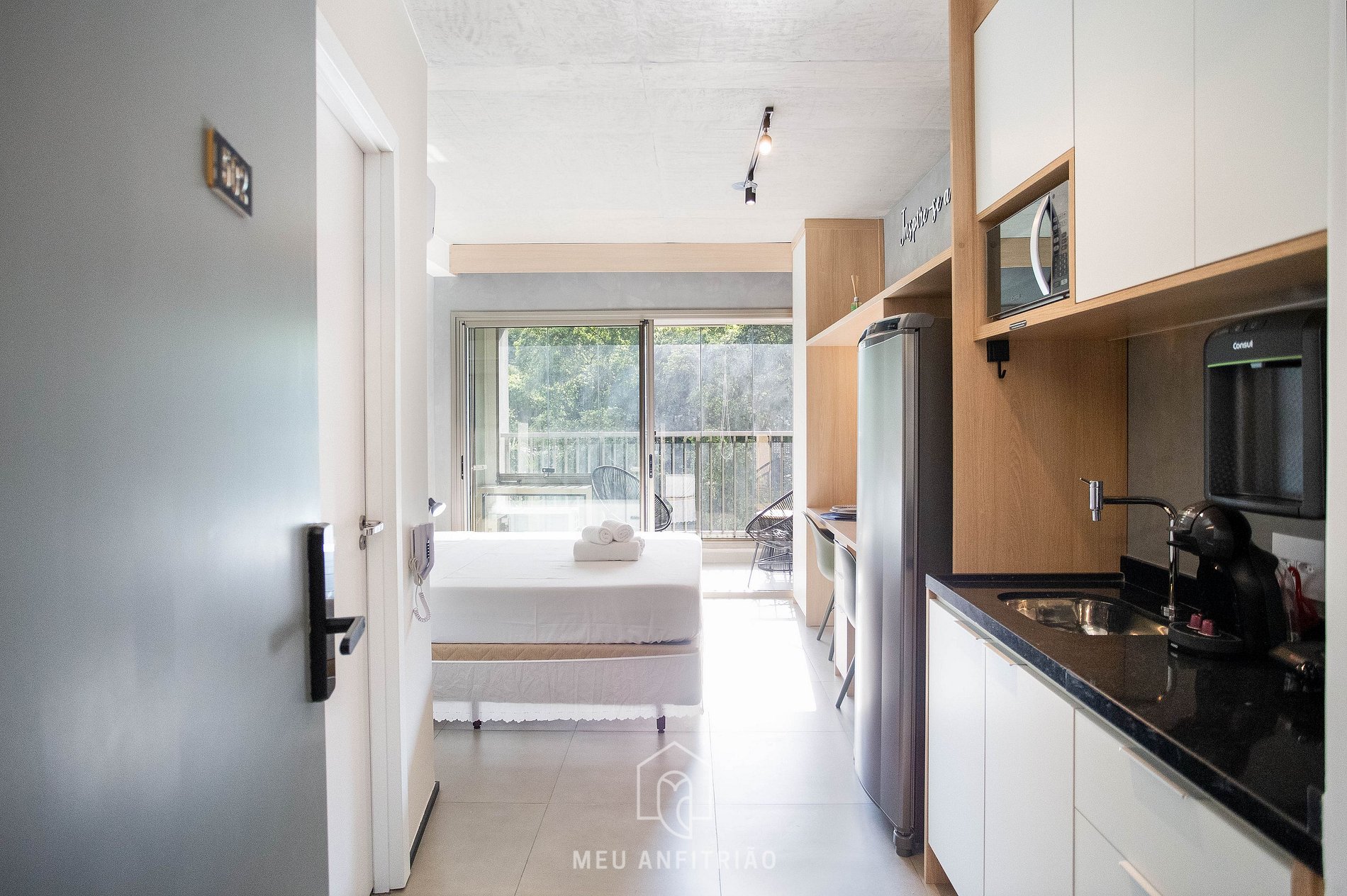 Ao entrar no studio, o hóspede terá acesso à cozinha, que é equipada com todos os utensílios necessários para uma estadia prática, como fogão cooktop, micro-ondas, filtro d’água, cafeteira Dolce Gusto entre outros. No mesmo ambiente, temos uma cama queen com bicama e mesa para home office ou refeições com cadeiras. Uma varanda com porta de vidro divide os espaços. Nela, há uma mesa e duas cadeiras, além de fechamento de vidro com persianas.