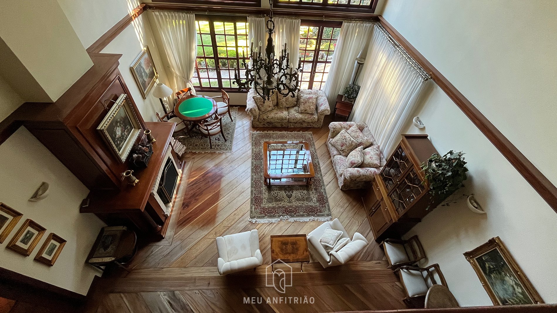 - Salas de convivência amplas com sofás, lareira e mesa de jantar, além de lavabo.