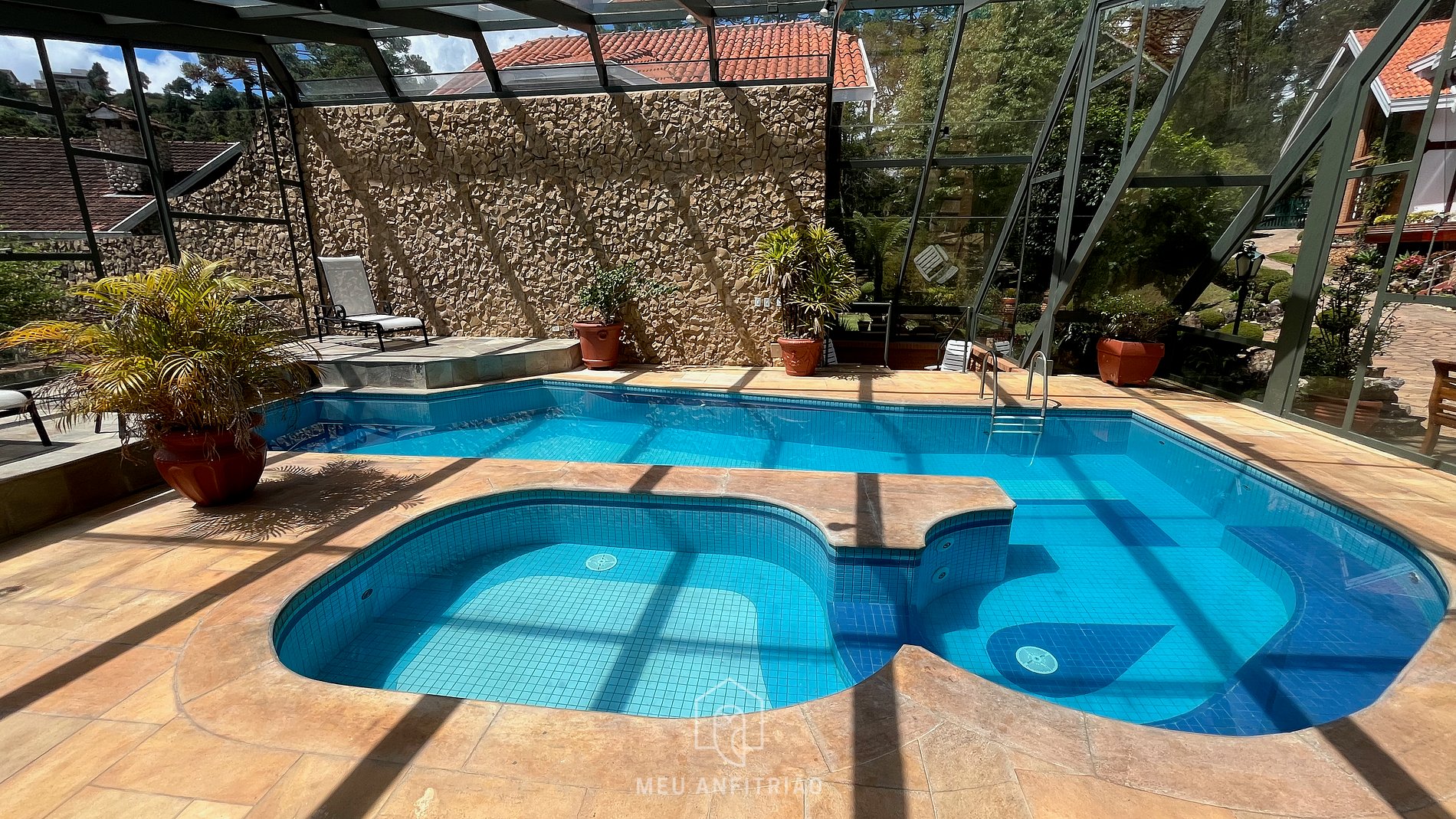- Piscina coberta e aquecida com espreguiçadeiras e sauna seca.