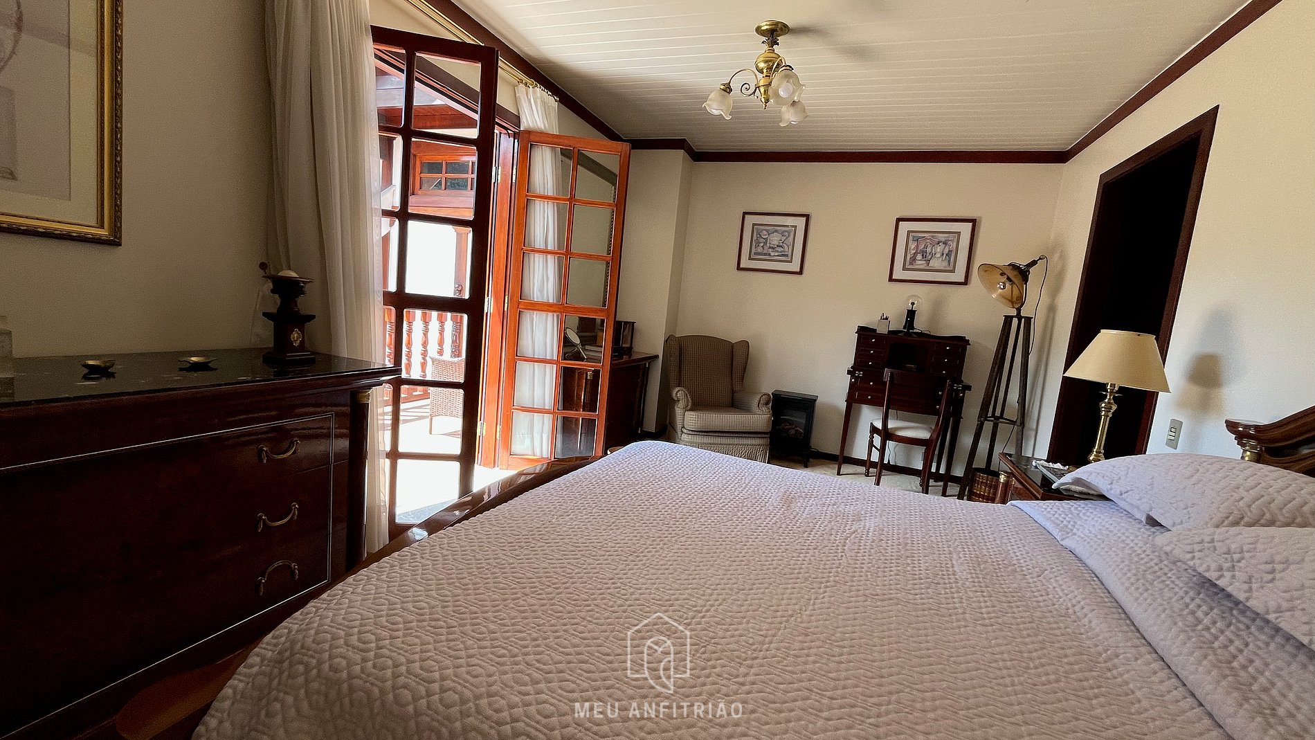 - Suíte 1 com cama de casal e varanda com vista para as montanhas.