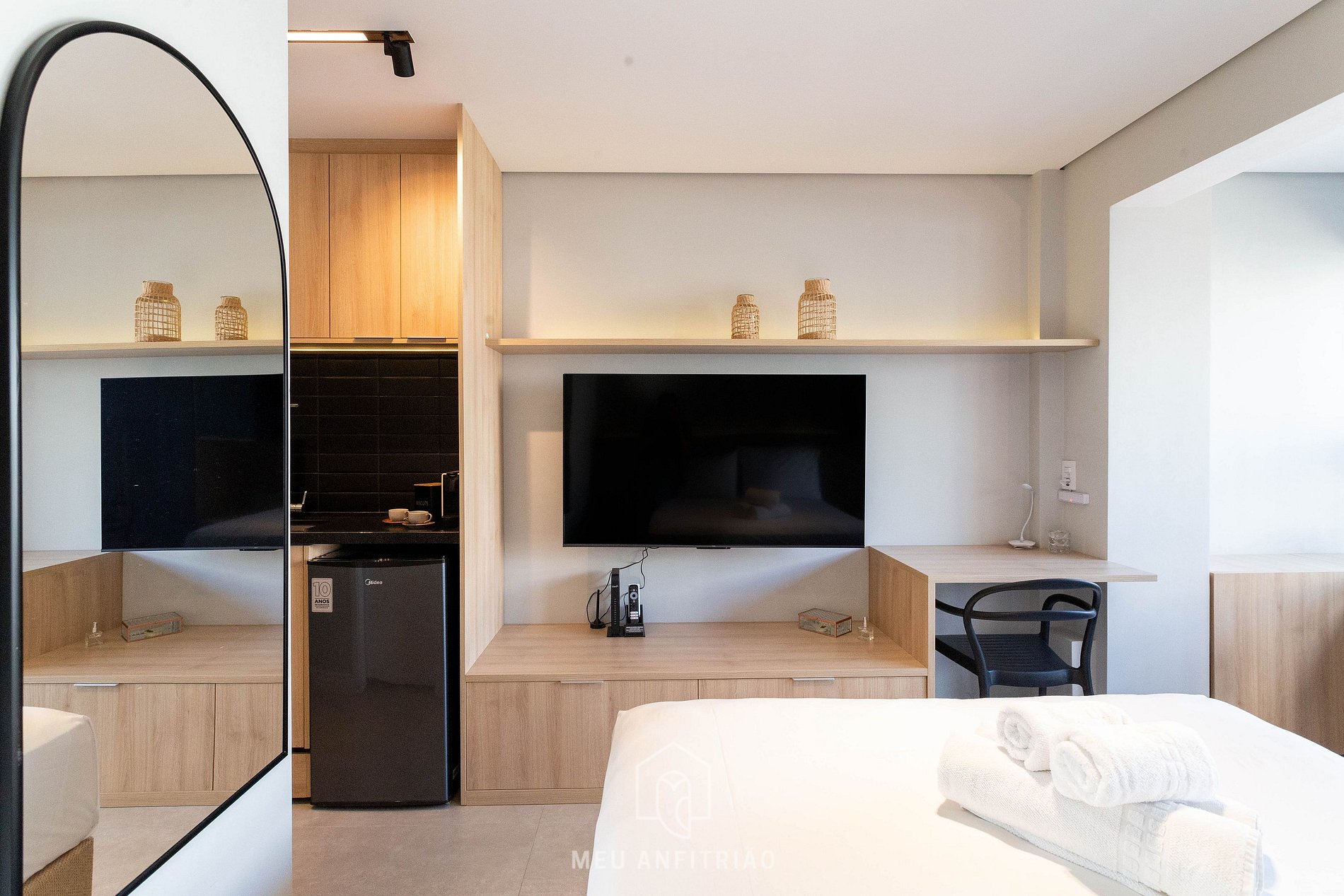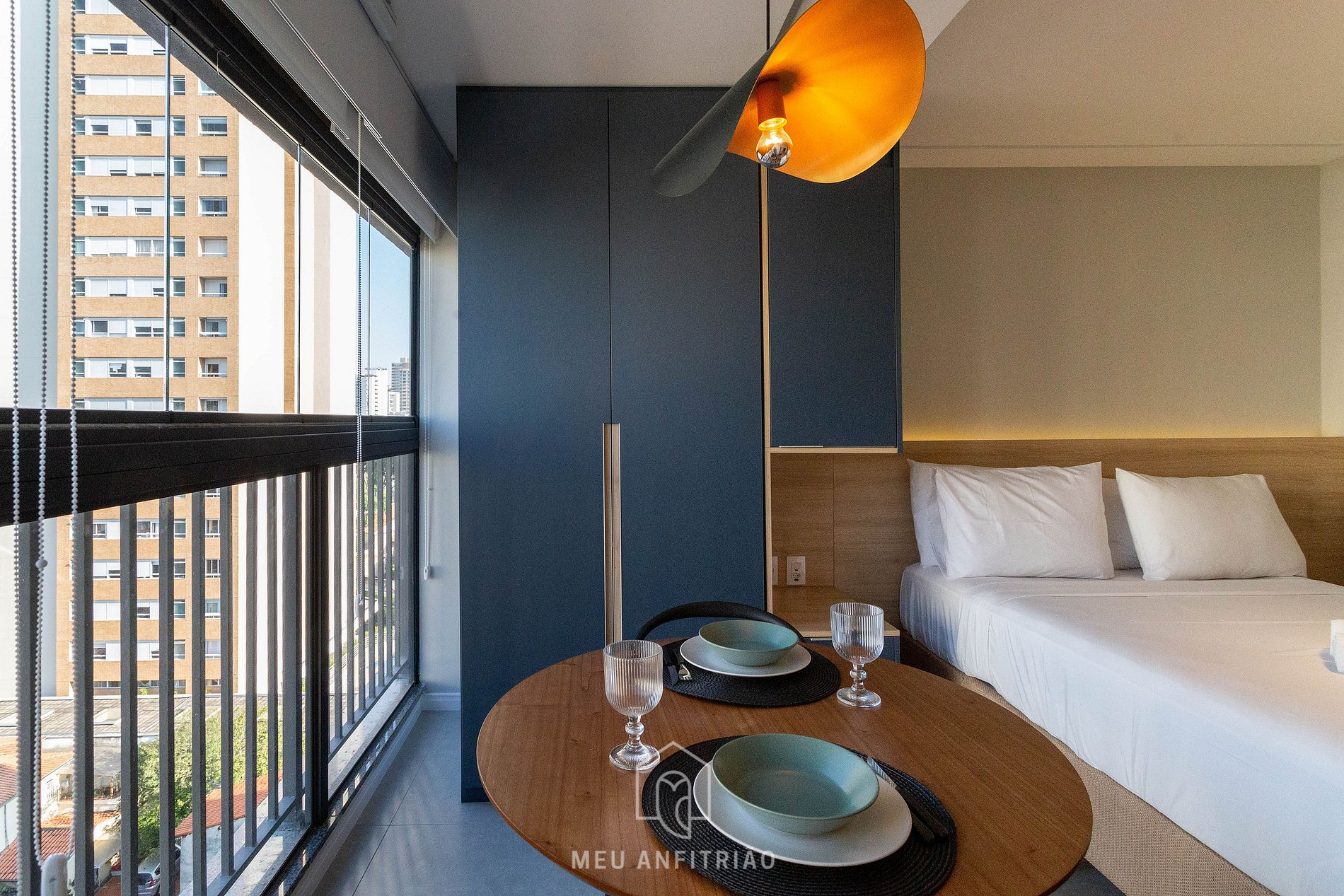 Ao entrar no espaço, o hóspede terá à disposição uma cozinha com os utensílios necessários para uma estadia prática como frigobar, micro-ondas, coifa, fogão cooktop, filtro d’água, cafeteira Nespresso, cafeteira elétrica, air fryer entre outros, além de uma máquina de lavar louças. A varanda é integrada ao studio, e possui mesa para refeições, janelas de vidro, persianas blackout e vista para a cidade.