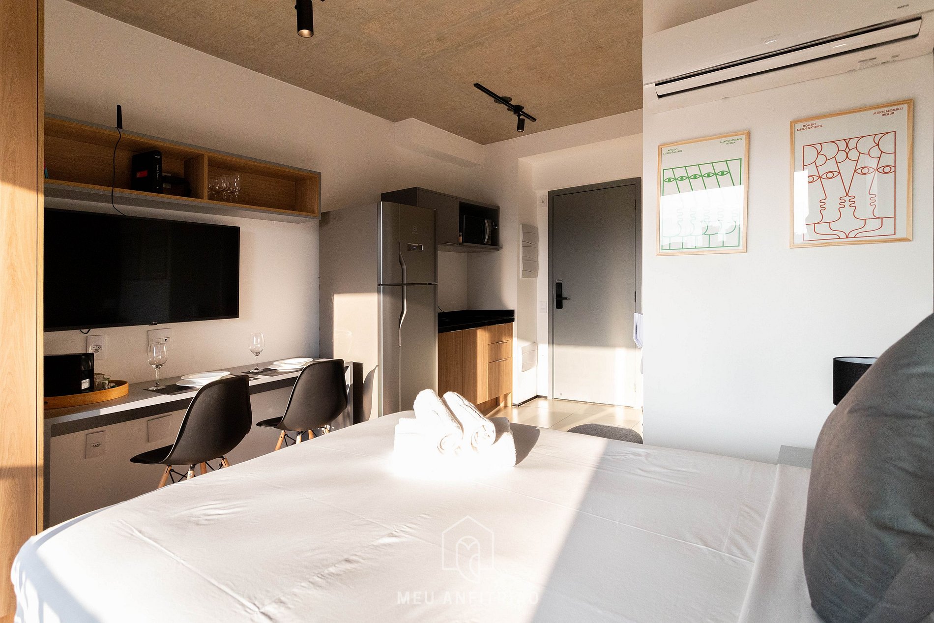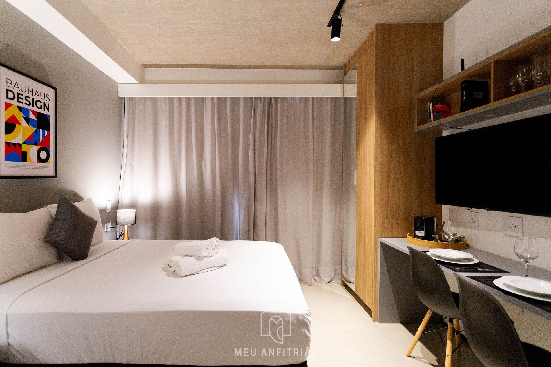 Nosso studio oferece conforto e praticidade em um espaço de 23m², ideal para até 2 pessoas. O espaço conta com uma cama de casal aconchegante e está localizado em um condomínio seguro, com portaria presencial 24h.