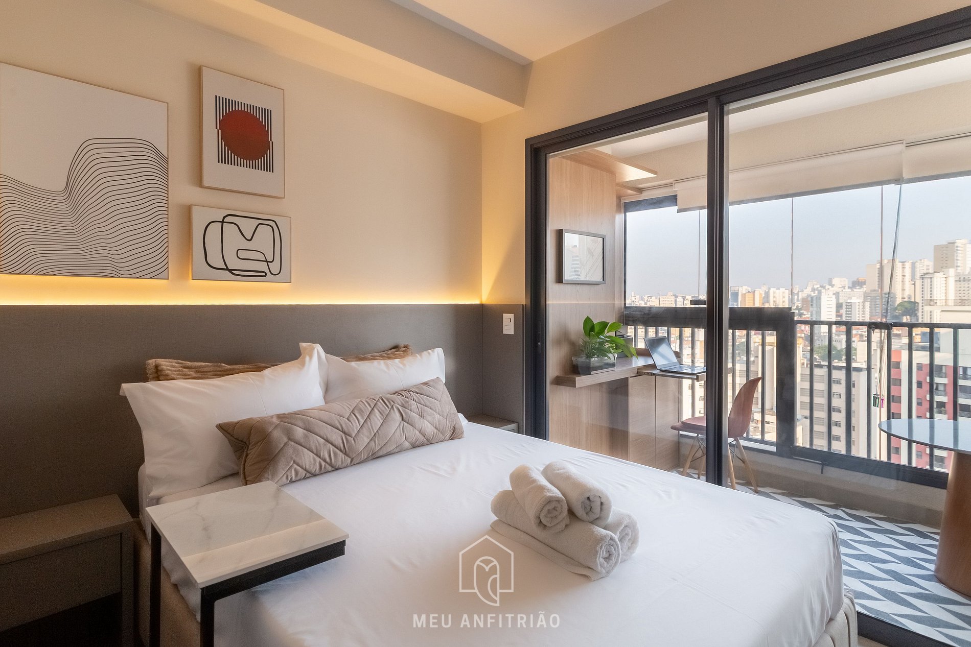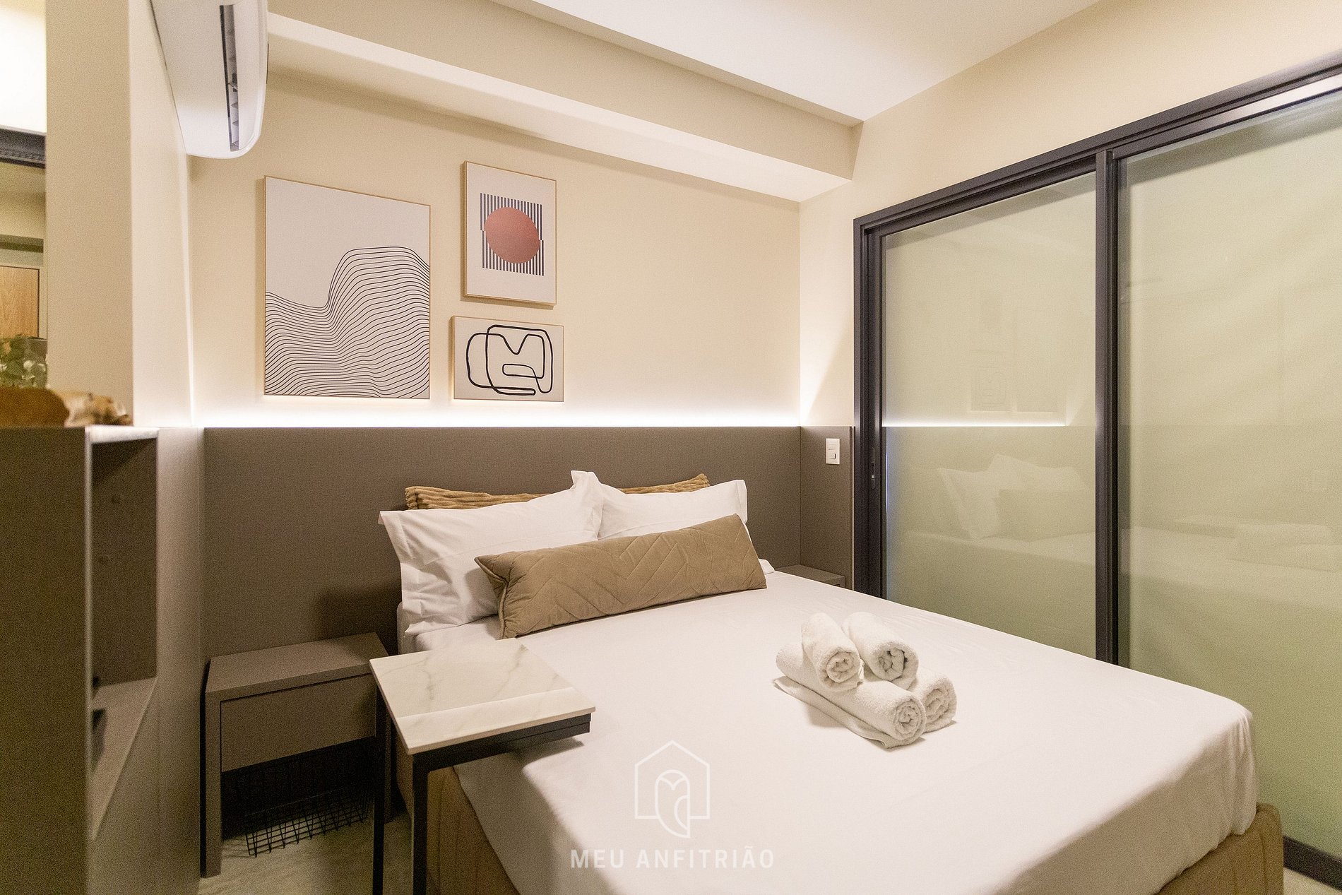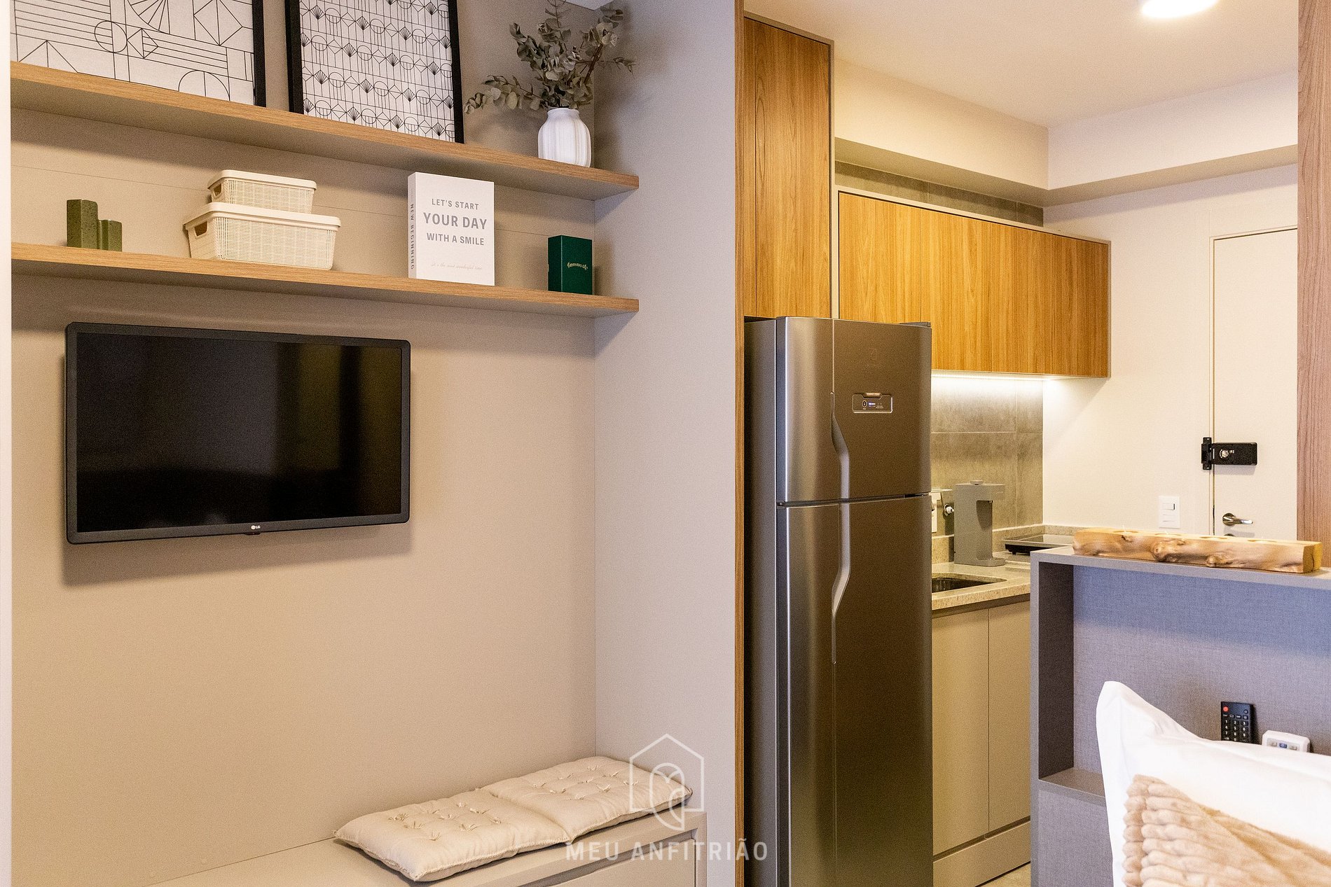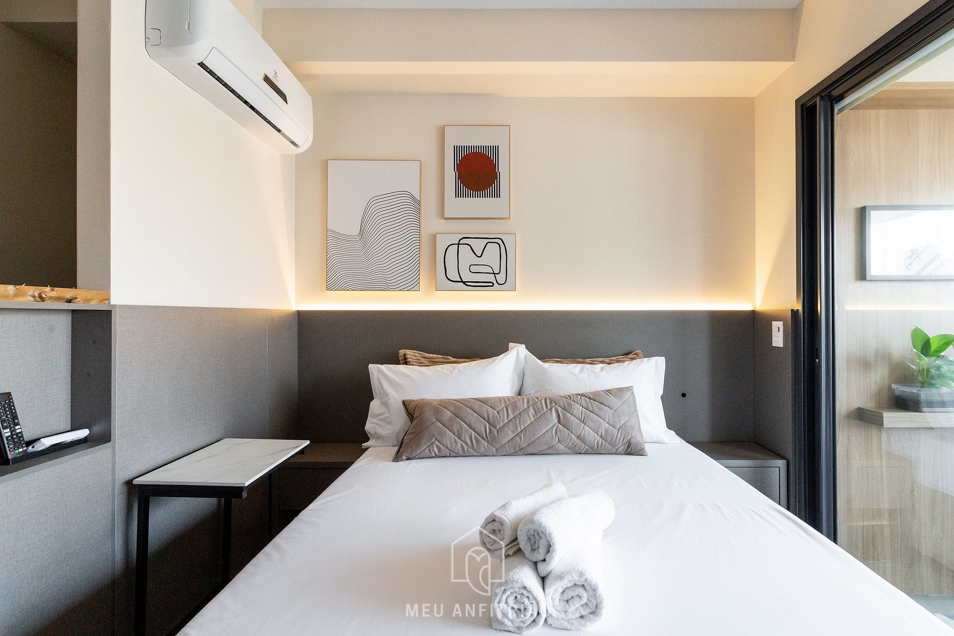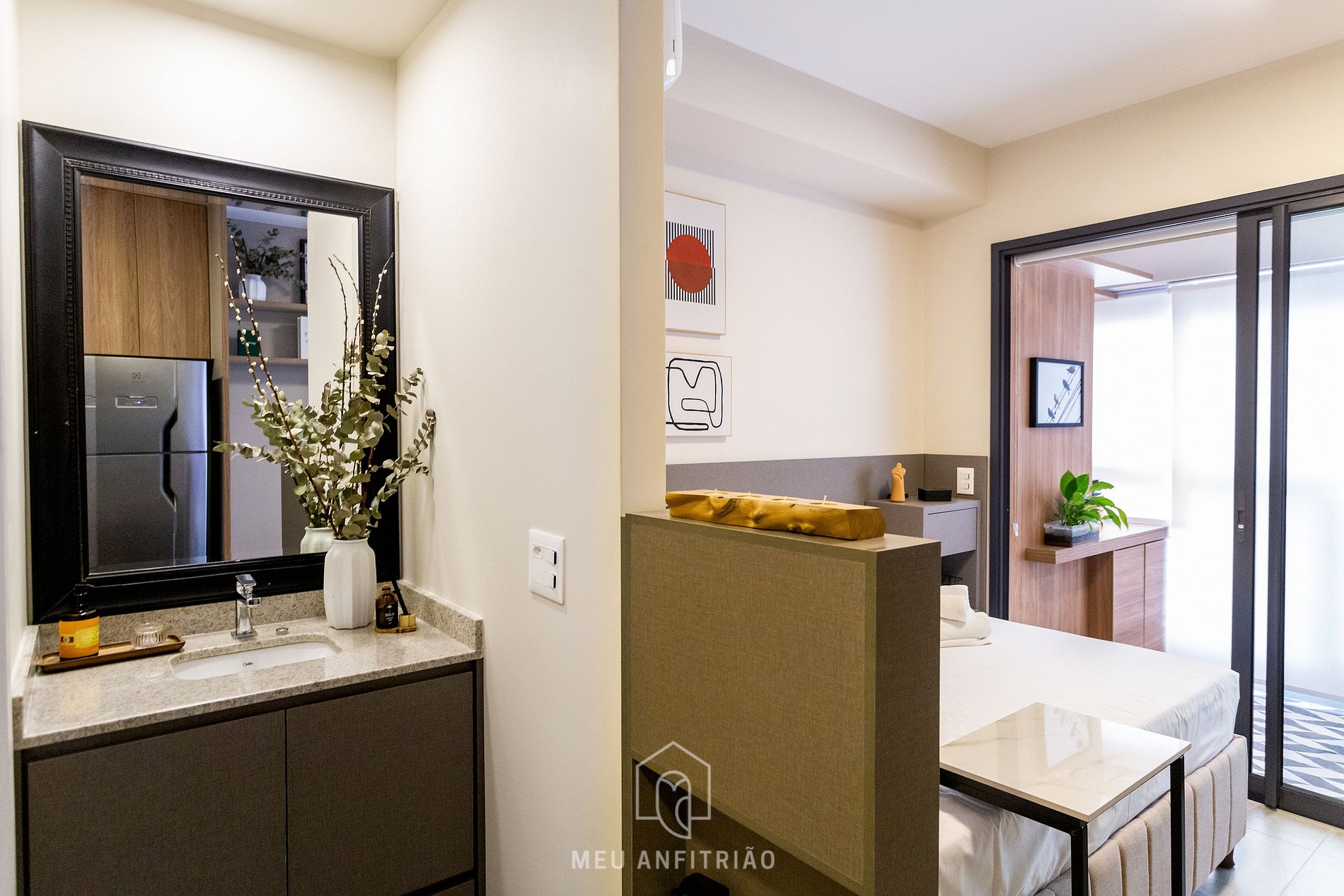 O ambiente do studio é em conceito aberto, bem decorado e aconchegante. Acomoda até 3 pessoas em cama de casal no quarto (com blackout) e sofá-cama para 1 pessoa na varanda (com fechamento de vidro e persiana).