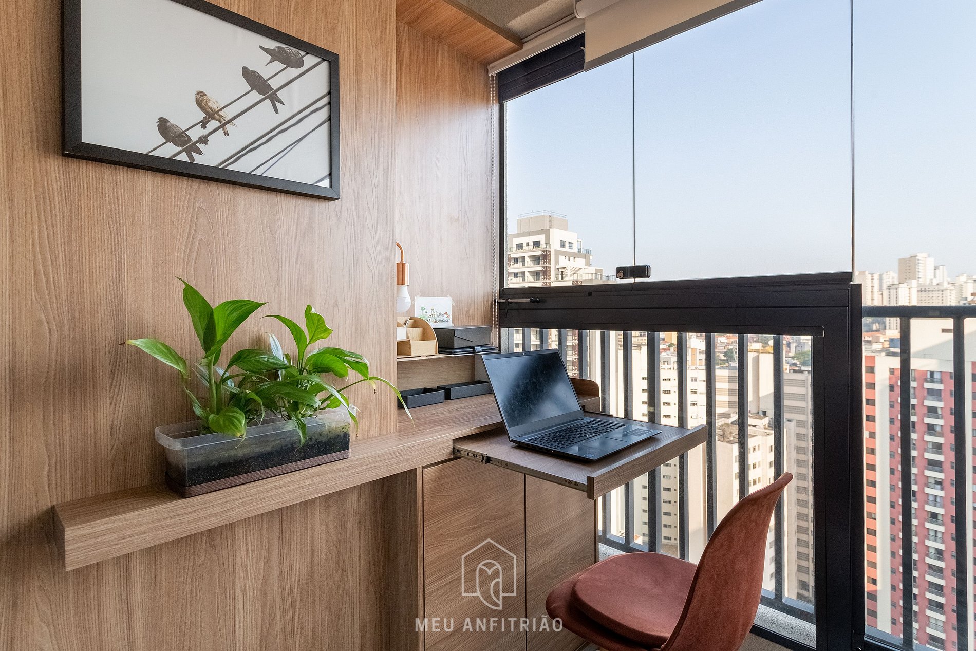 Uma varanda com porta de vidro separa os espaços. No local, há uma mesa com sofazinho e cadeira para fazer refeições e uma escrivaninha para home office. O espaço conta com cortina blackout para maior comodidade.