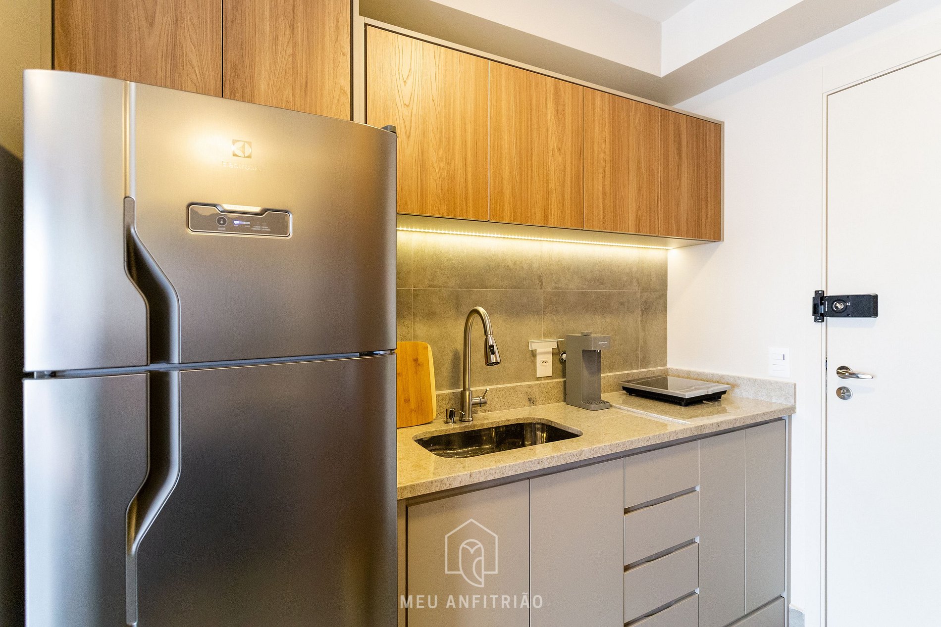 No mesmo ambiente dispomos de uma cozinha com utensílios necessários para uma estadia prática, banheiro, armário, mesinha de apoio e TV Smart.