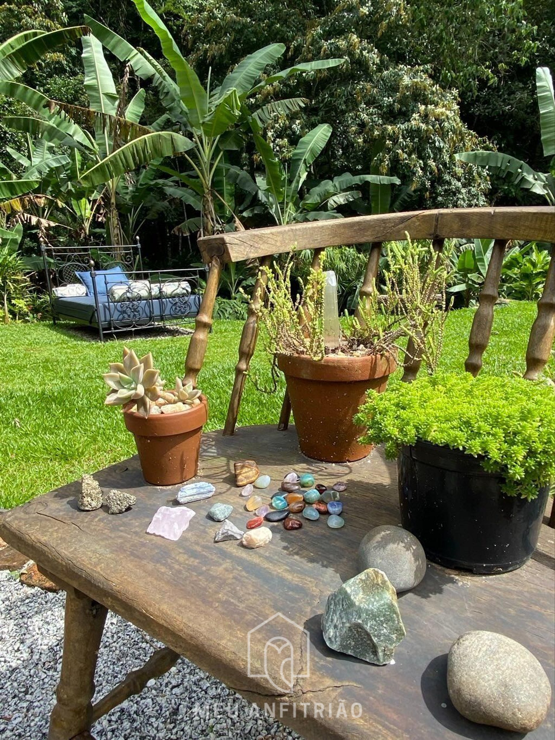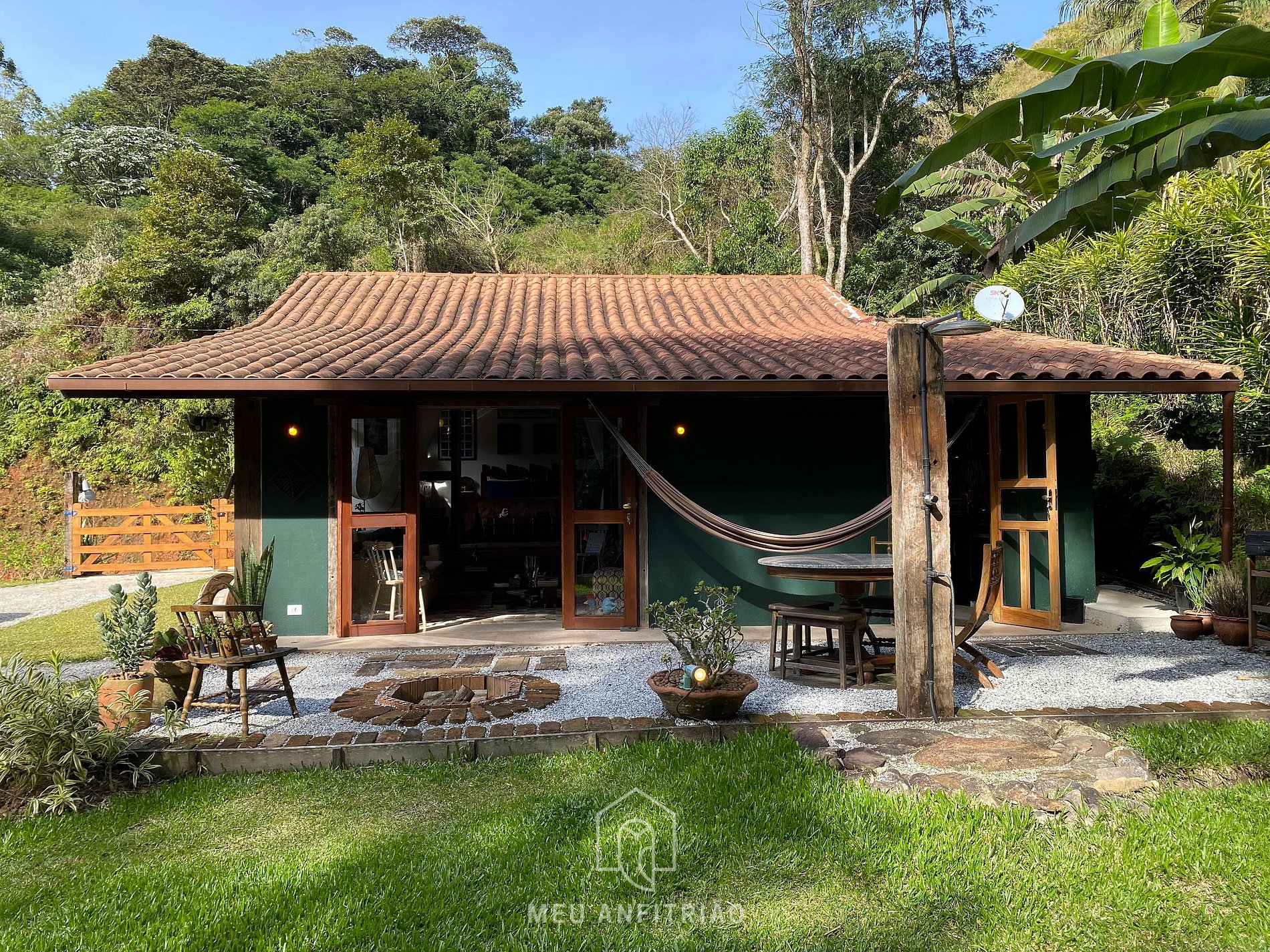 Ao chegar ao sítio, o hóspede é recebido por um jardim amplo que reúne diferentes espaços de lazer e contato com a natureza. A área conta com fogueira, churrasqueira, um córrego com queda d’água, chuveirão, varal e uma cama inglesa de ferro antiga com colchão acquablock para aproveitar o sol e ler um livro com momentos de descanso ao ar livre, além de mesa e cadeiras para aproveitar o ambiente externo.