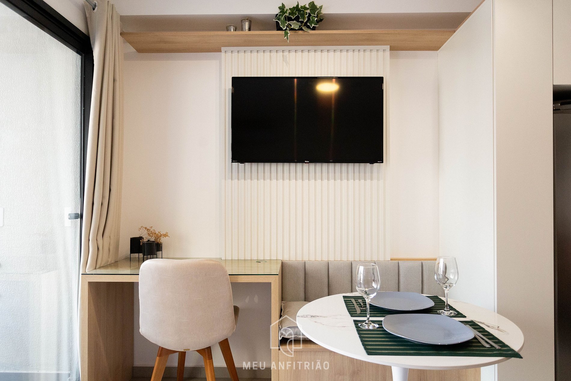 Também contamos com mesas e cadeiras para refeições ou home office dentro do studio, ar-condicionado, aquecedor elétrico, WI-FI de alta velocidade, TV Smart e banheiro com chuveiro a gás.