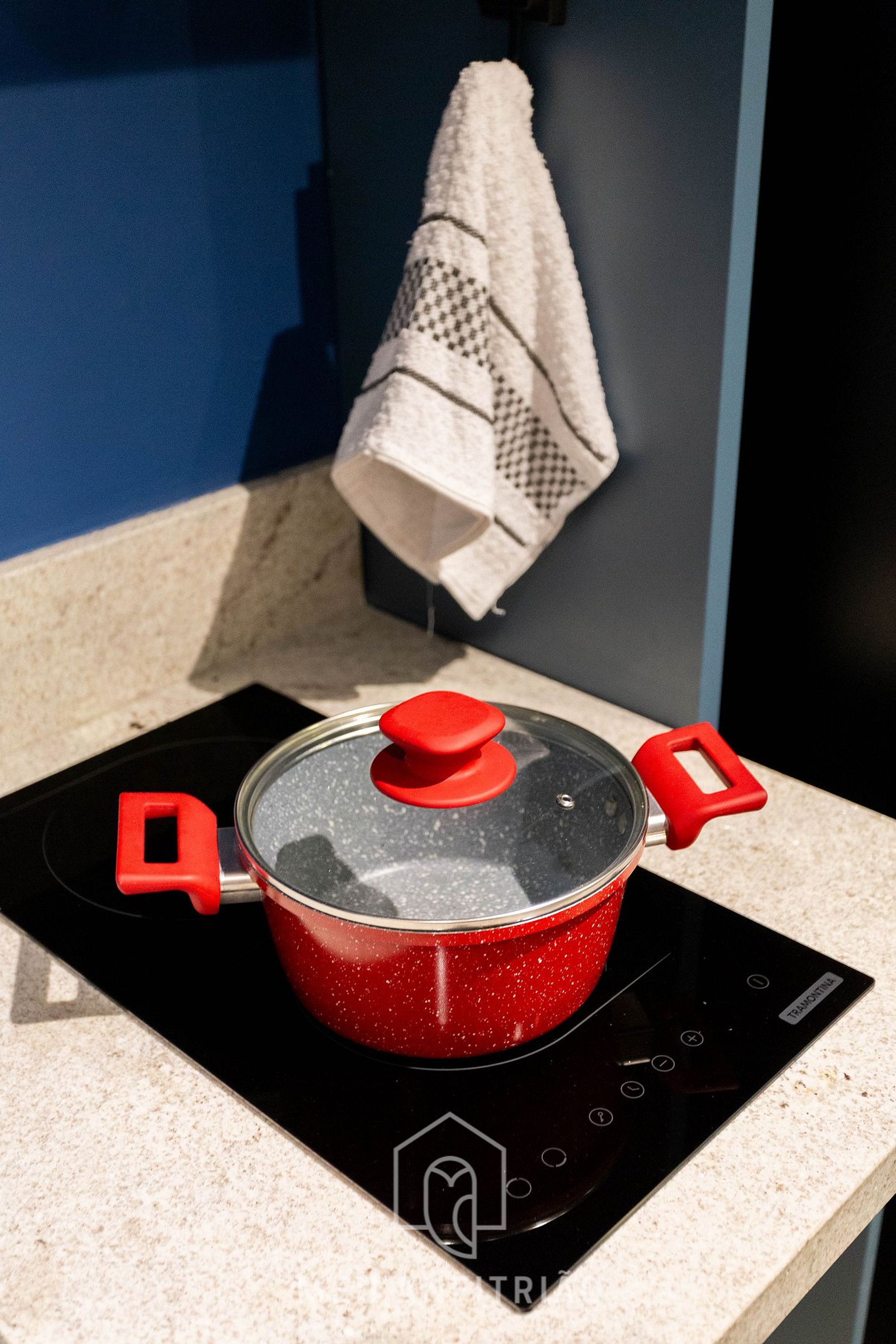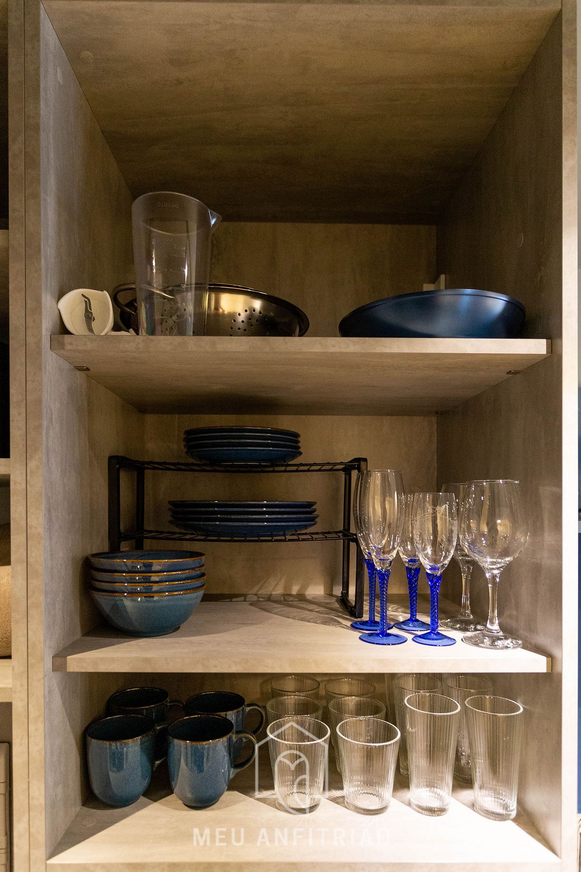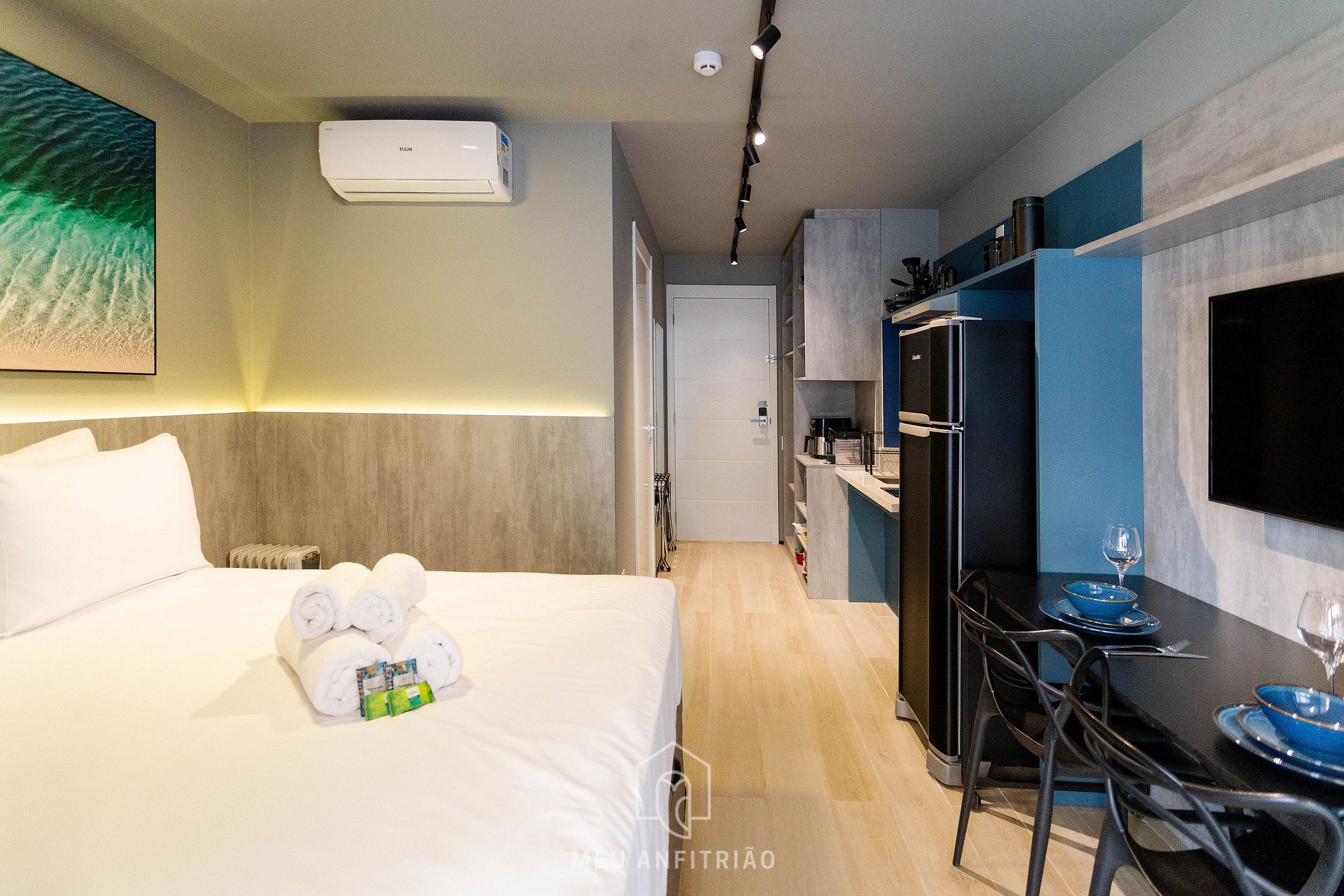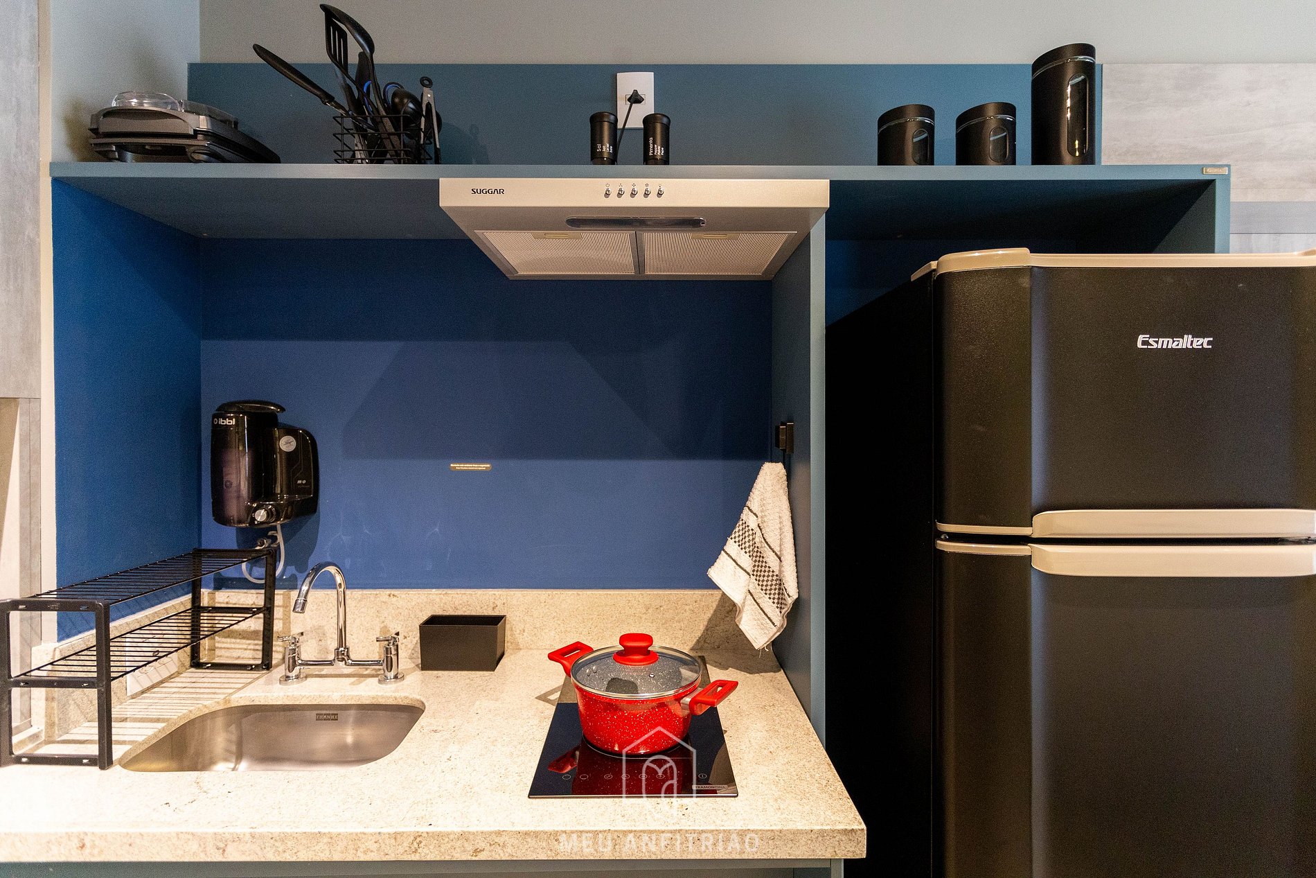 Ao entrar no studio, o hóspede terá acesso à cozinha, que conta com os utensílios necessários para a estadia, como geladeira, fogão cooktop, micro-ondas, filtro d’água, cafeteira Nespresso, air fryer, liquidificador entre outros. Uma varanda com porta de vidro e duas cadeiras divide os espaços.