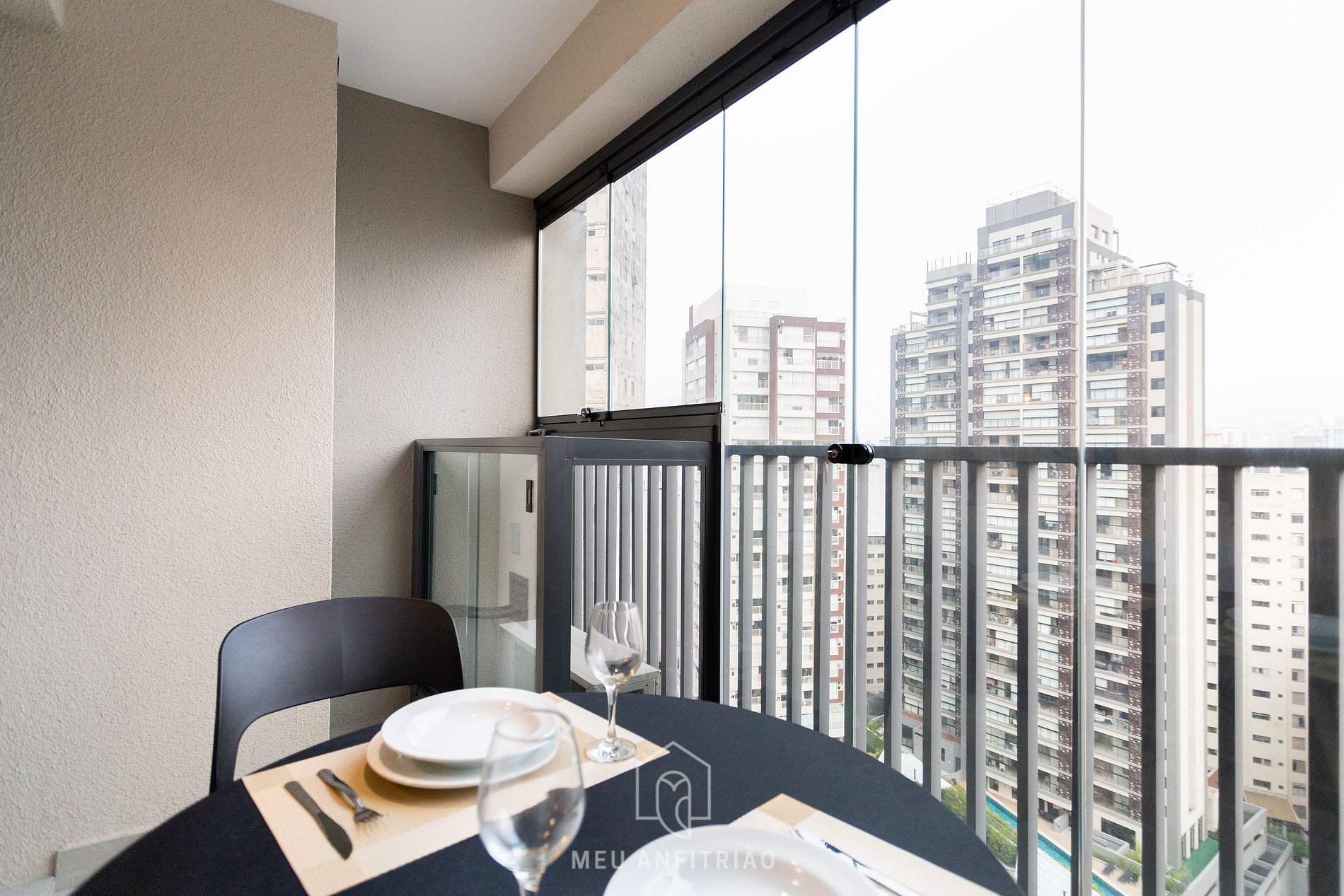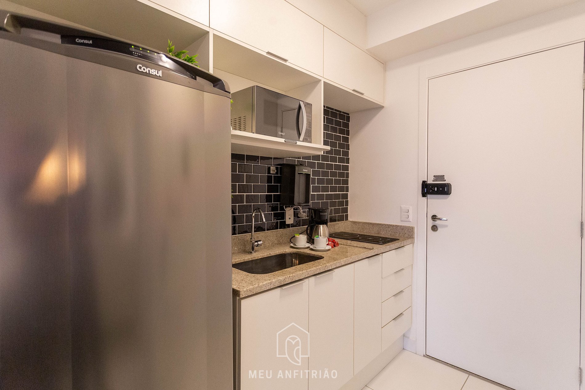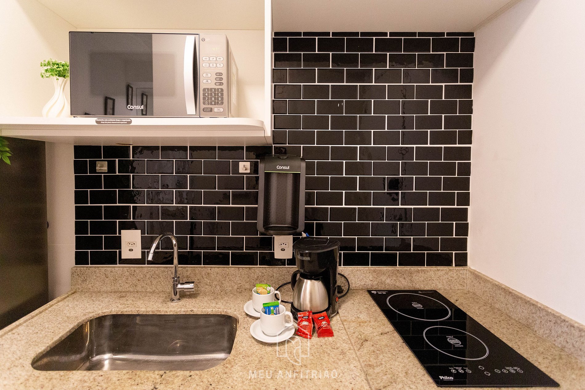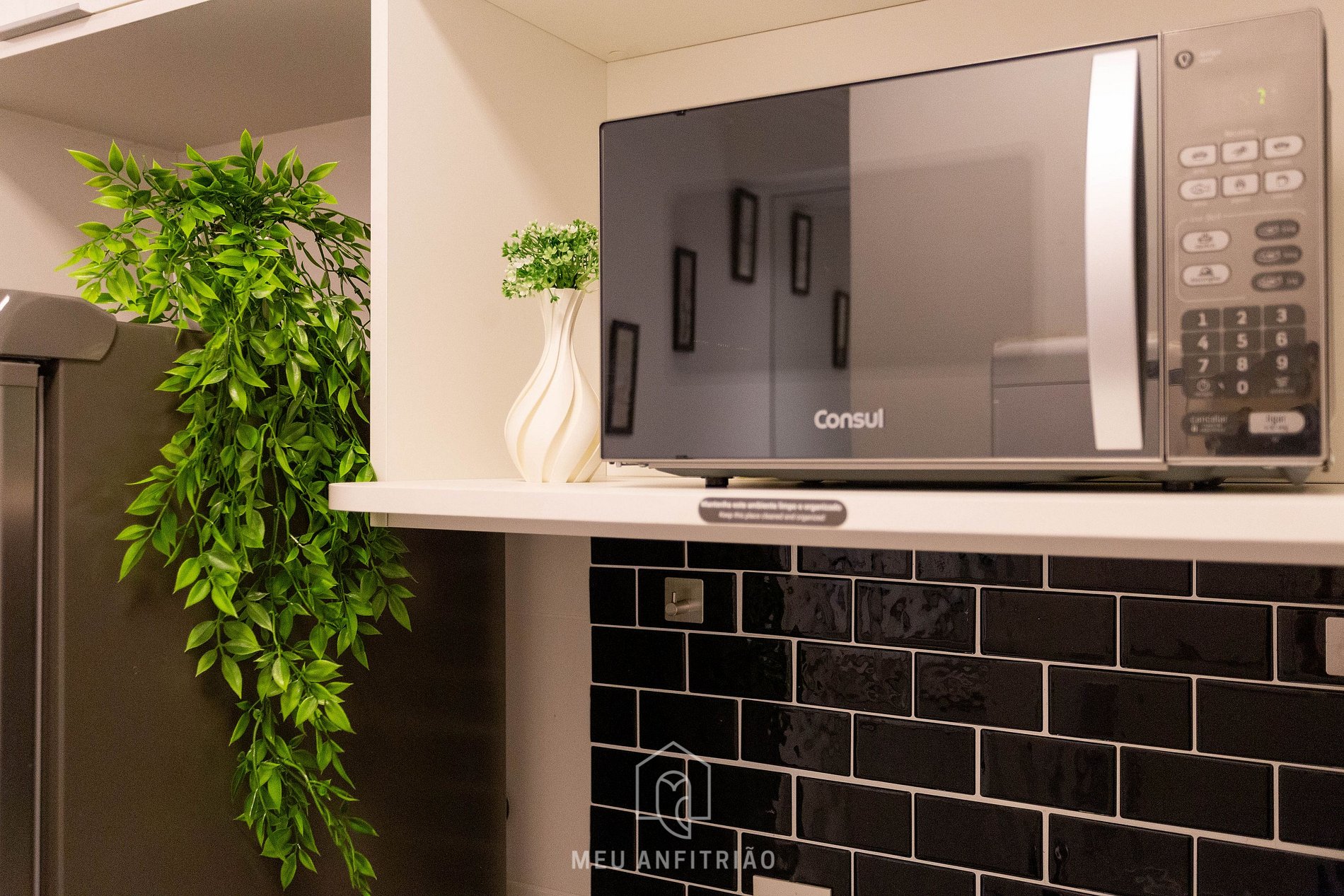 Ao entrar, o hóspede terá acesso à cozinha, que conta com os utensílios necessários para a estadia, como geladeira, fogão cooktop, micro-ondas, filtro d’água, liquidificador, sanduicheira entre outros. Uma varanda com porta de vidro divide os espaços. Nela, há uma mesa com cadeiras e vista para a cidade.