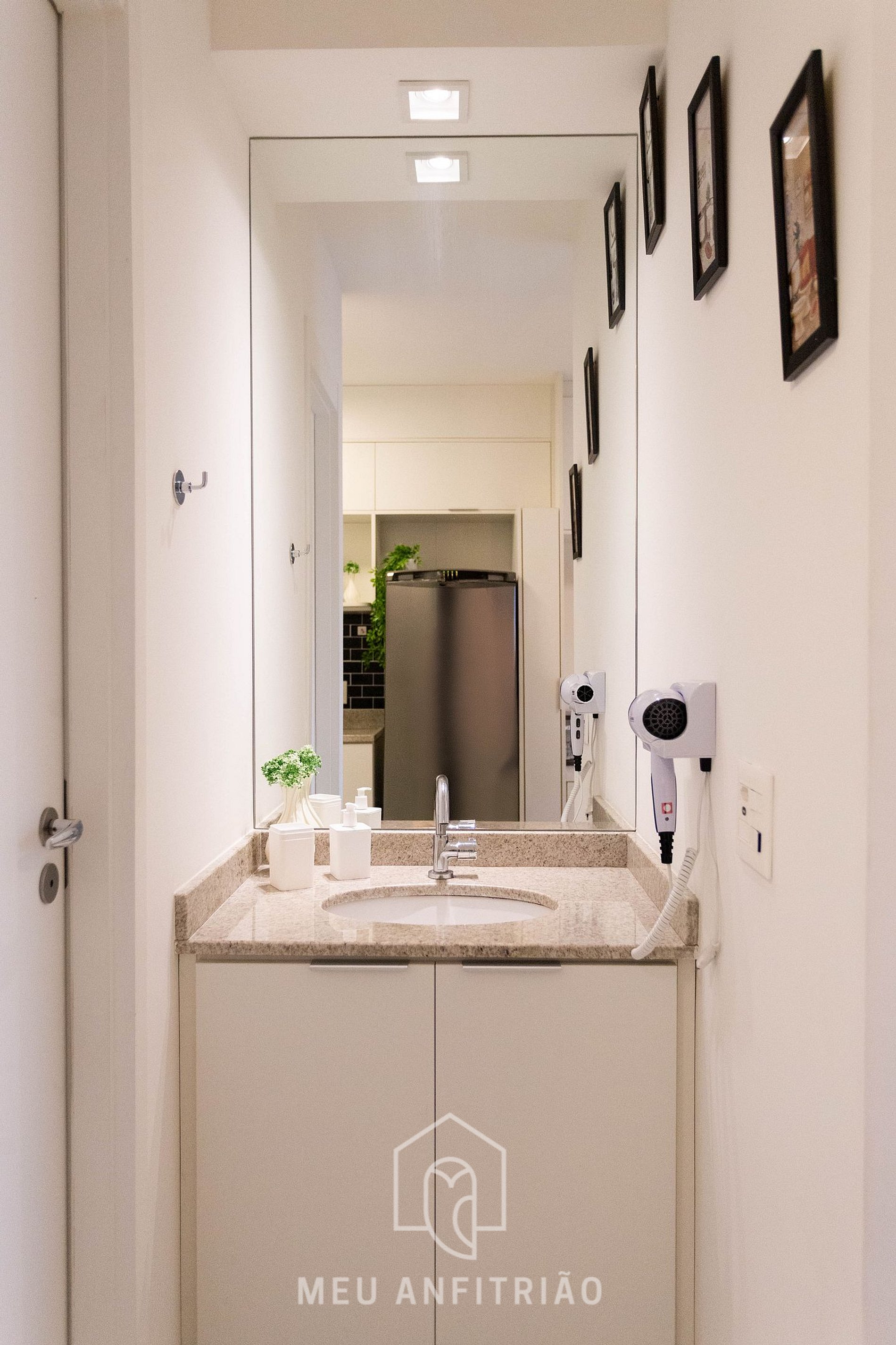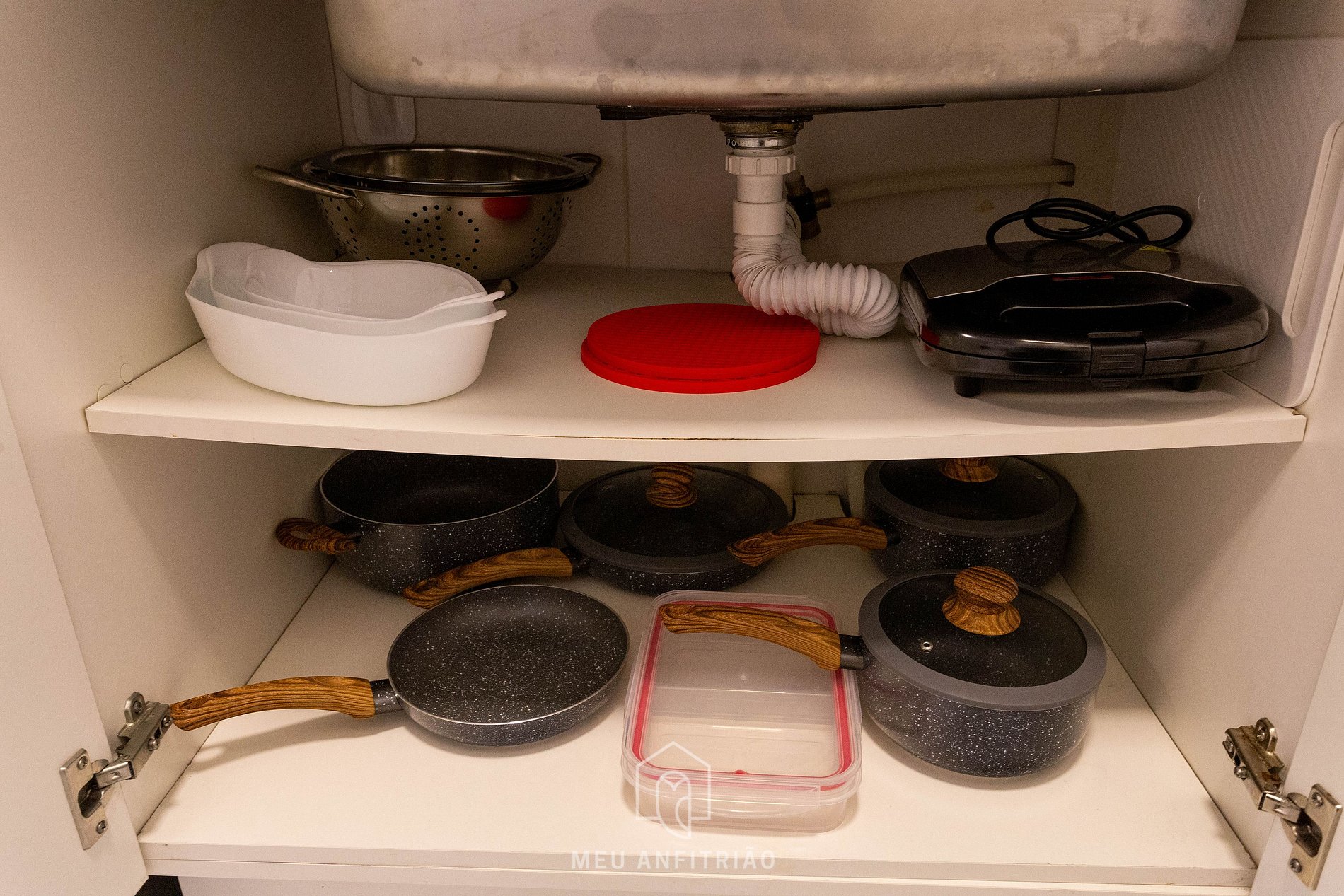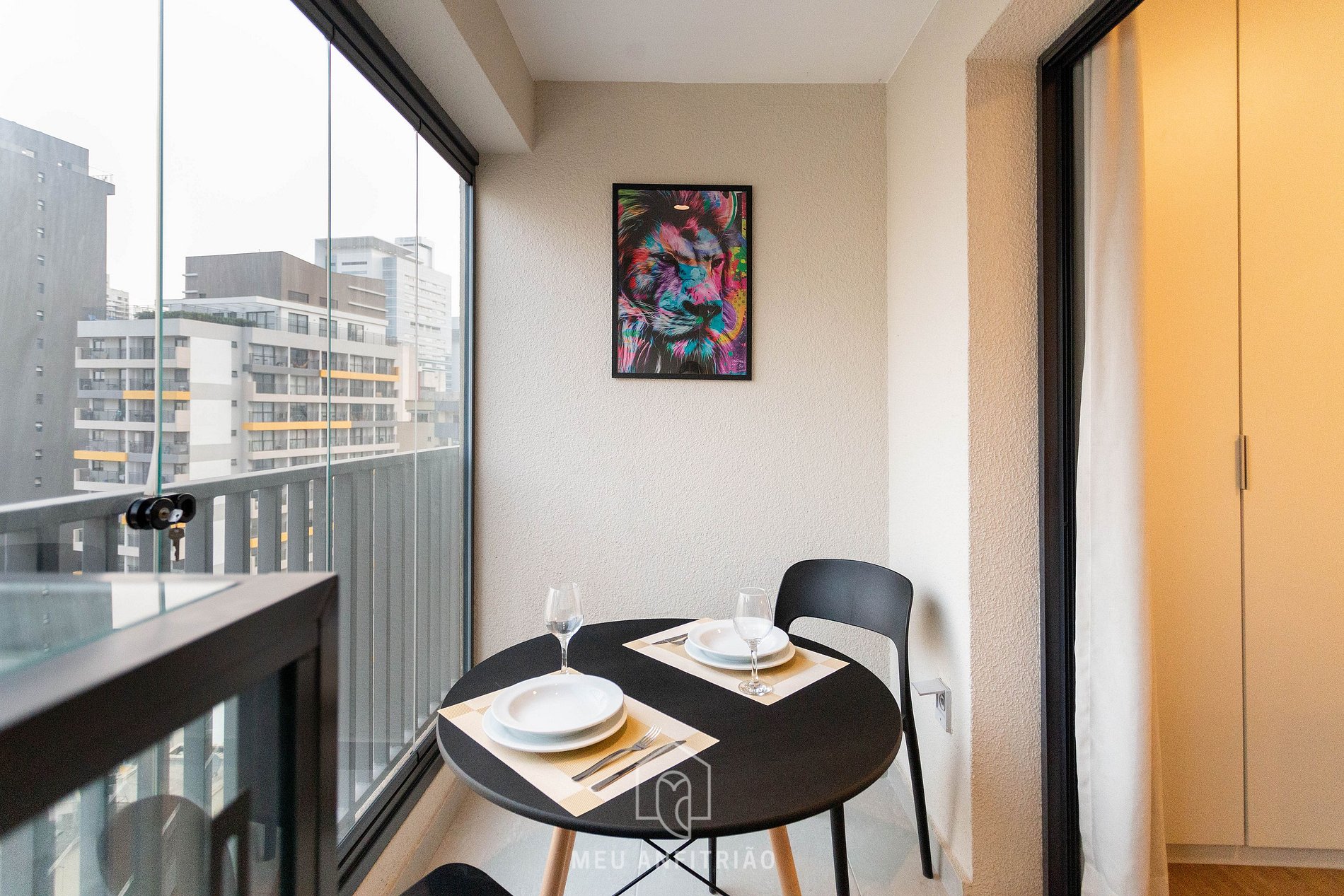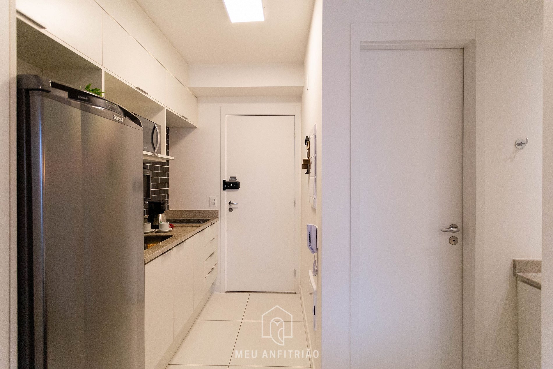 Ao entrar, o hóspede terá acesso à cozinha, que conta com os utensílios necessários para a estadia, como geladeira, fogão cooktop, micro-ondas, filtro d’água, liquidificador, sanduicheira entre outros. Uma varanda com porta de vidro divide os espaços. Nela, há uma mesa com cadeiras e vista para a cidade.