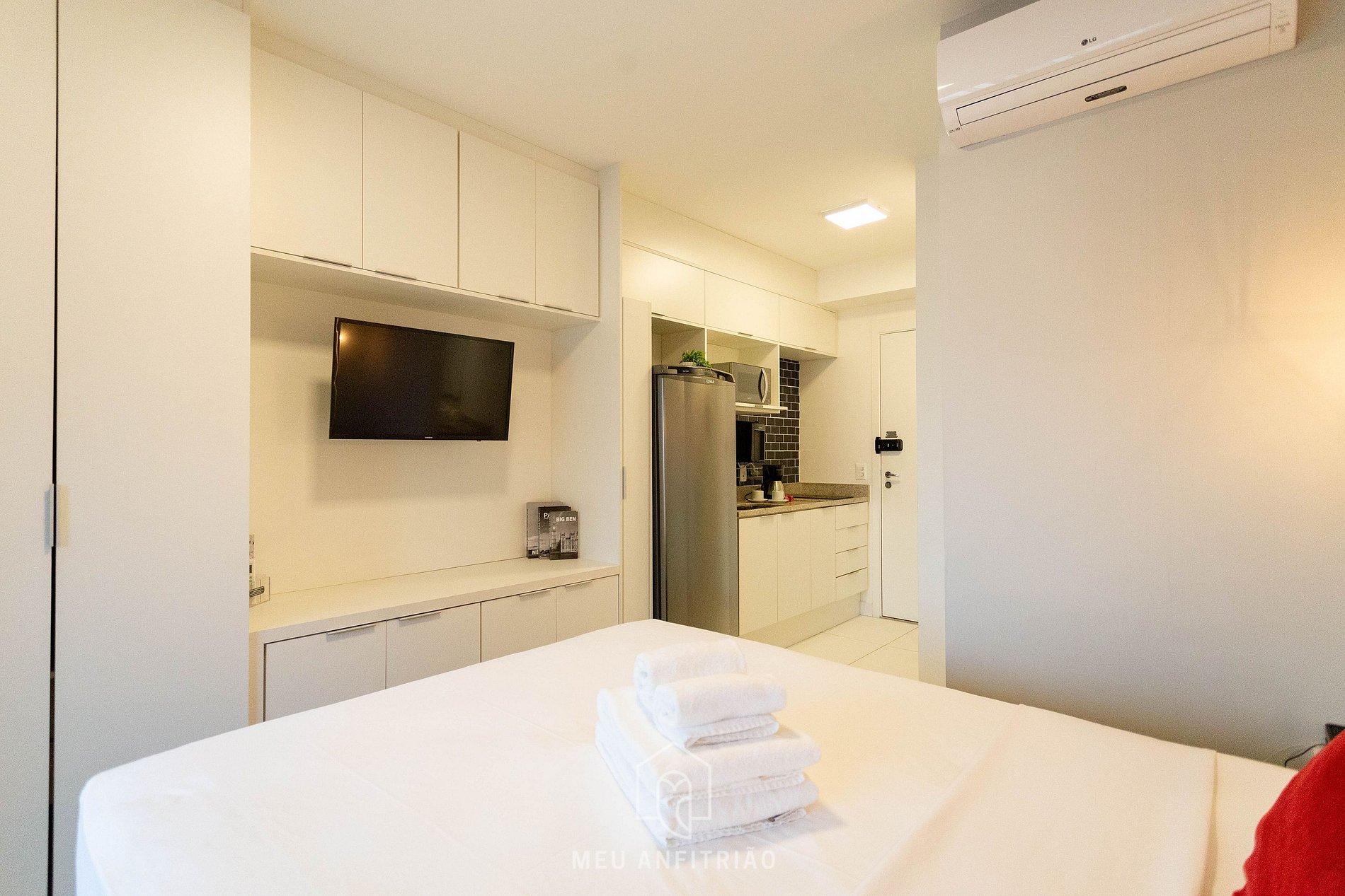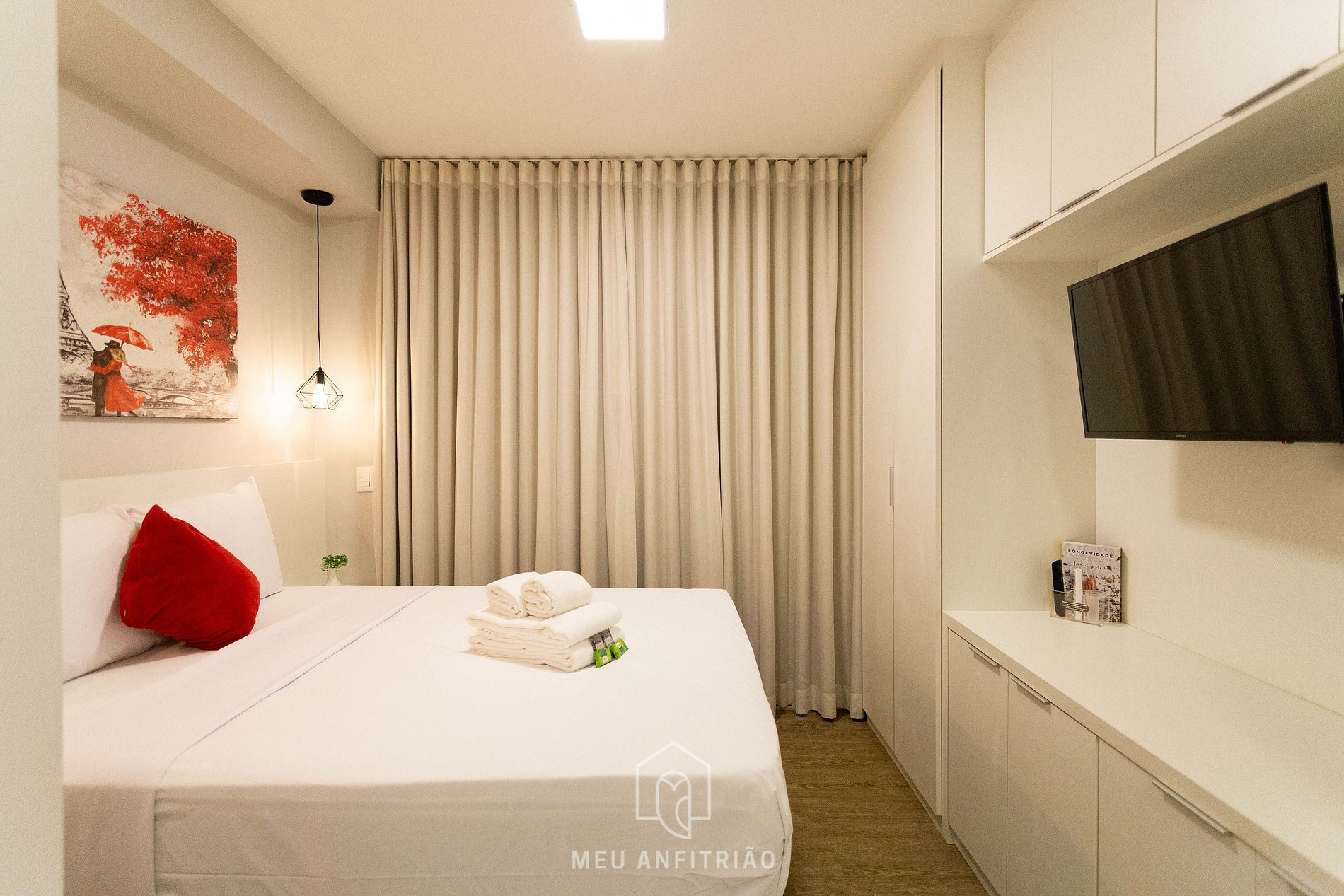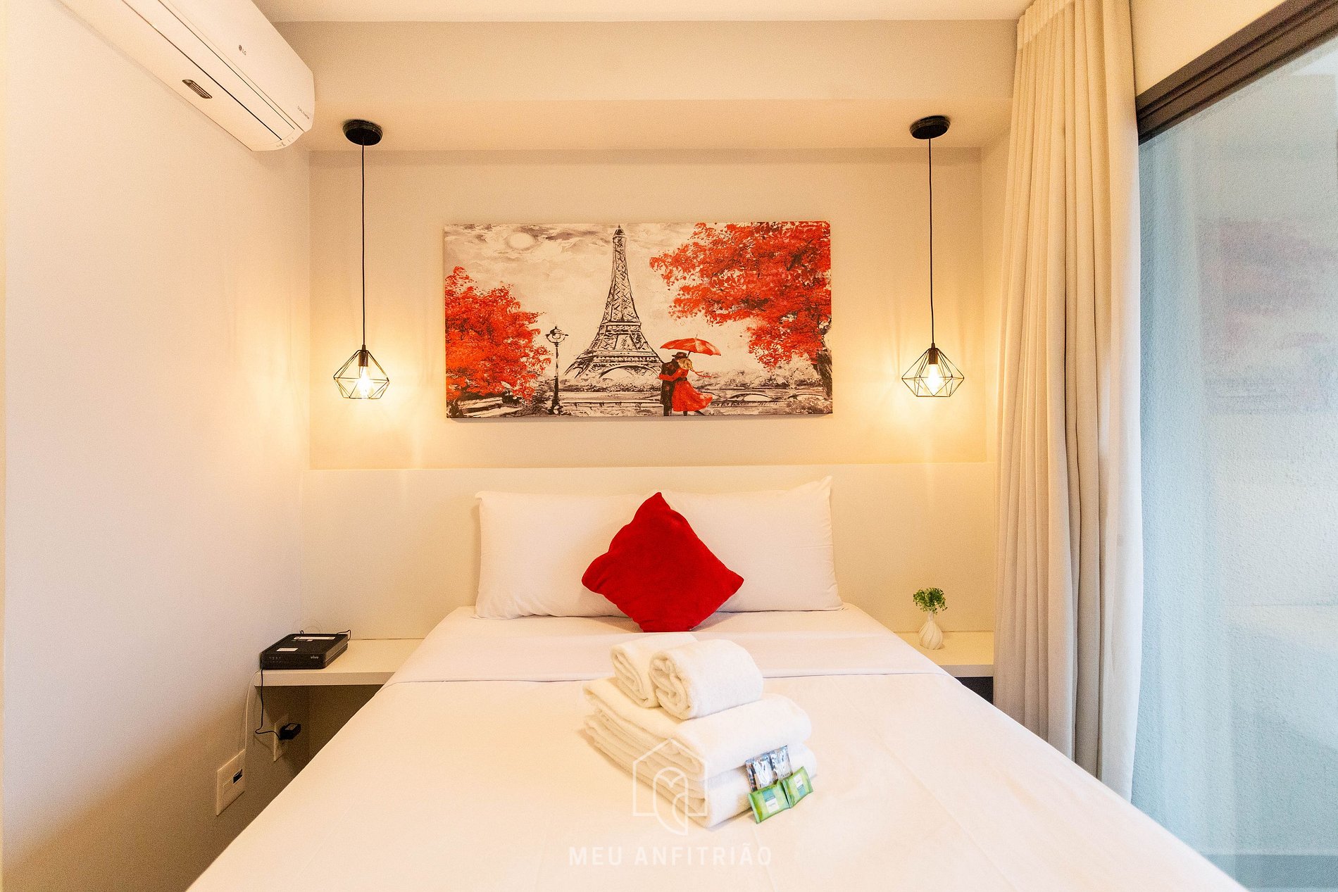 Nosso studio possui 25m² e acomoda até 2 pessoas em uma cama de casal. Estamos situados em um condomínio com área de lazer completa e portaria presencial 24h.