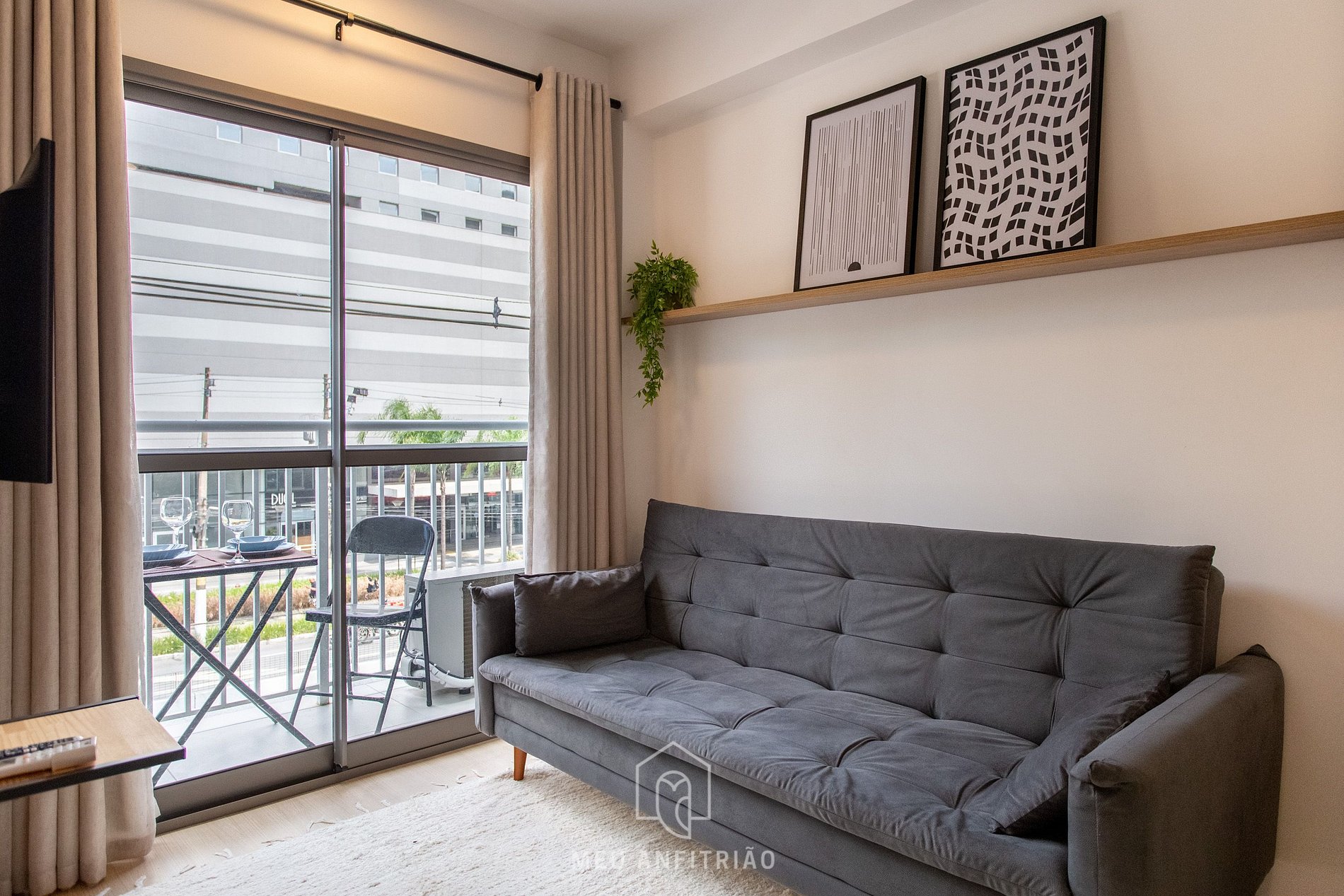 O ambiente do studio é em conceito aberto e acomoda até 3 pessoas em cama de casal e sofá-cama.