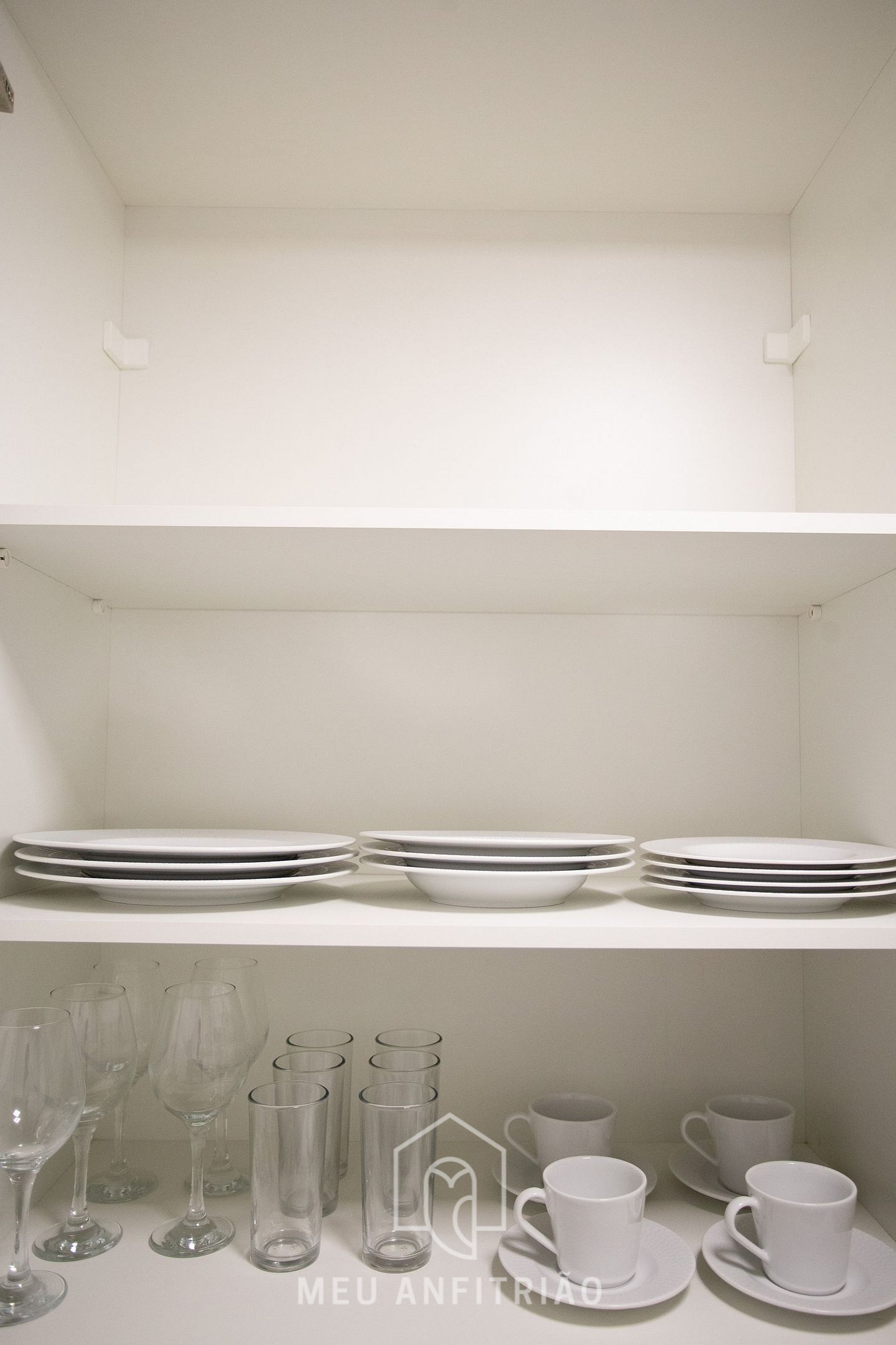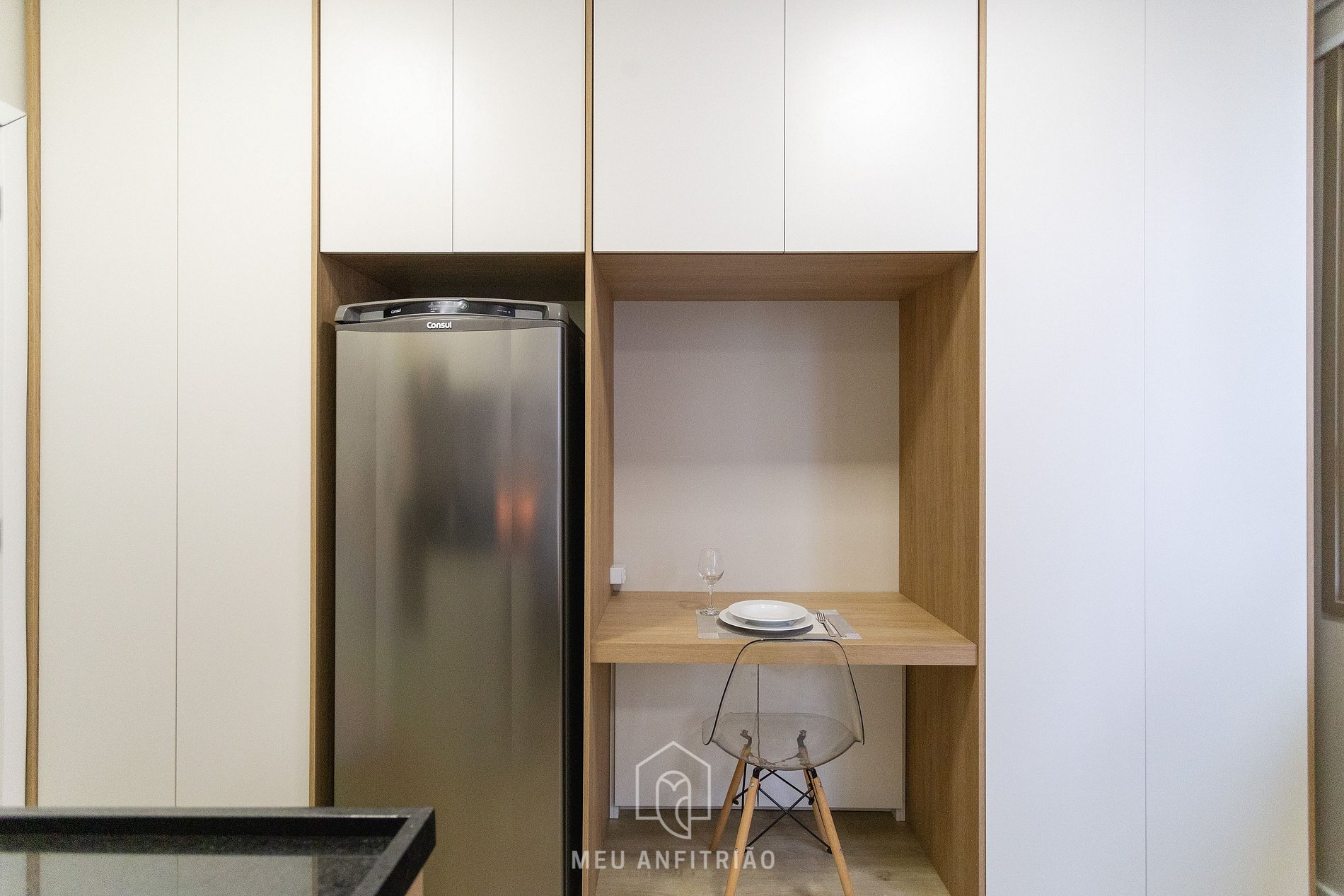 Ao entrar no studio, o hóspede terá acesso à cozinha, que conta com os utensílios necessários para uma estadia prática, como geladeira, fogão cooktop, micro-ondas, sanduicheira, liquidificador, cafeteira e chaleira elétricas entre outros.