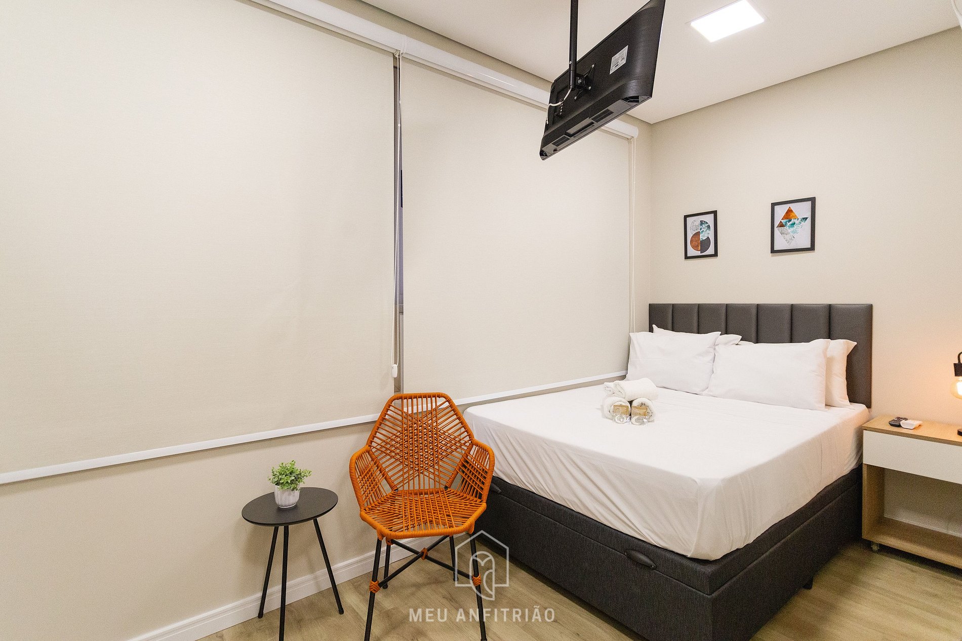 O studio conta com um espaço de 22m² e acomoda até 2 pessoas em uma cama de casal. O condomínio possui portaria presencial 24h e área de lazer.