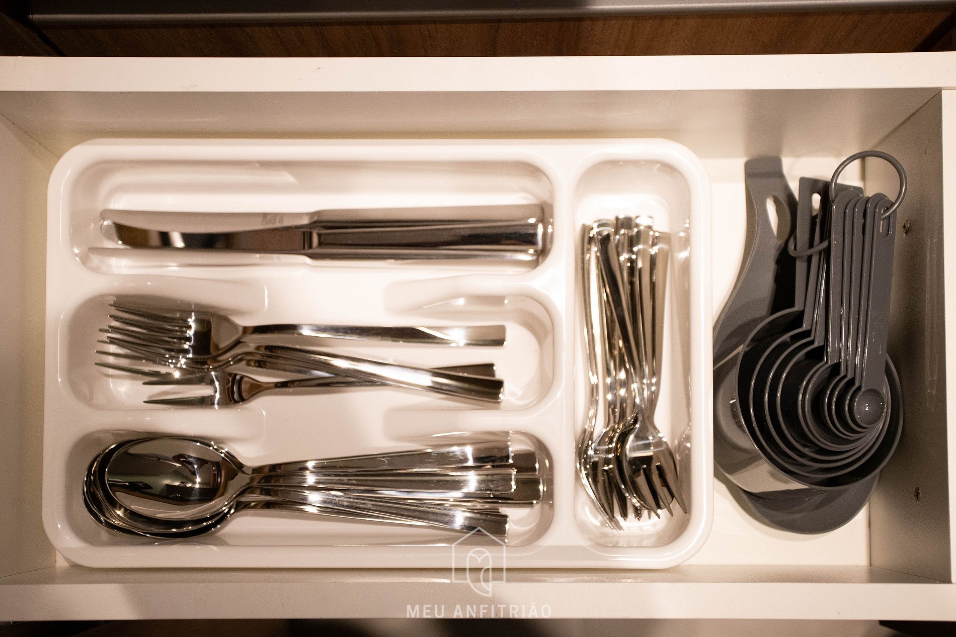 Entrando no apartamento, o hóspede terá acesso à sala de estar, que conta com um sofá com bicama e TV Smart. Ao lado, temos uma cozinha completa com geladeira, fogão cooktop, micro-ondas, cafeteira elétrica, filtro d’água entre outros. O quarto dispõe de uma cama de casal e guarda-roupas.