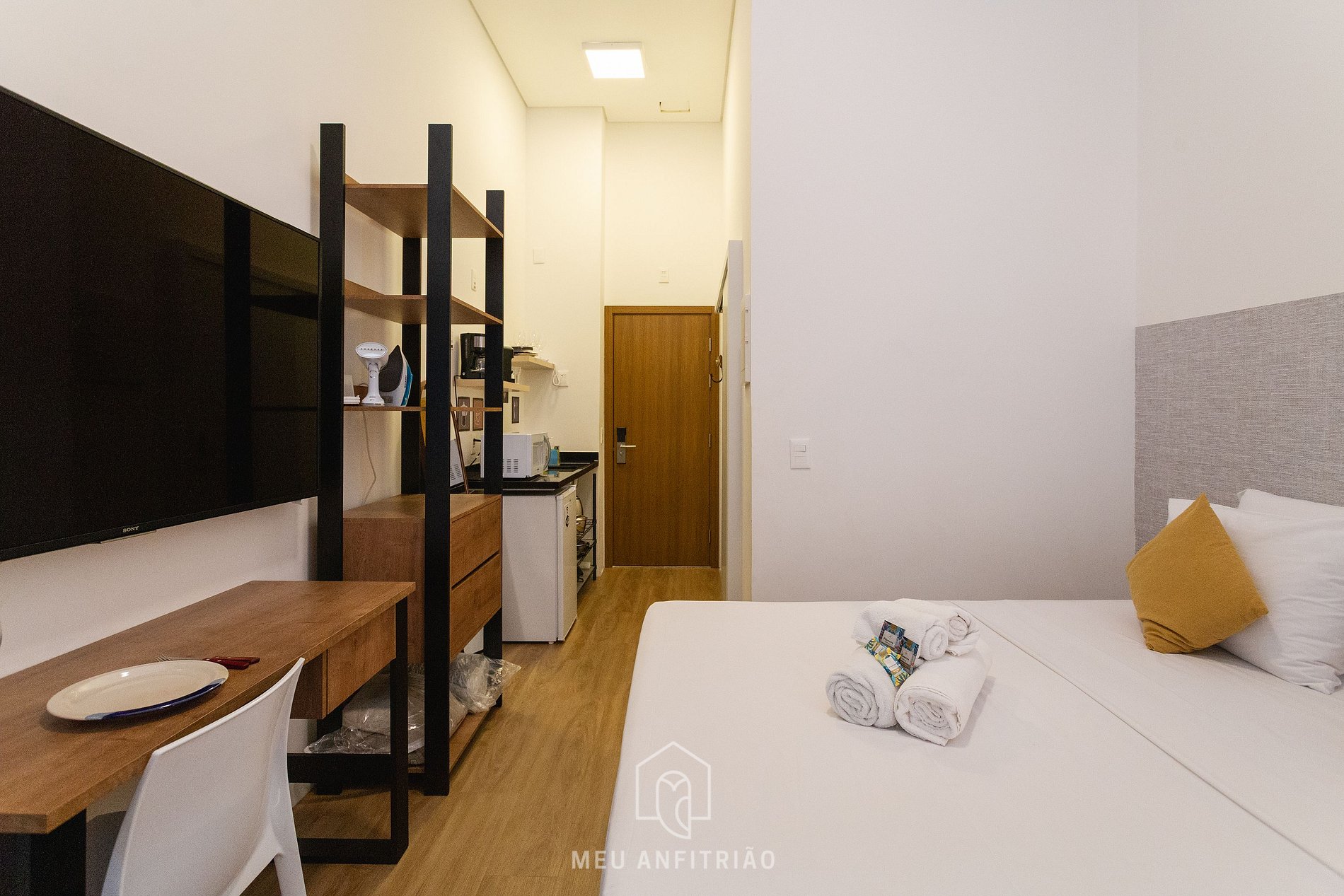 Ao entrar no studio, o hóspede estará na cozinha, que é equipada com os itens necessários para uma estadia confortável, como frigobar, fogão cooktop, micro-ondas, cafeteira e chaleira elétricas, liquidificador, cafeteira de cápsulas entre outros. A varanda divide os espaços através de uma porta de vidro com persianas e conta com vista para a cidade.